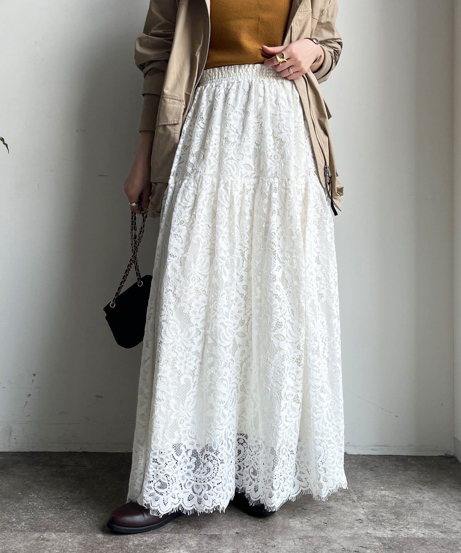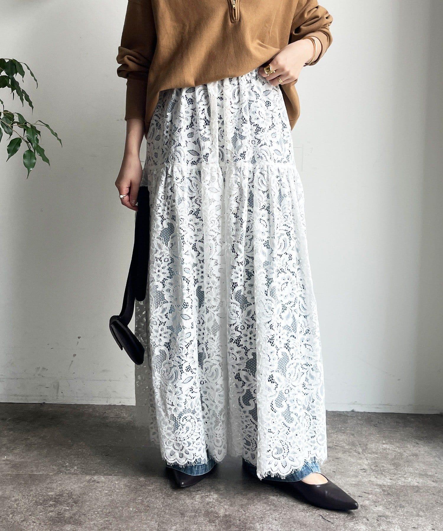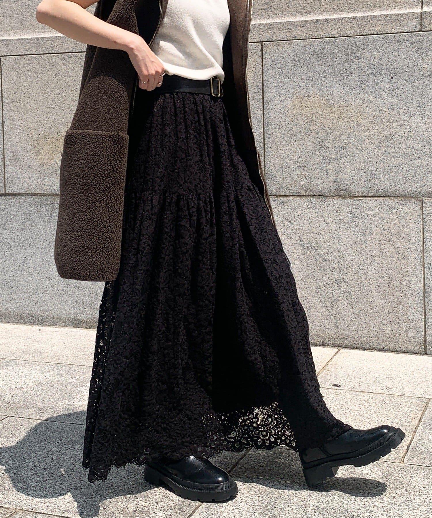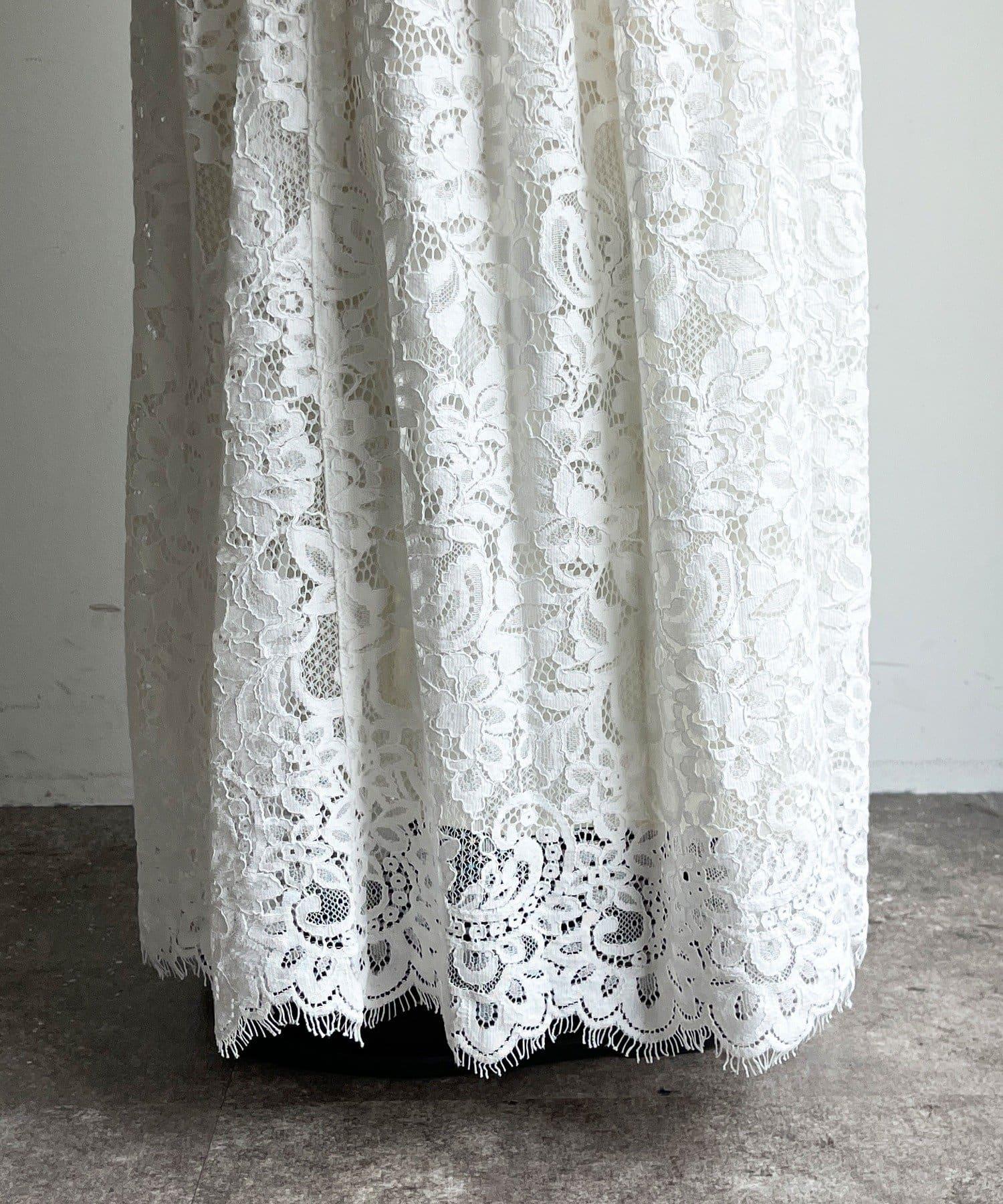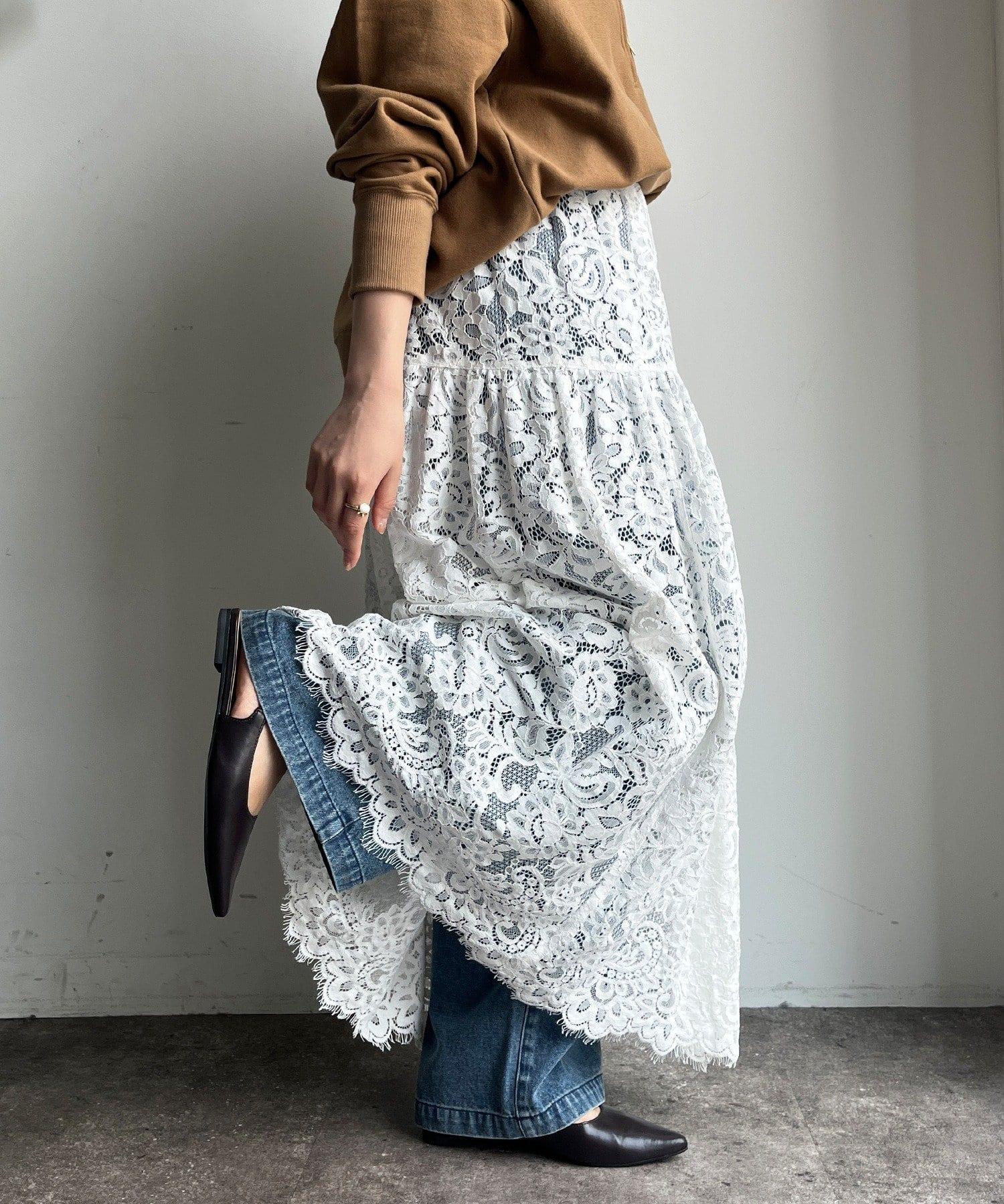 大量蕾絲面料製成的喇叭裙。