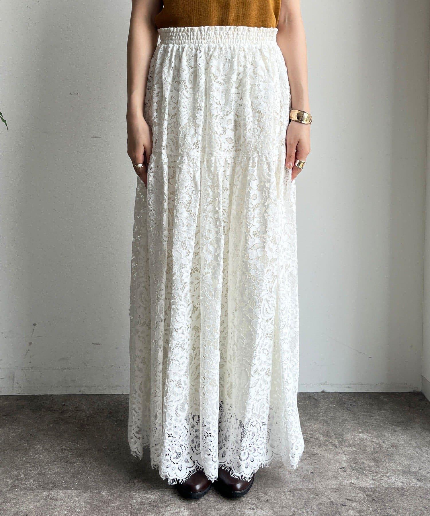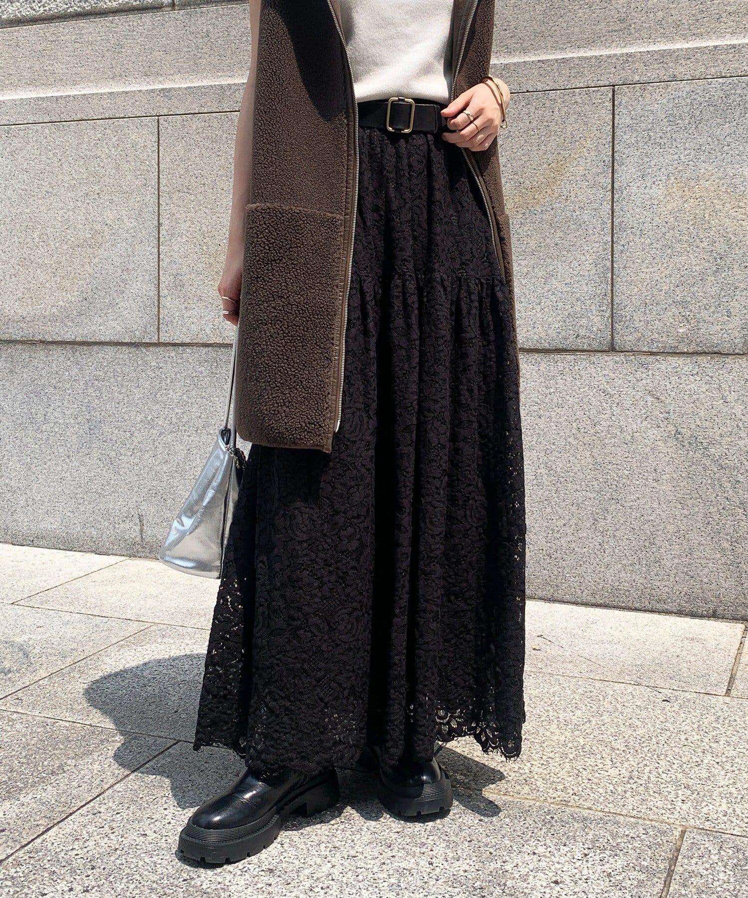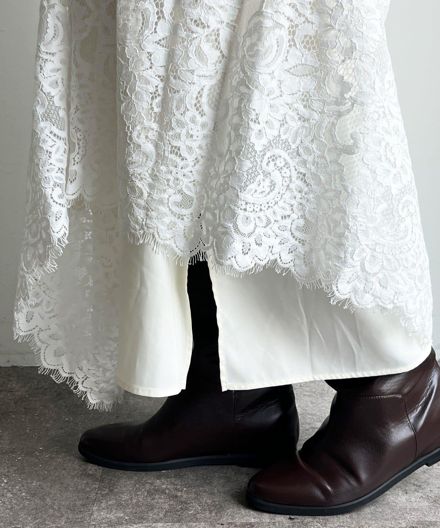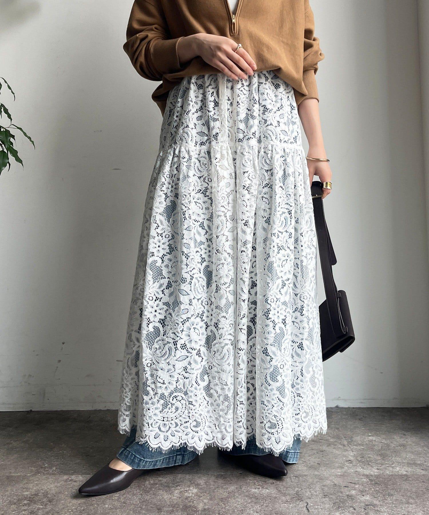 大量蕾絲面料製成的喇叭裙。