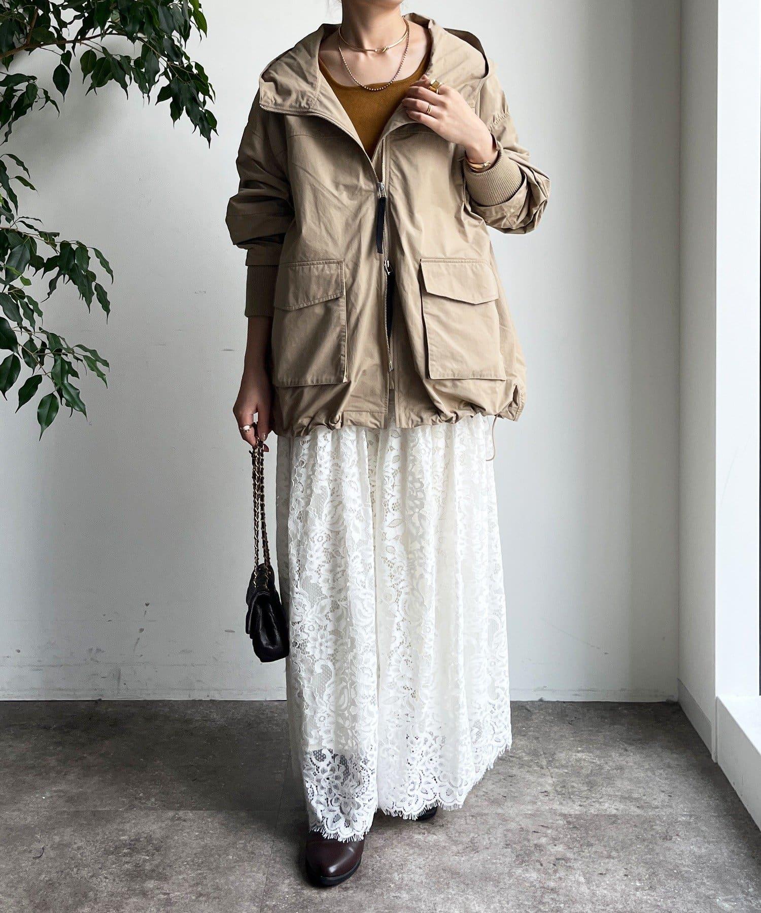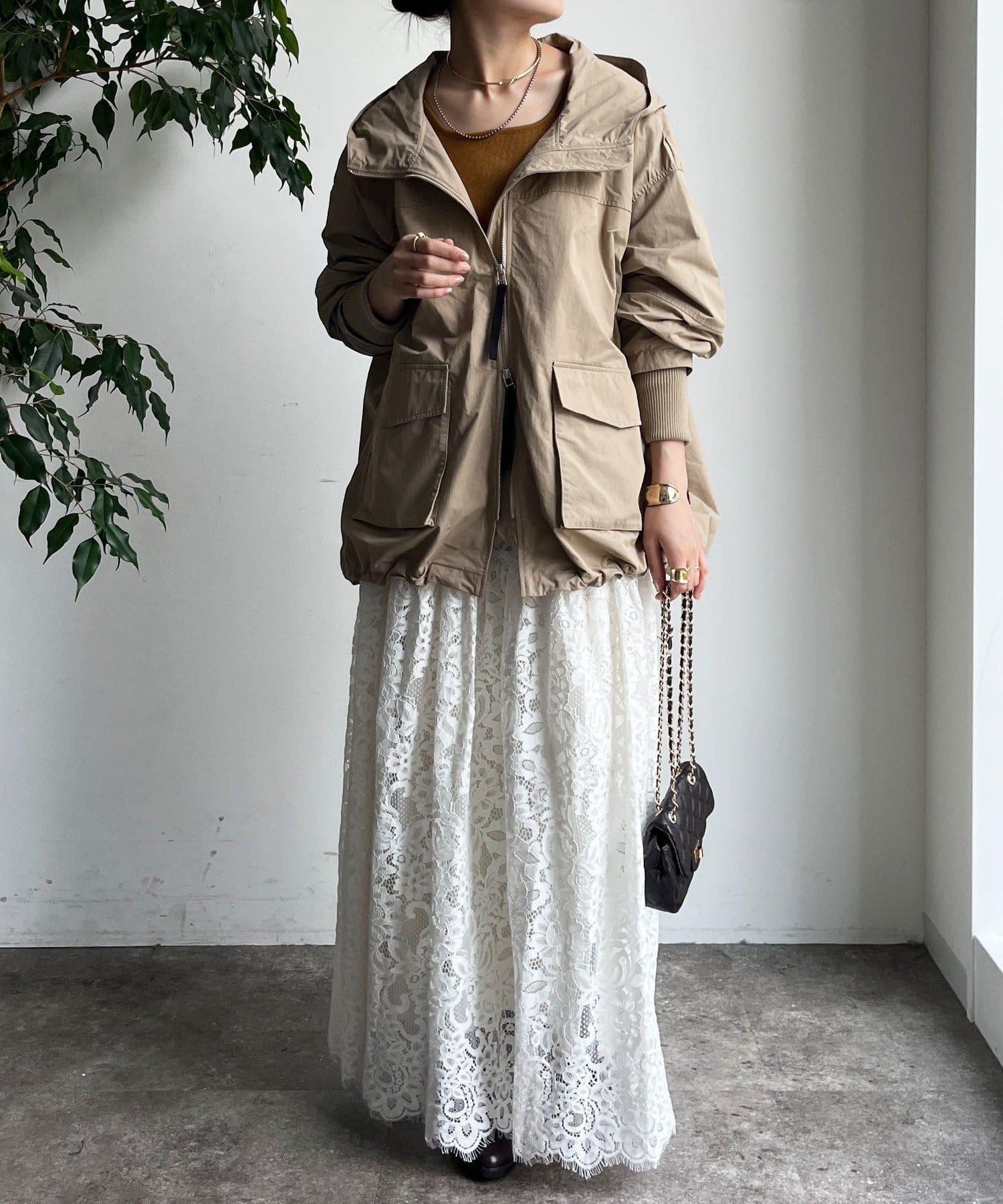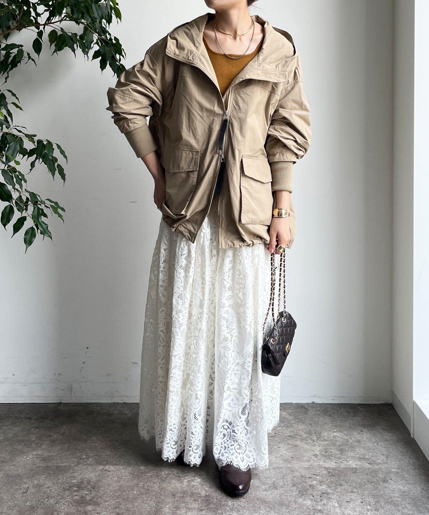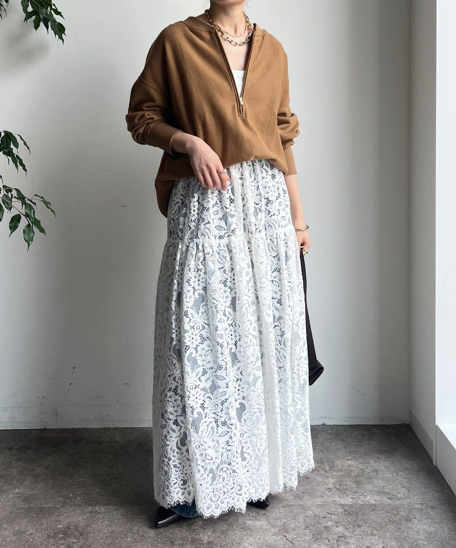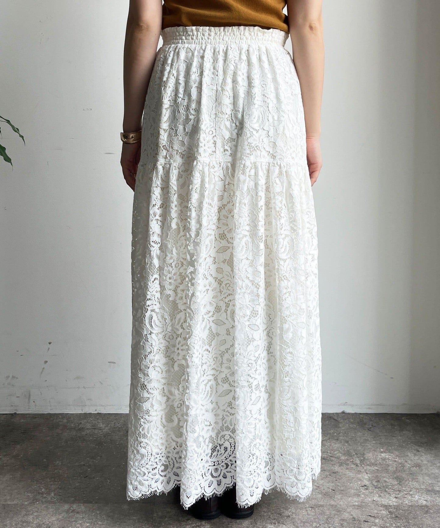 大量蕾絲面料製成的喇叭裙。