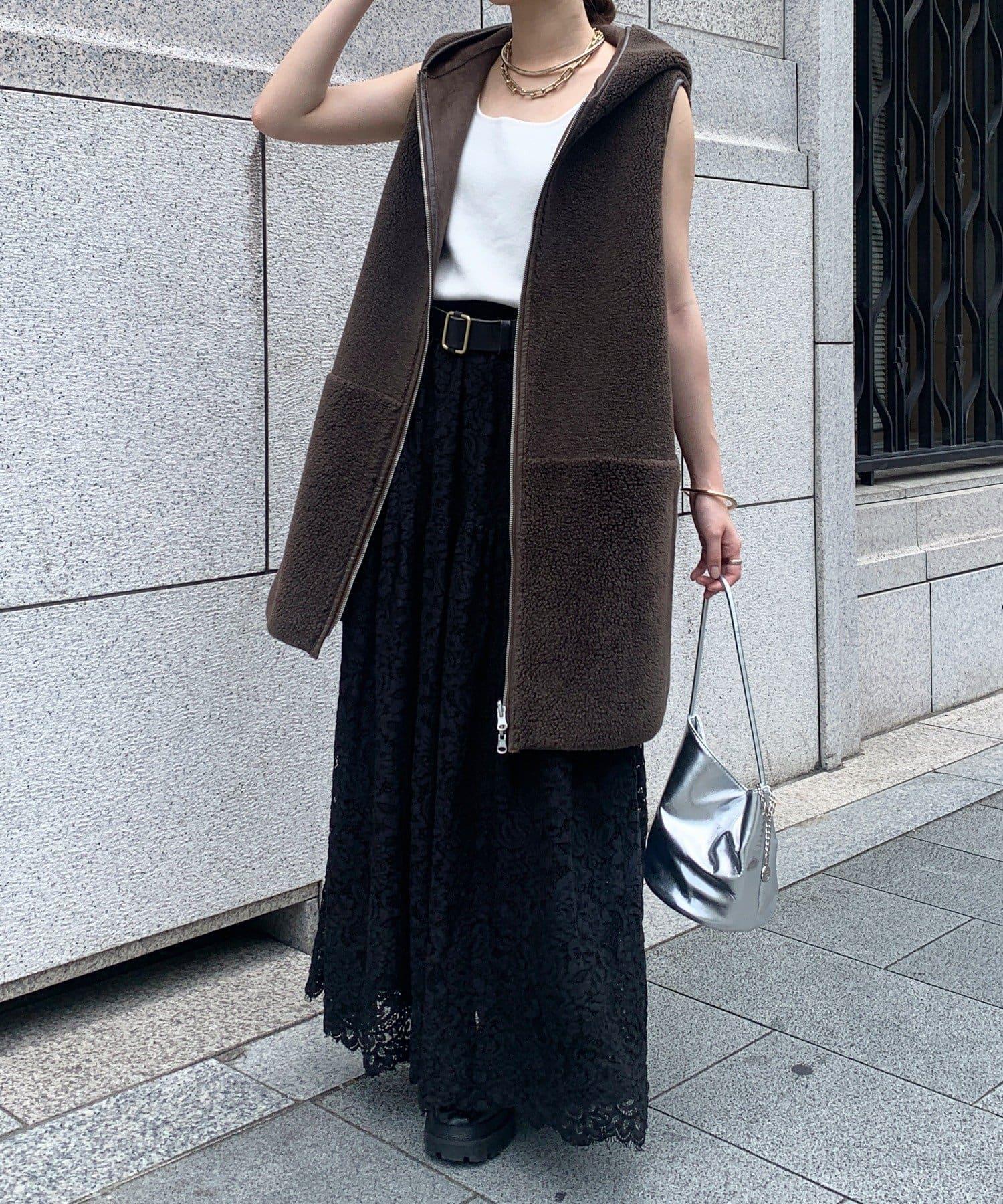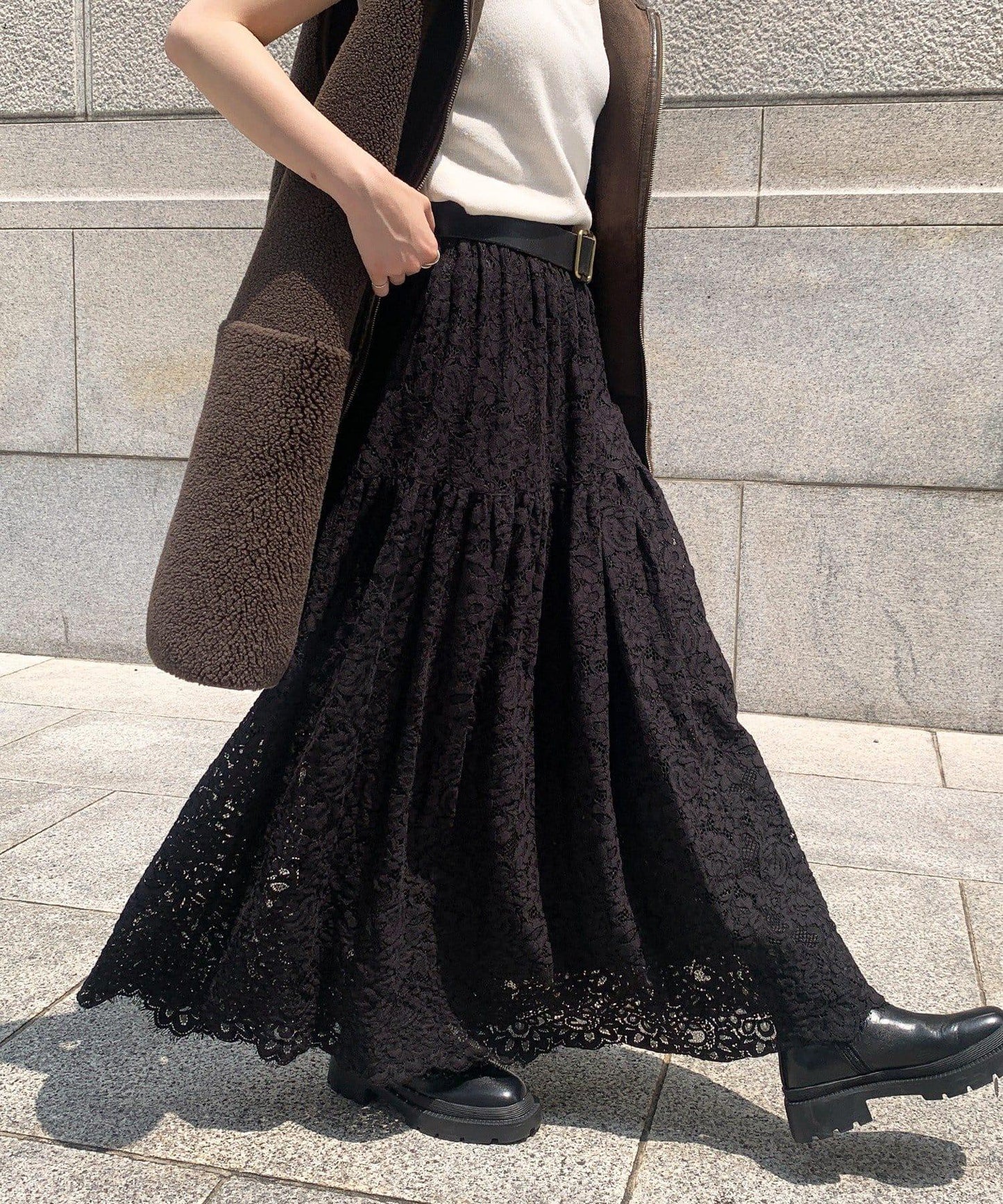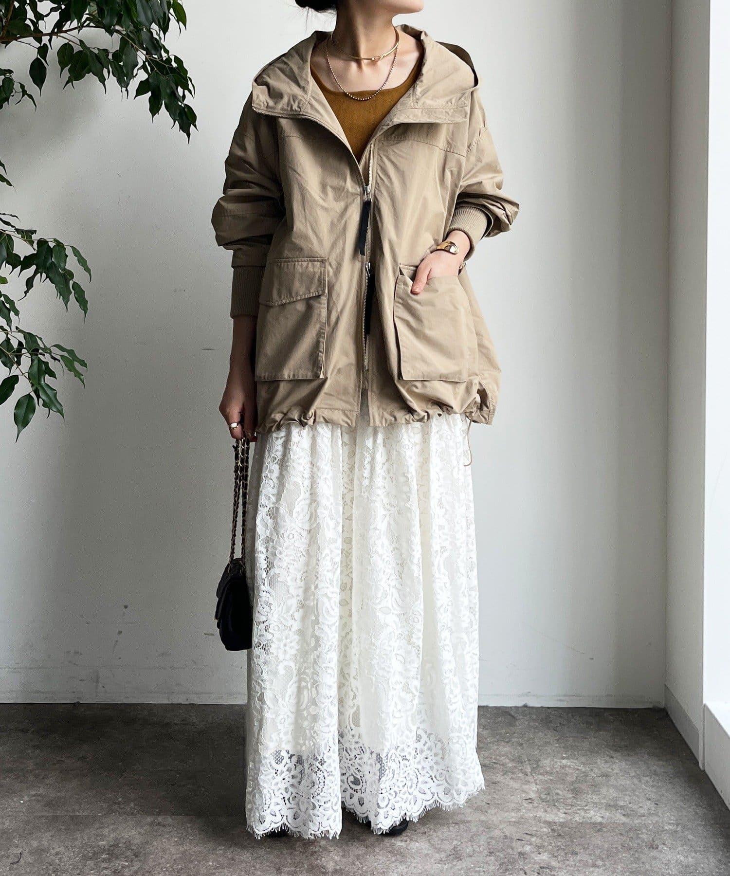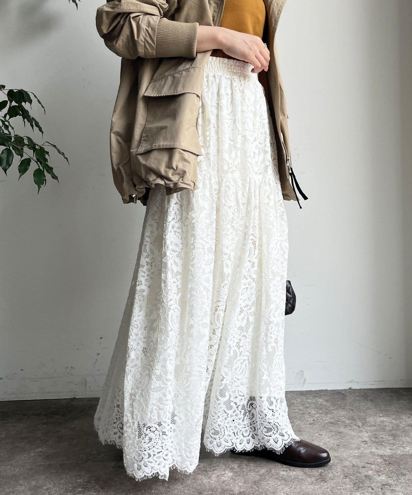 大量蕾絲面料製成的喇叭裙。