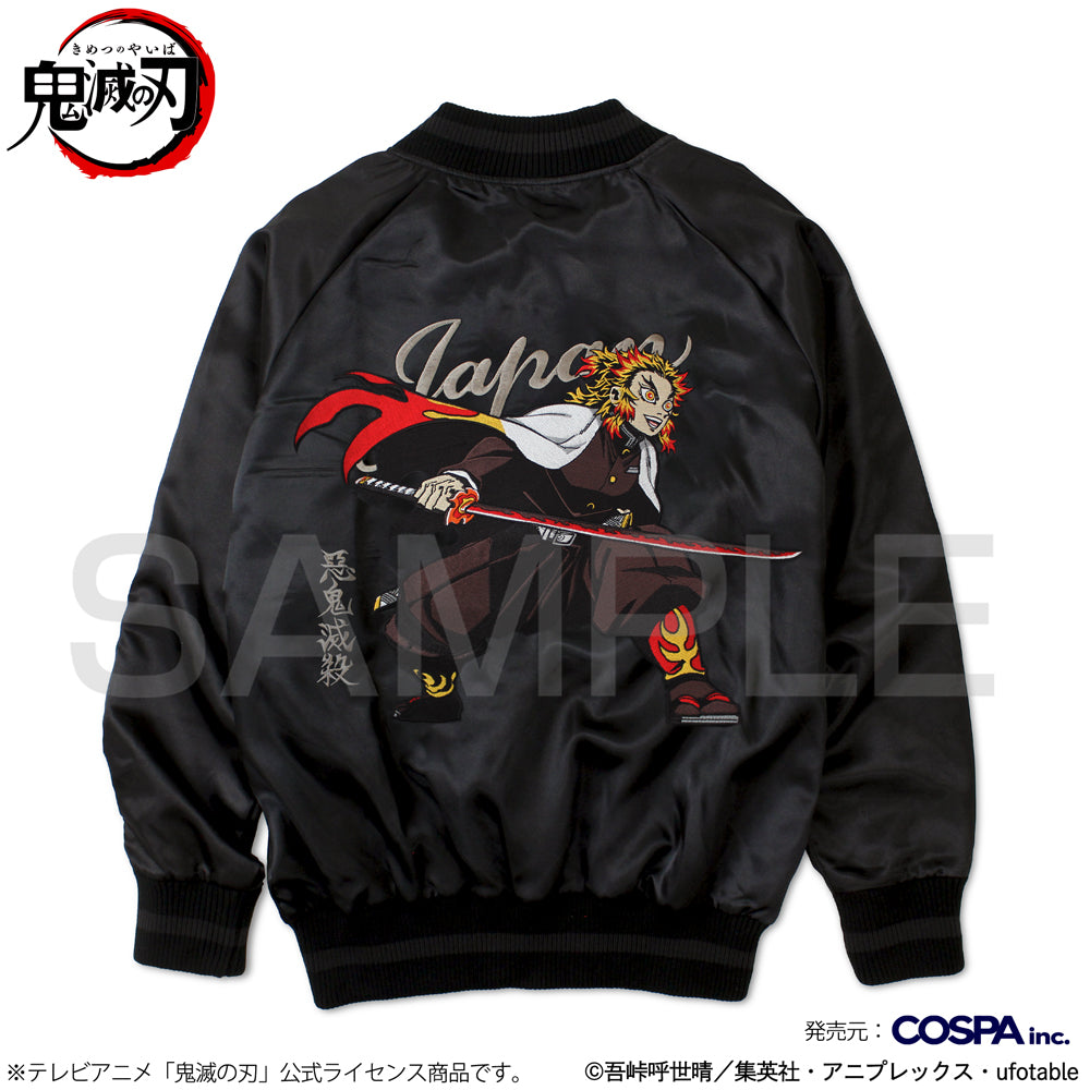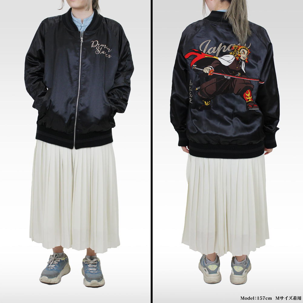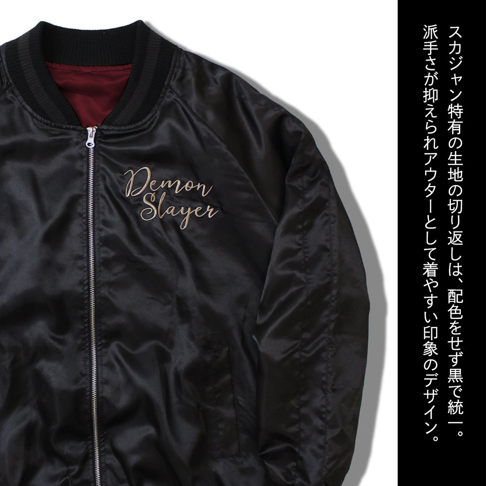 突出人物的刺繡設計具有復古味道,與鬼之刃的世界觀相吻合。筆直的 "JAPAN "字母也是 Sukajan 的典型設計。