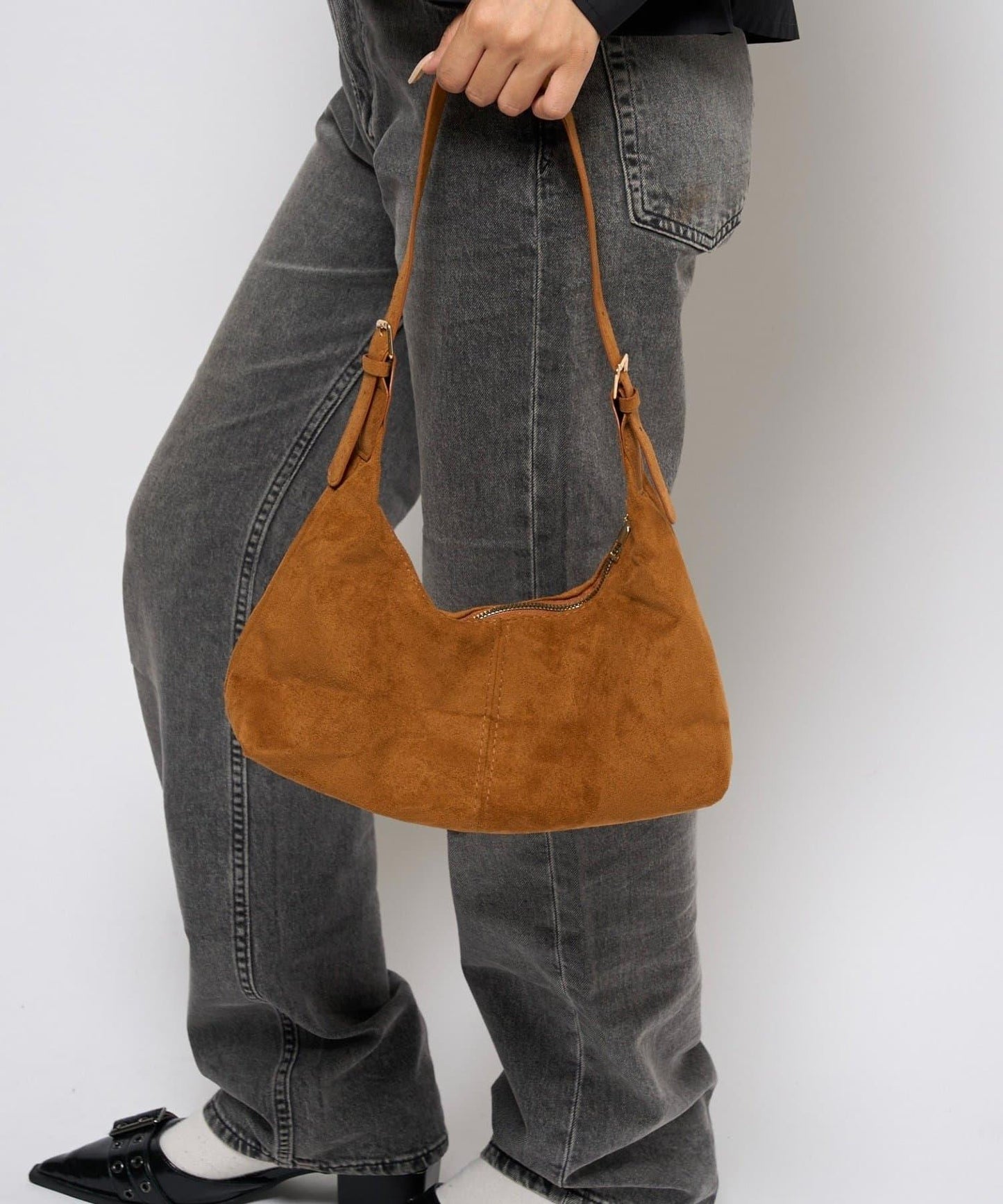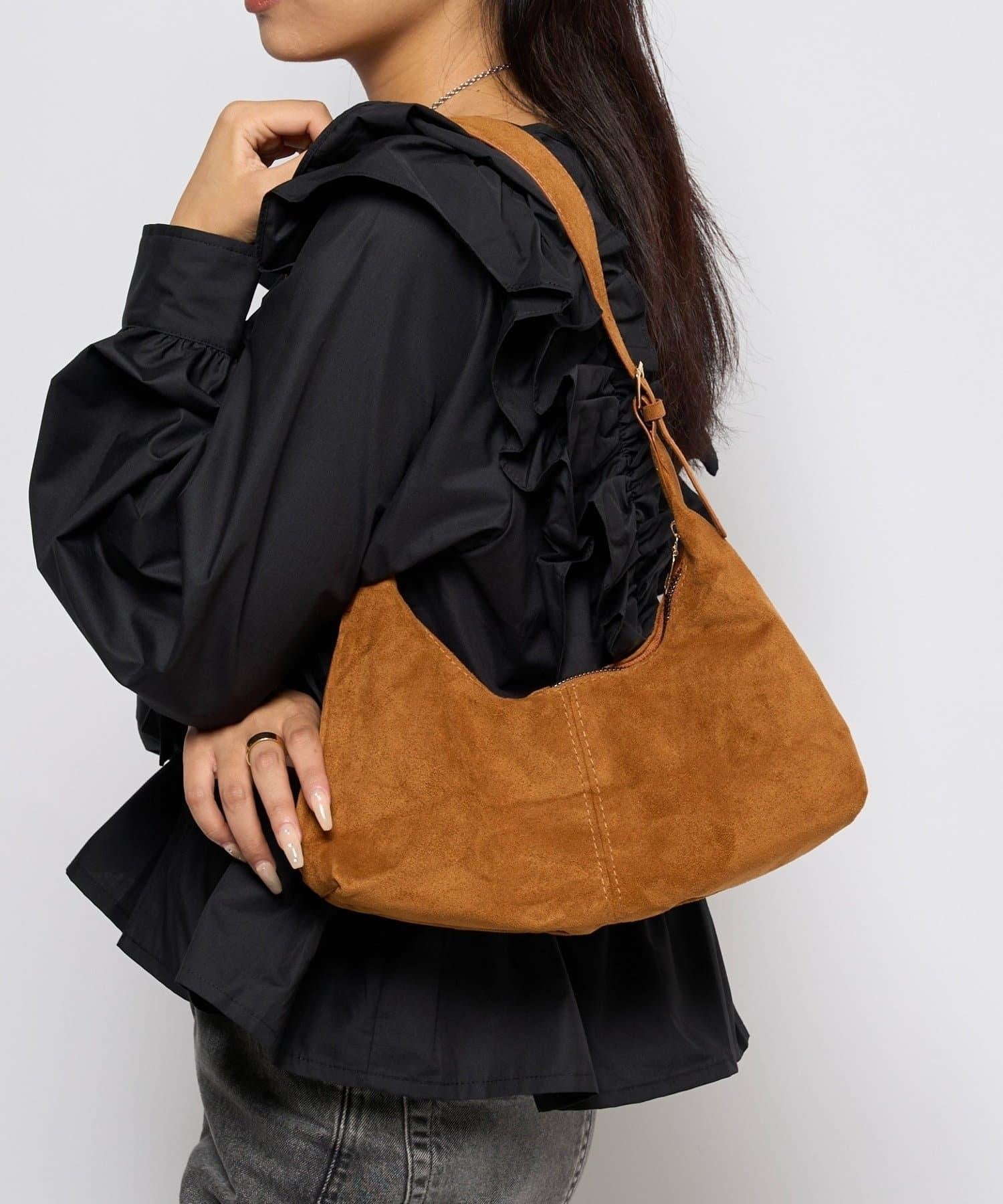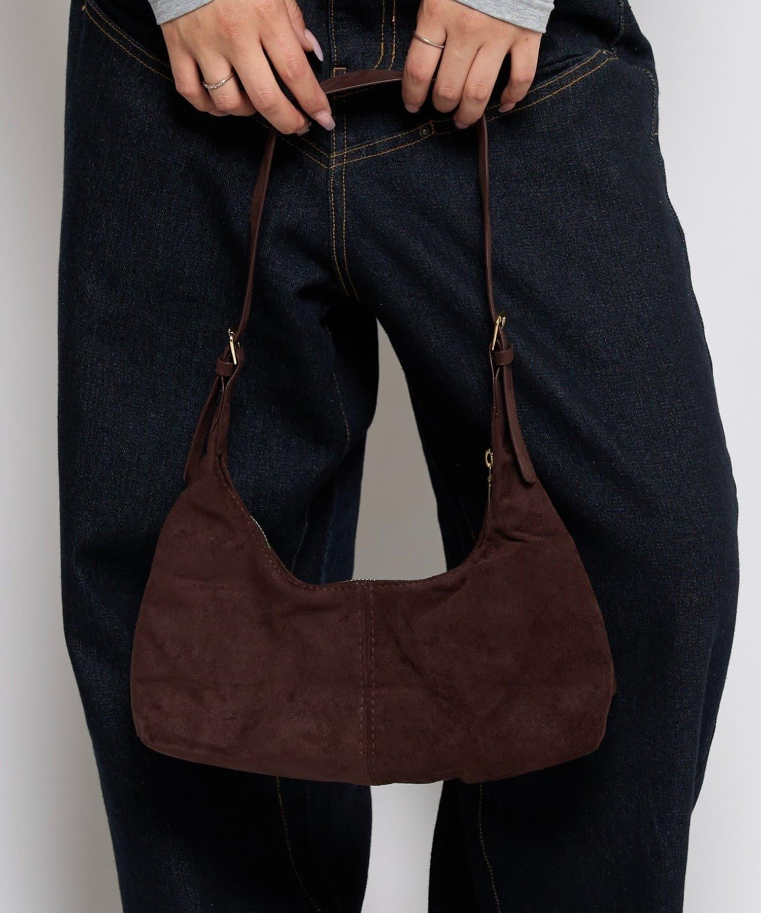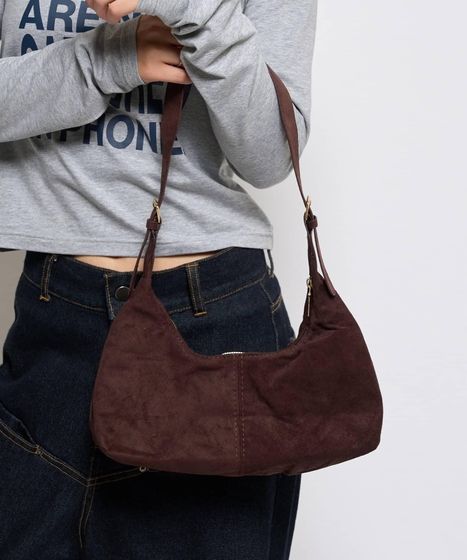 這款迷你單肩包採用麂皮製成,手感柔軟。
