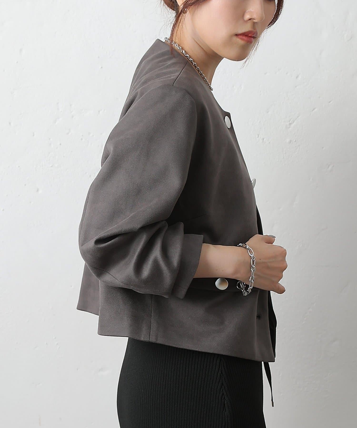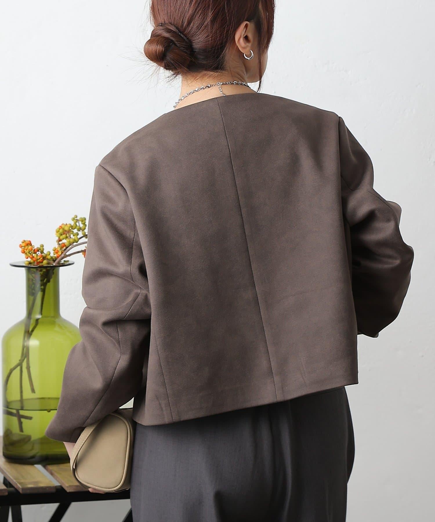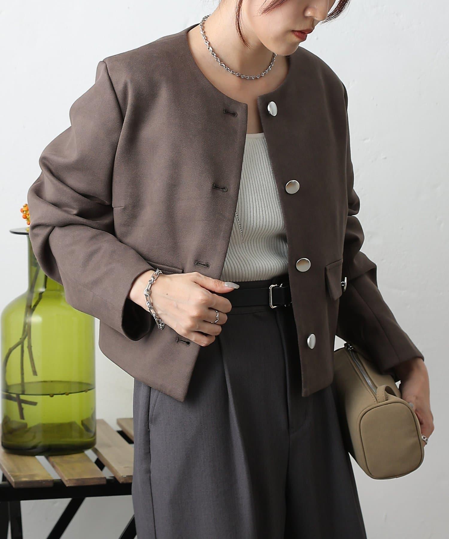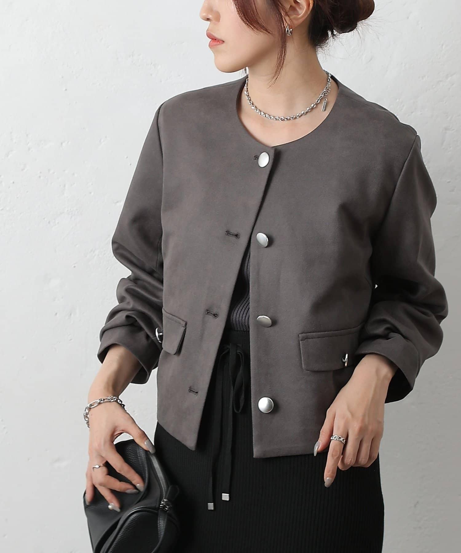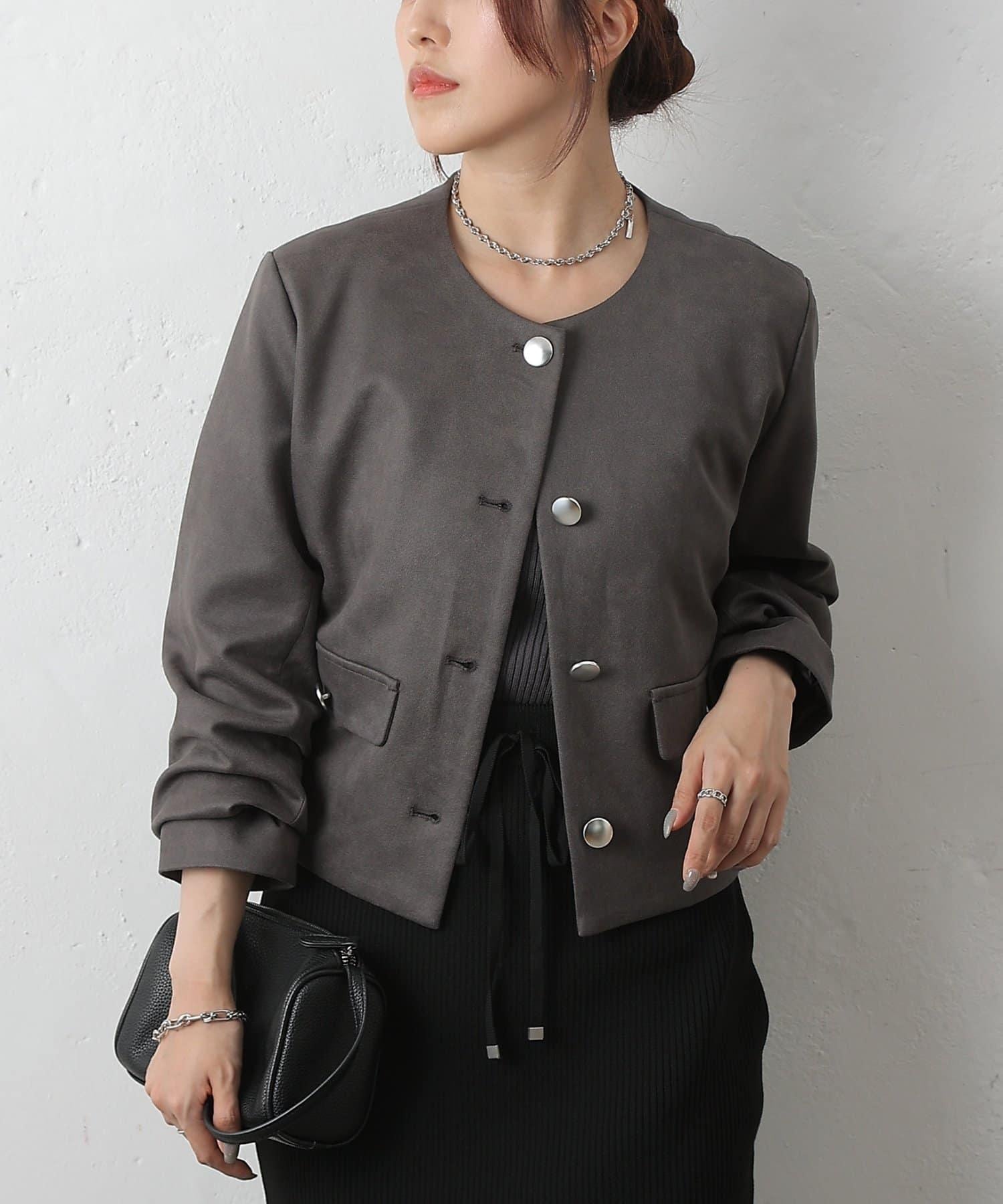 這款優雅的無領夾克採用麂皮絨面料製成,質地溼潤,回彈性好。
