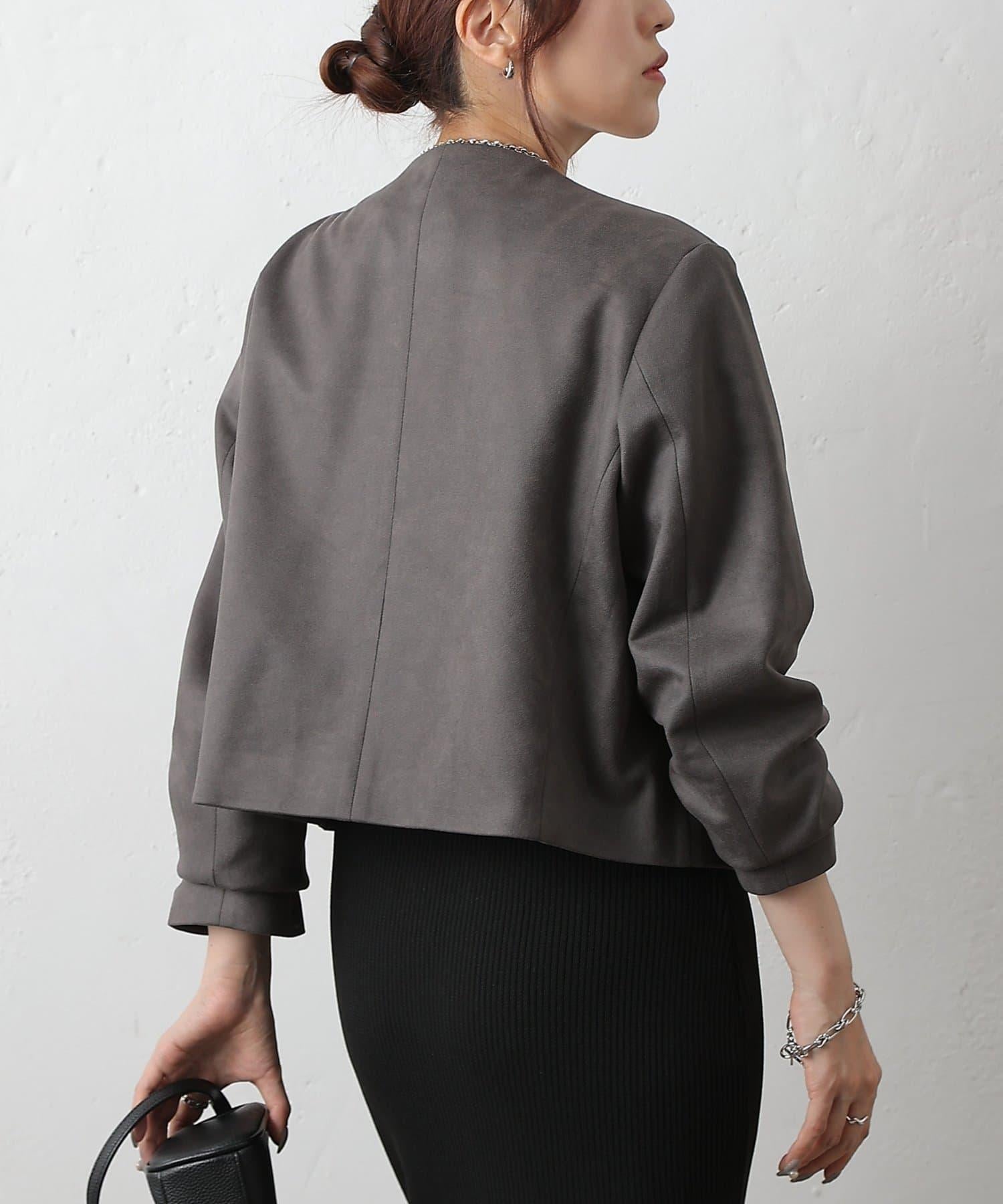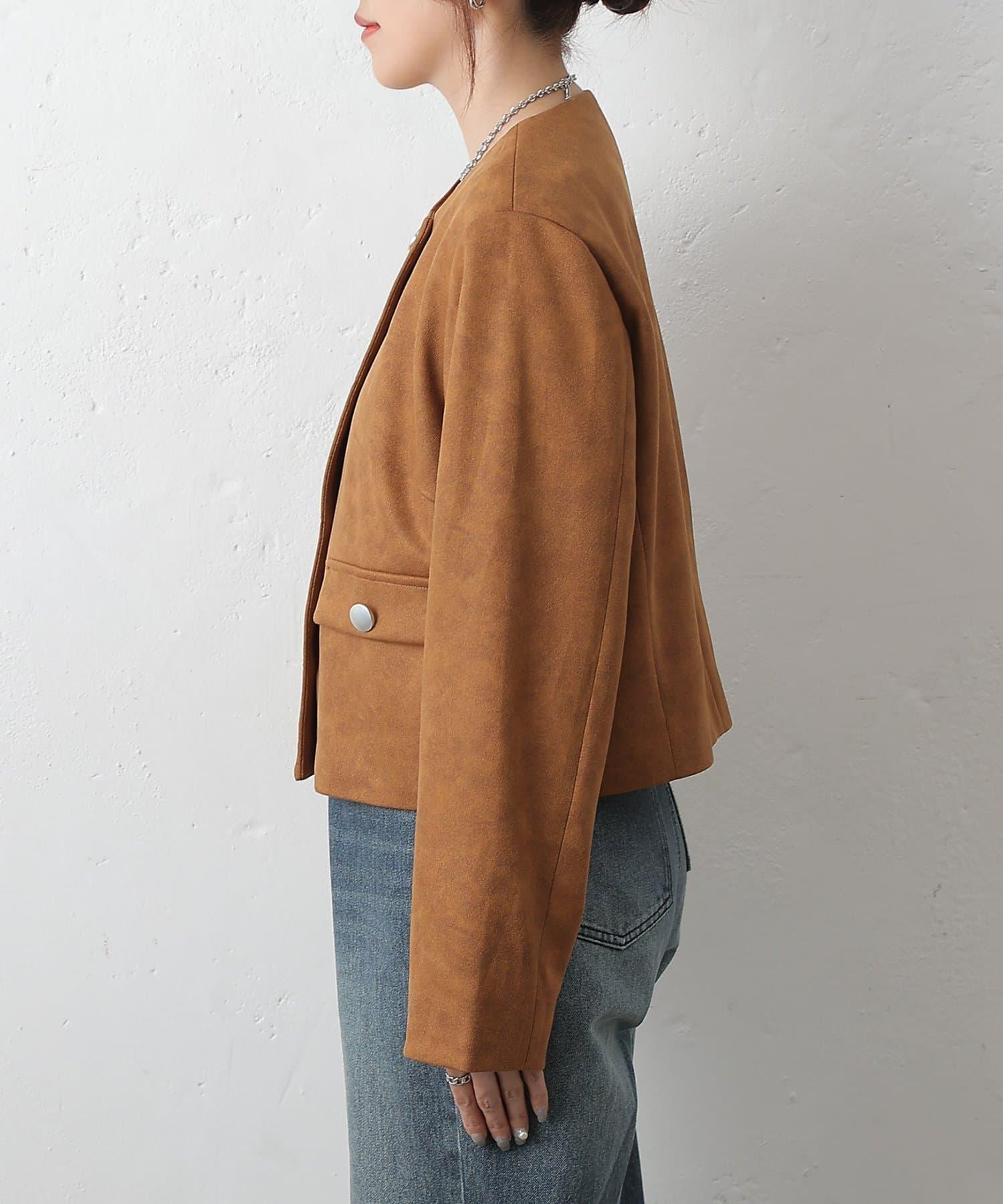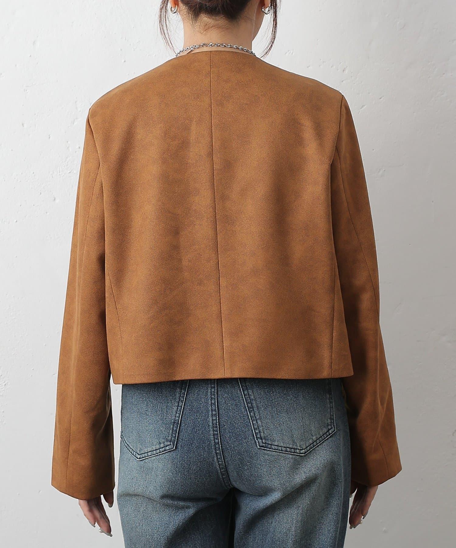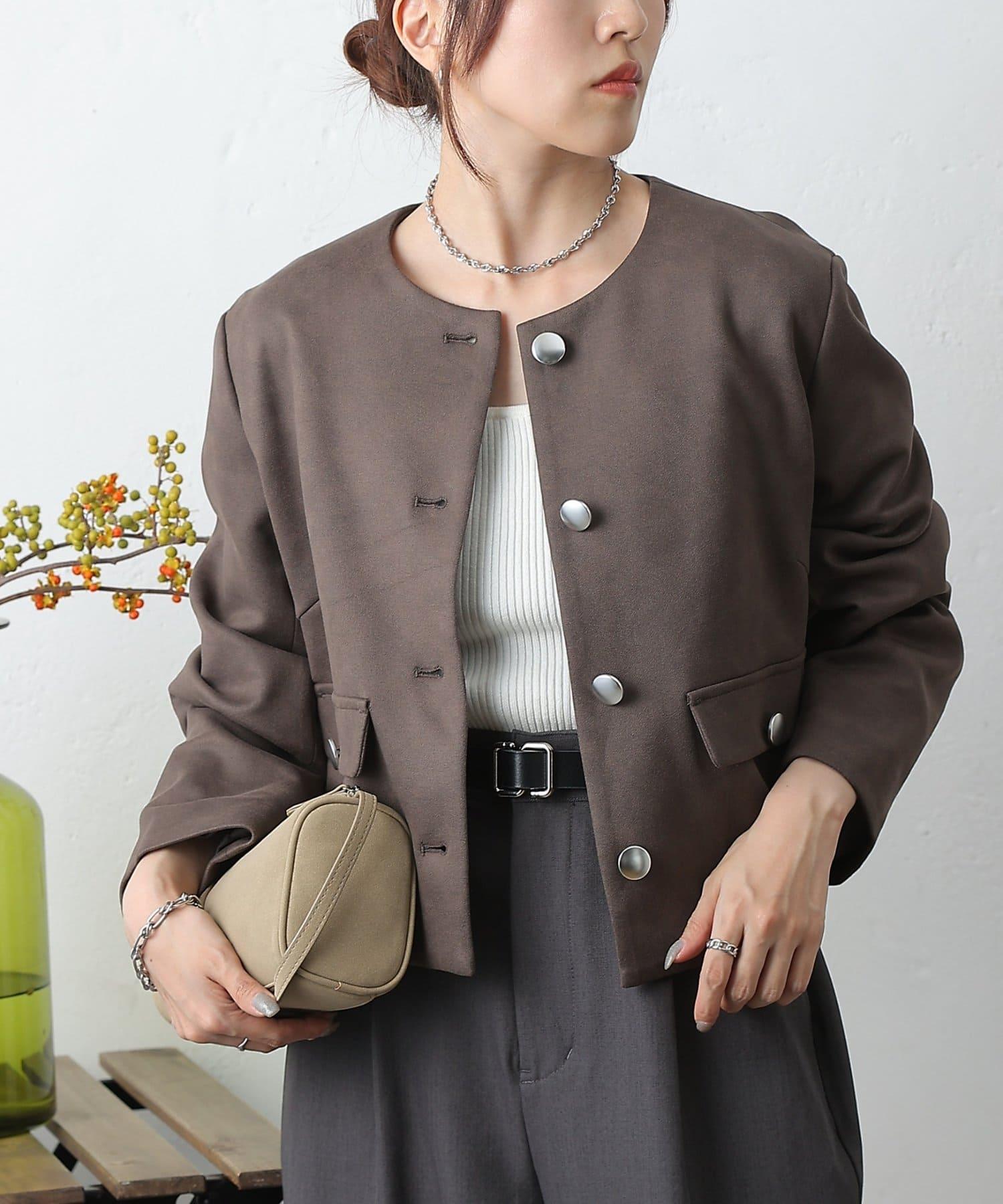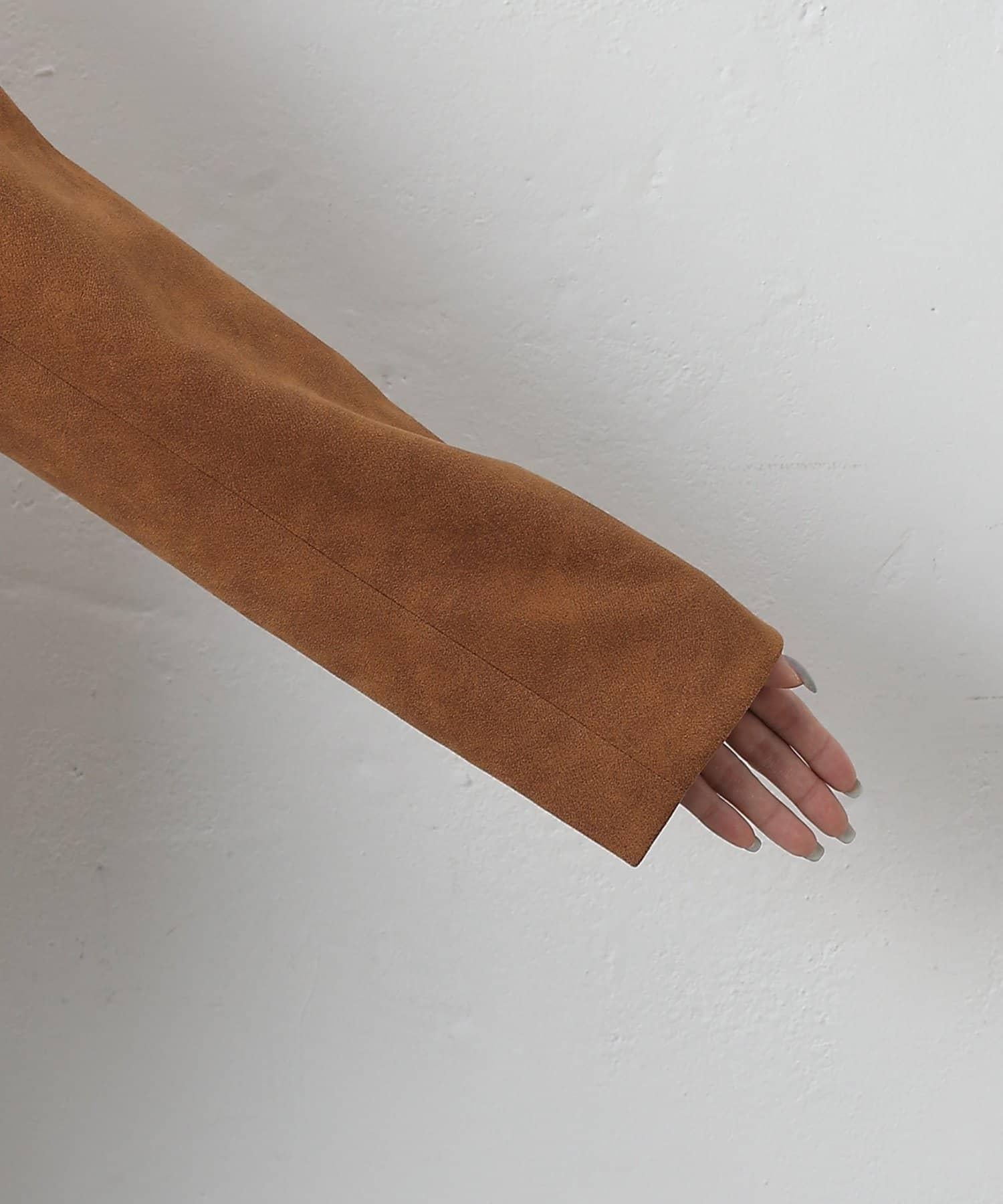 這款優雅的無領夾克採用麂皮絨面料製成,質地溼潤,回彈性好。