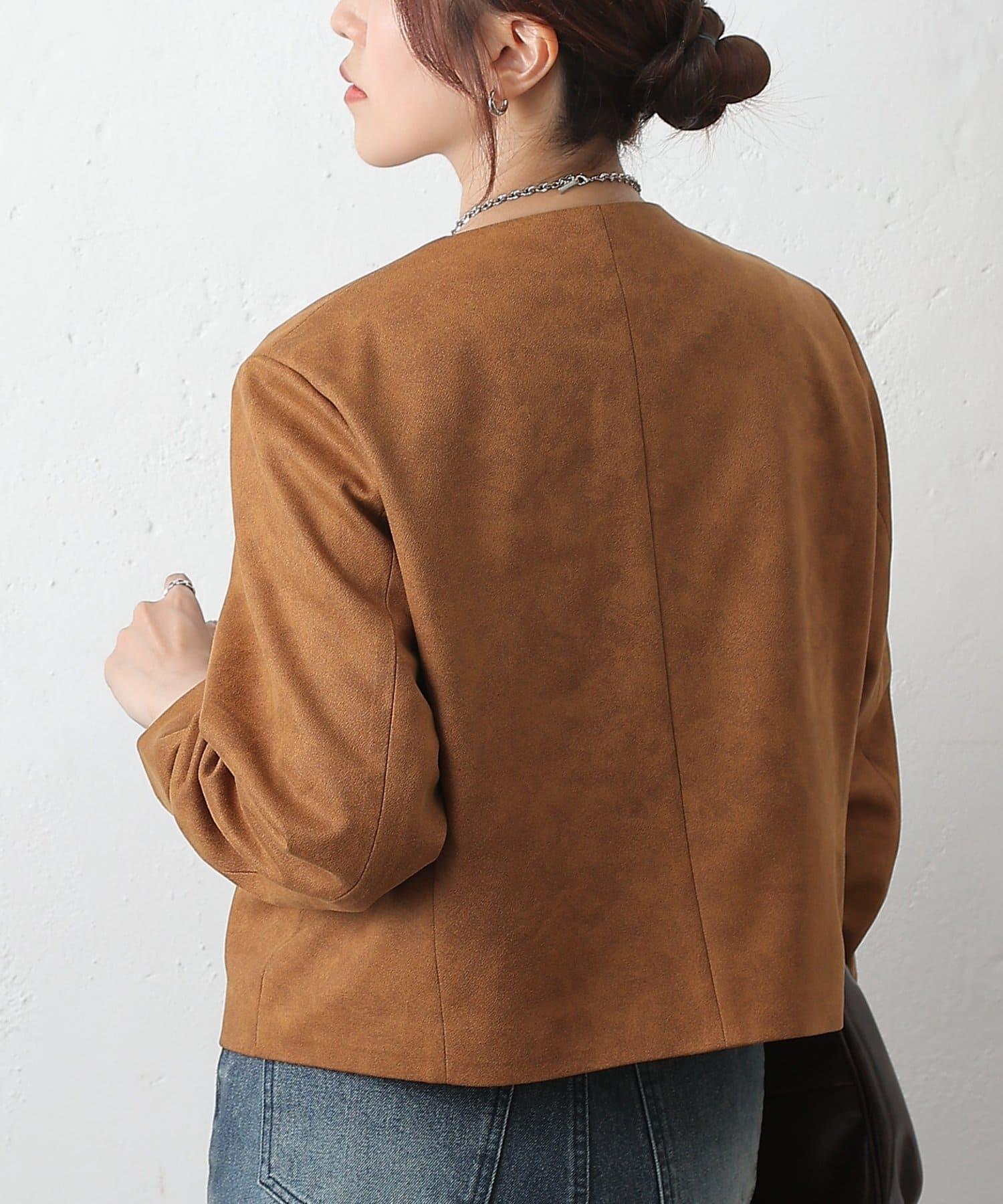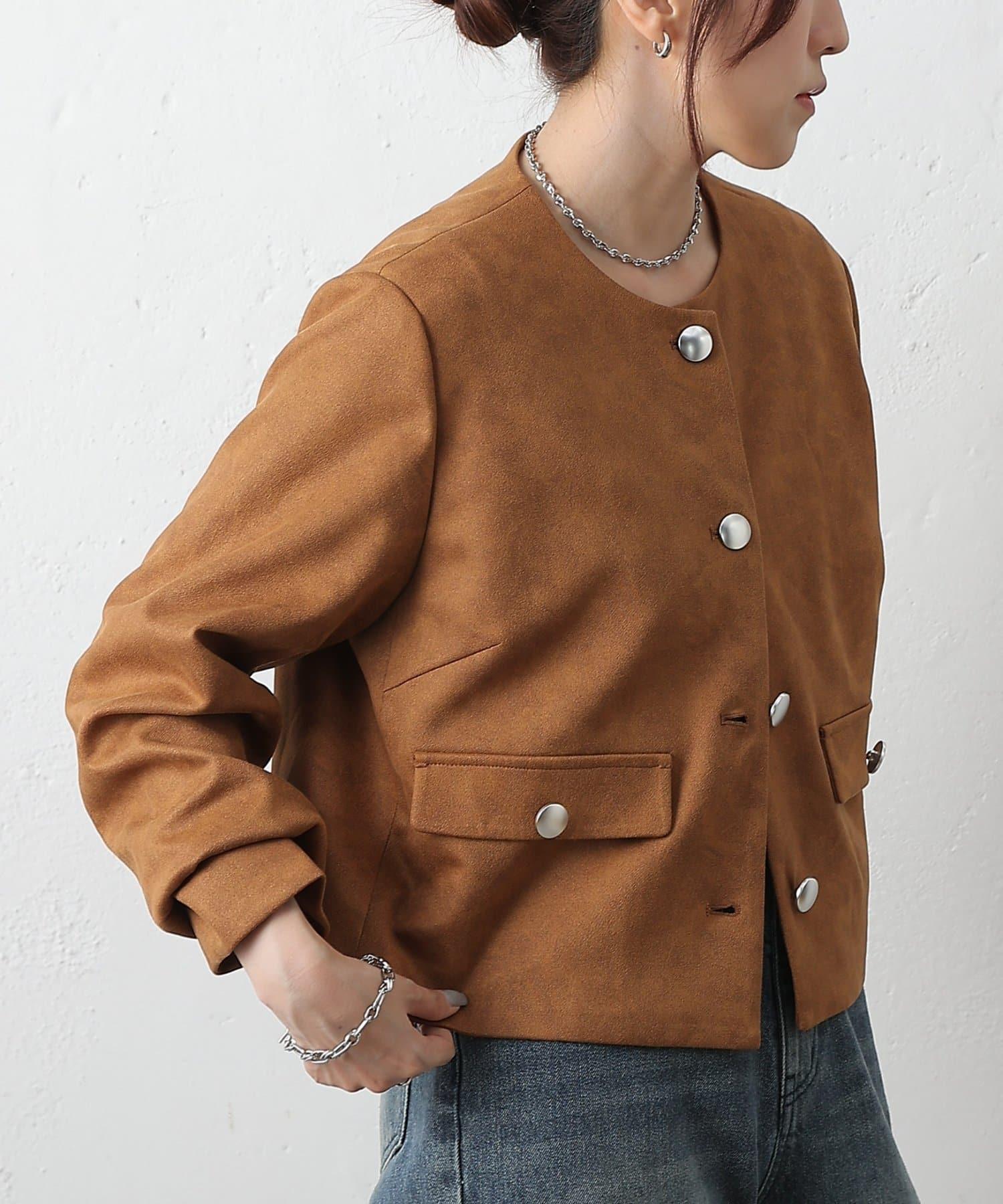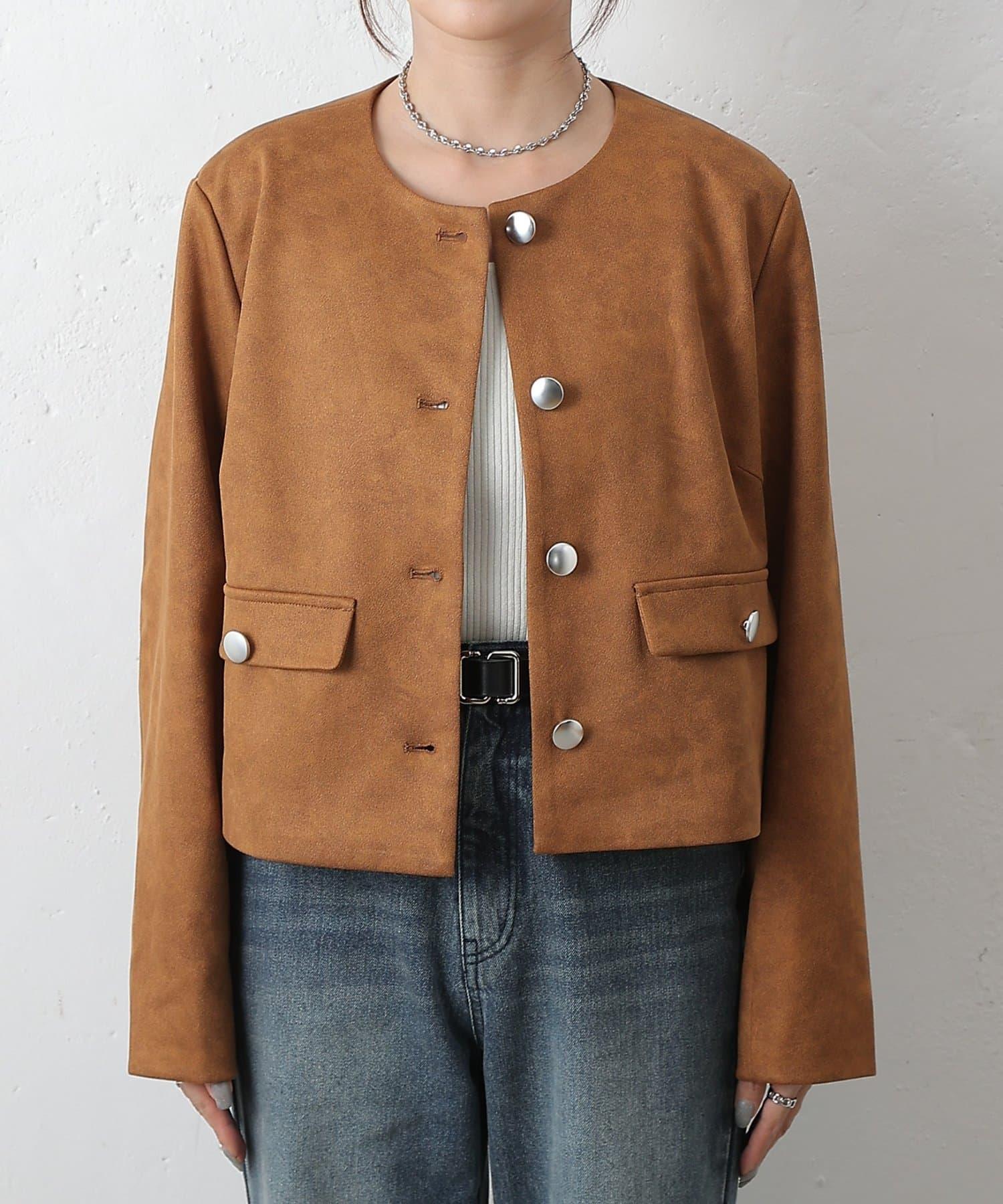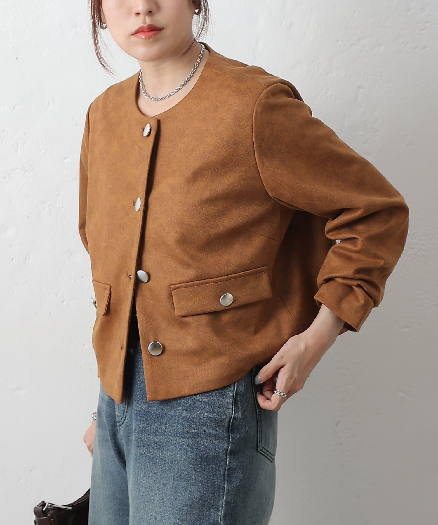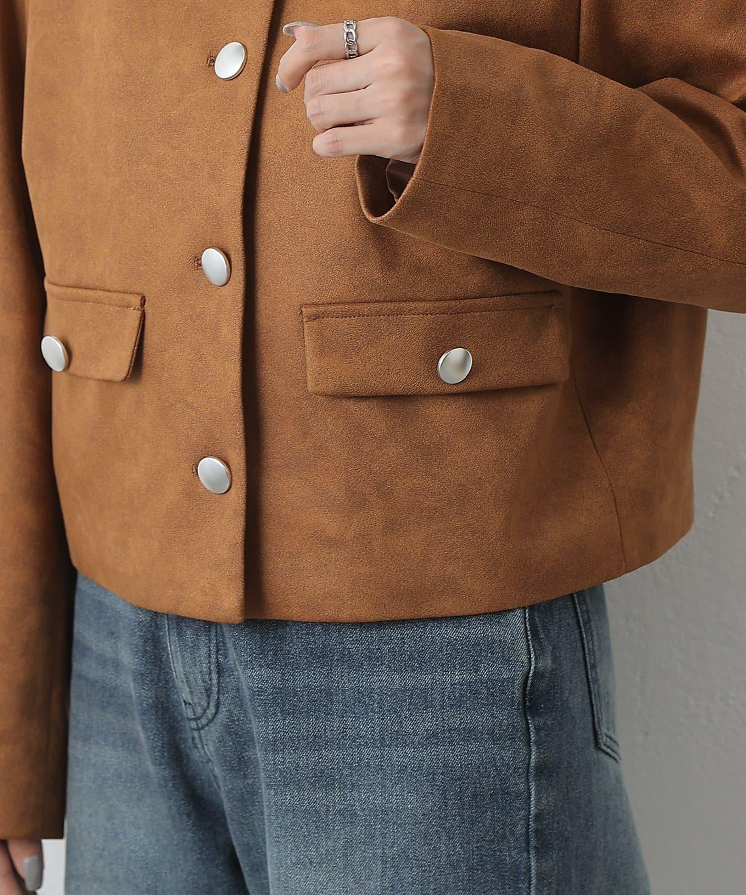 這款優雅的無領夾克採用麂皮絨面料製成,質地溼潤,回彈性好。