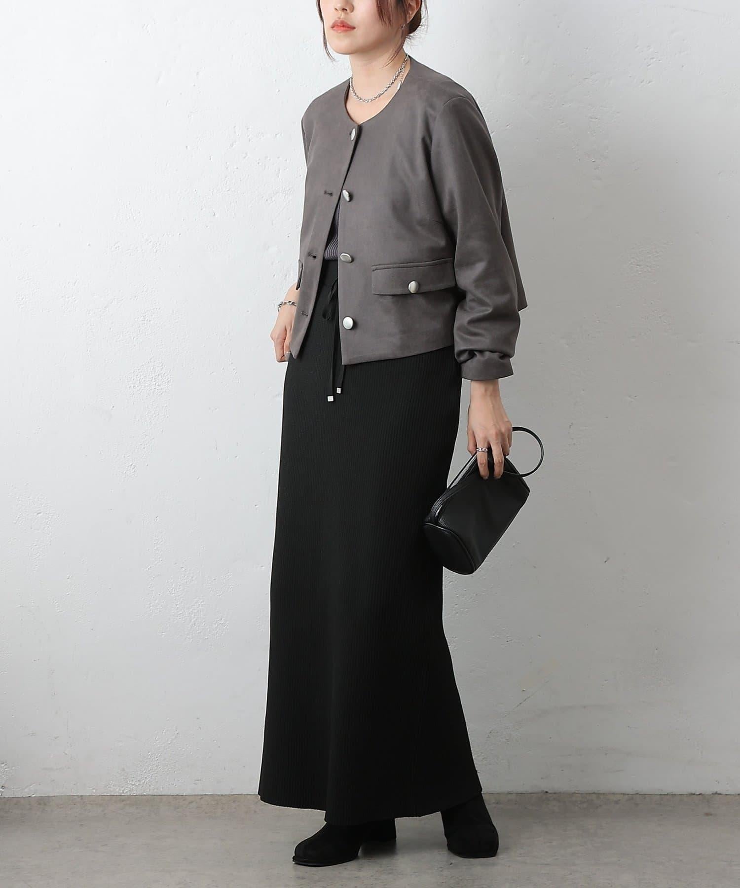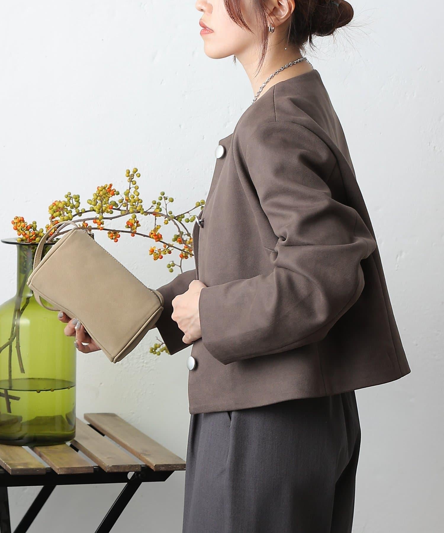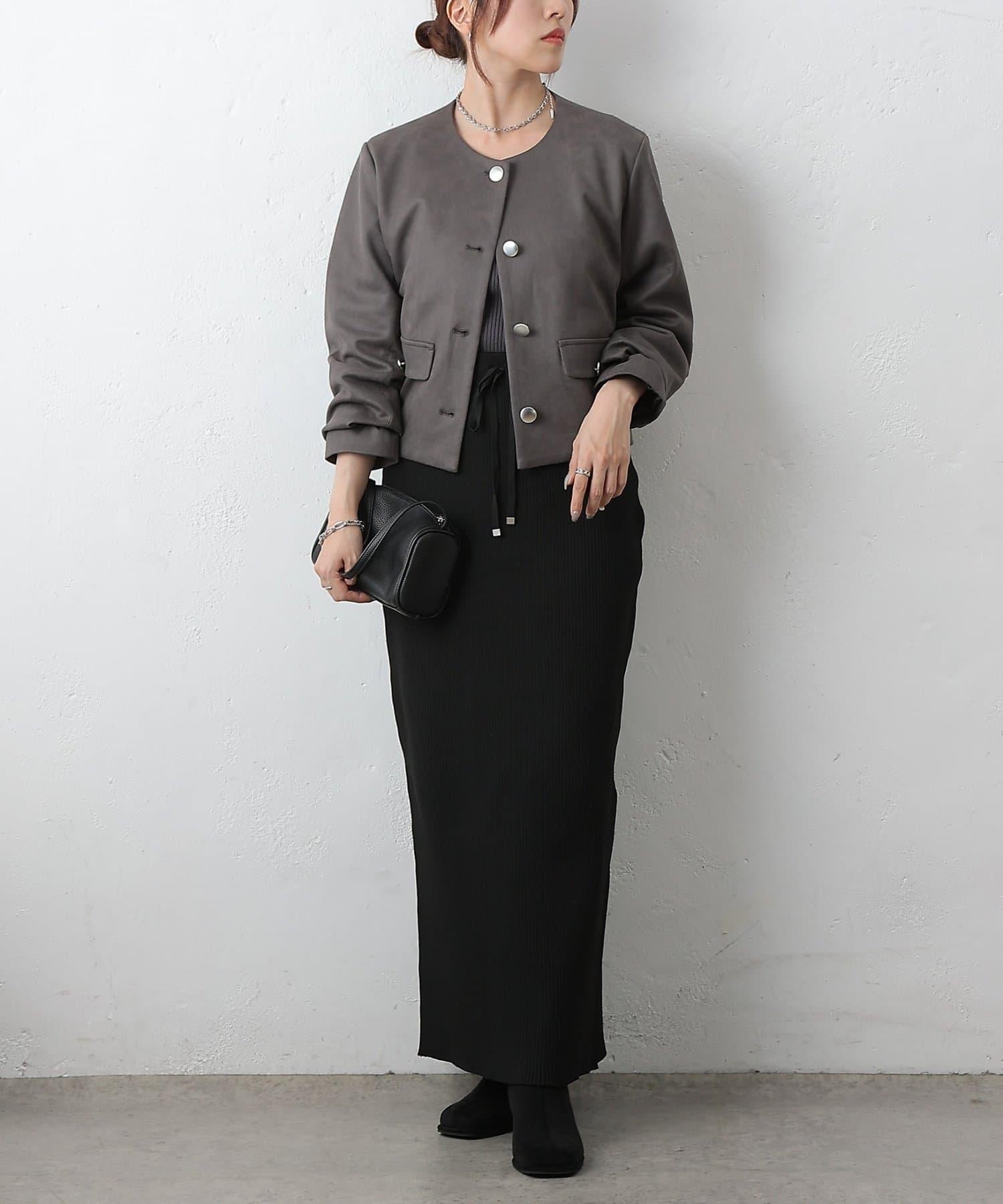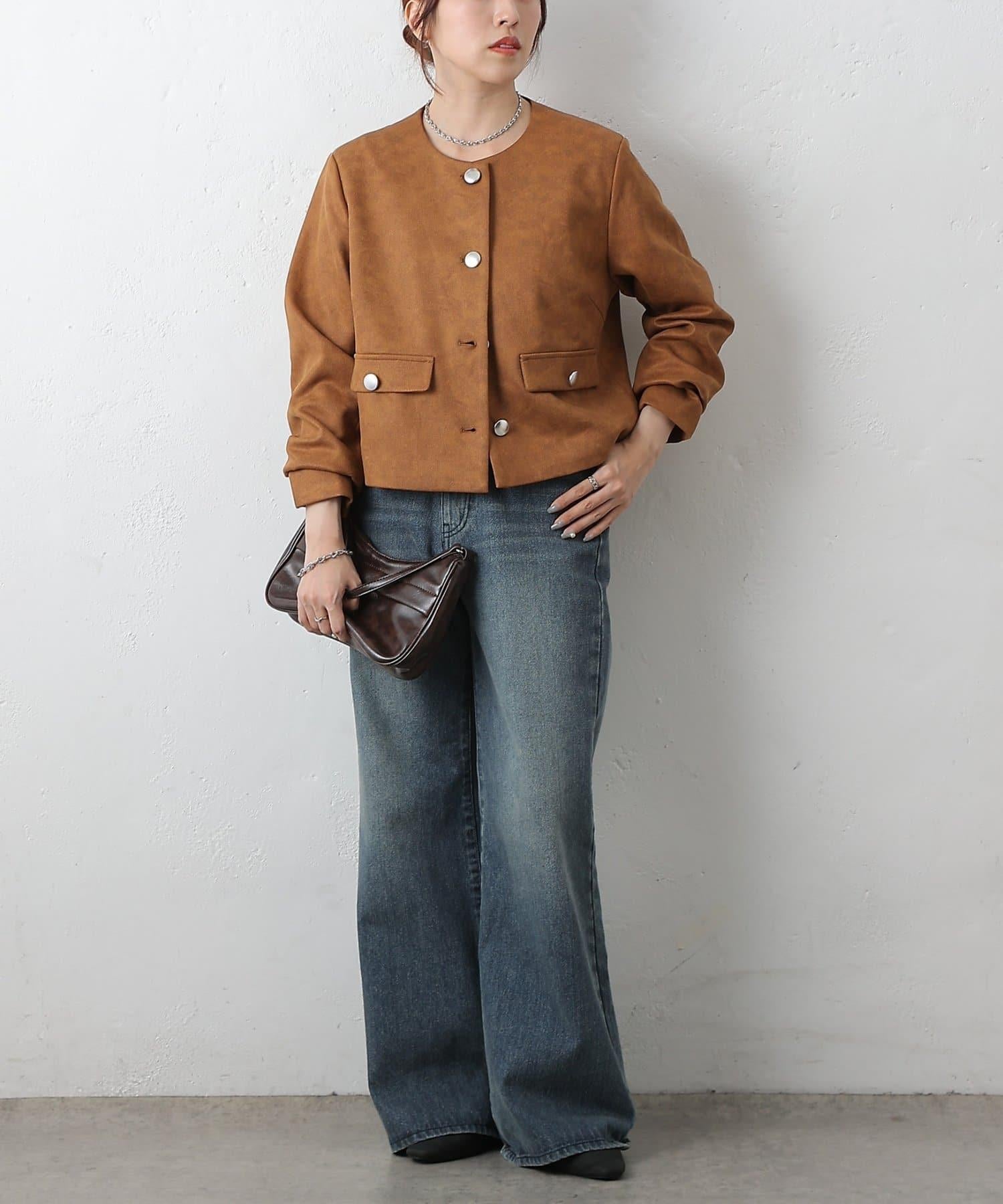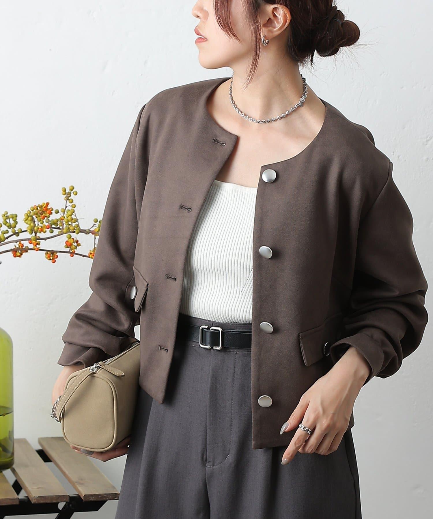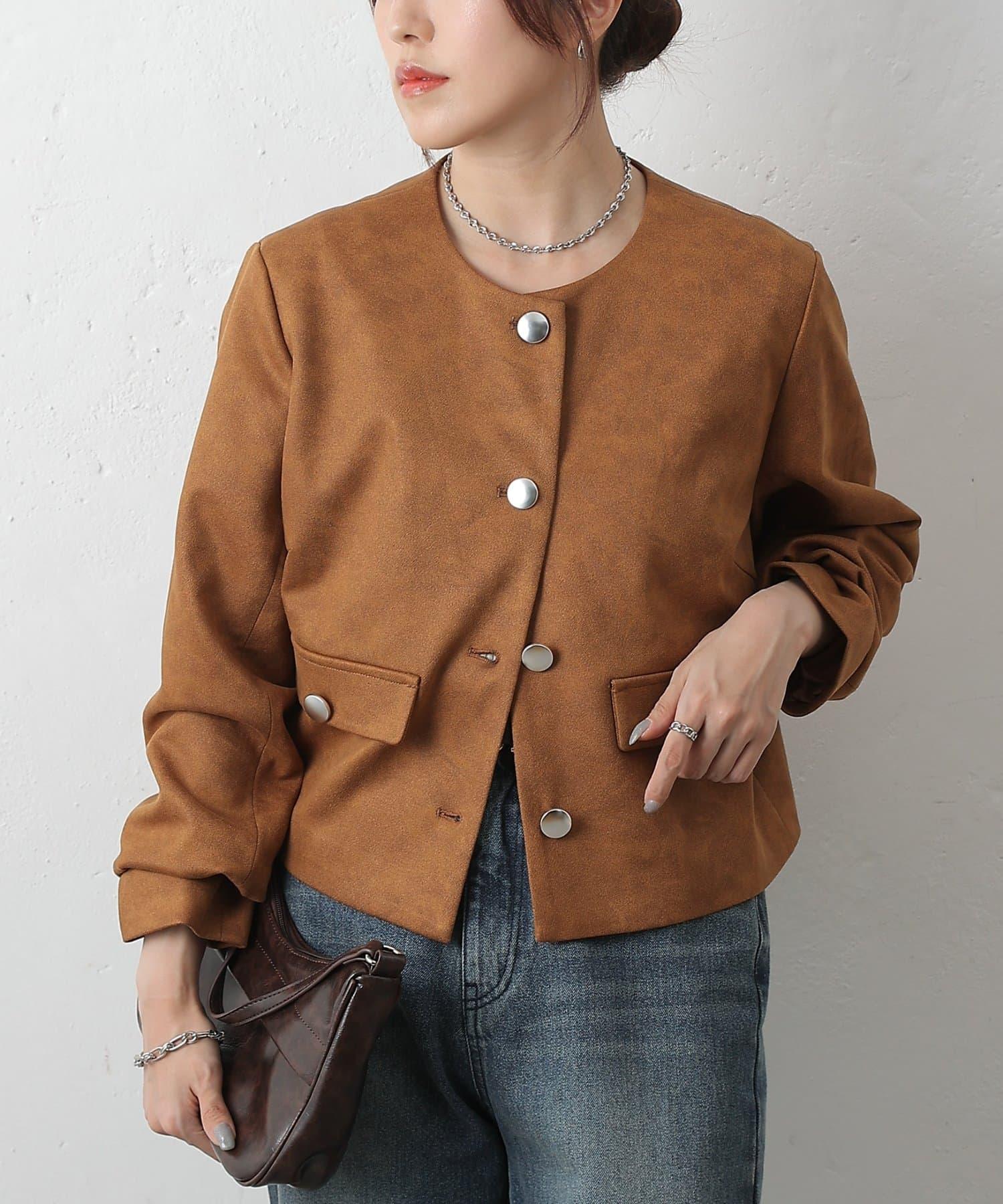 這款優雅的無領夾克採用麂皮絨面料製成,質地溼潤,回彈性好。