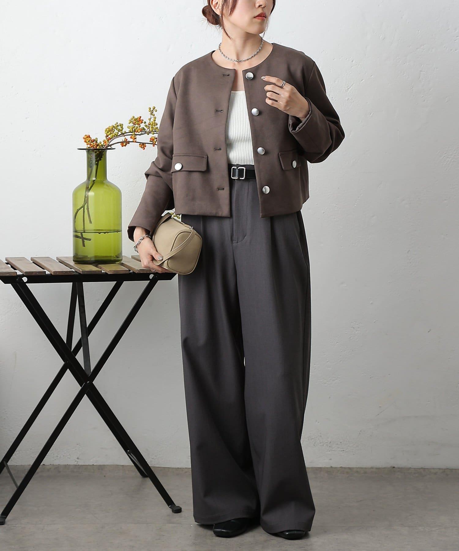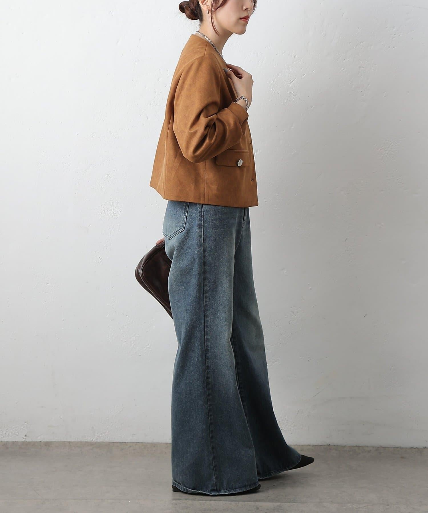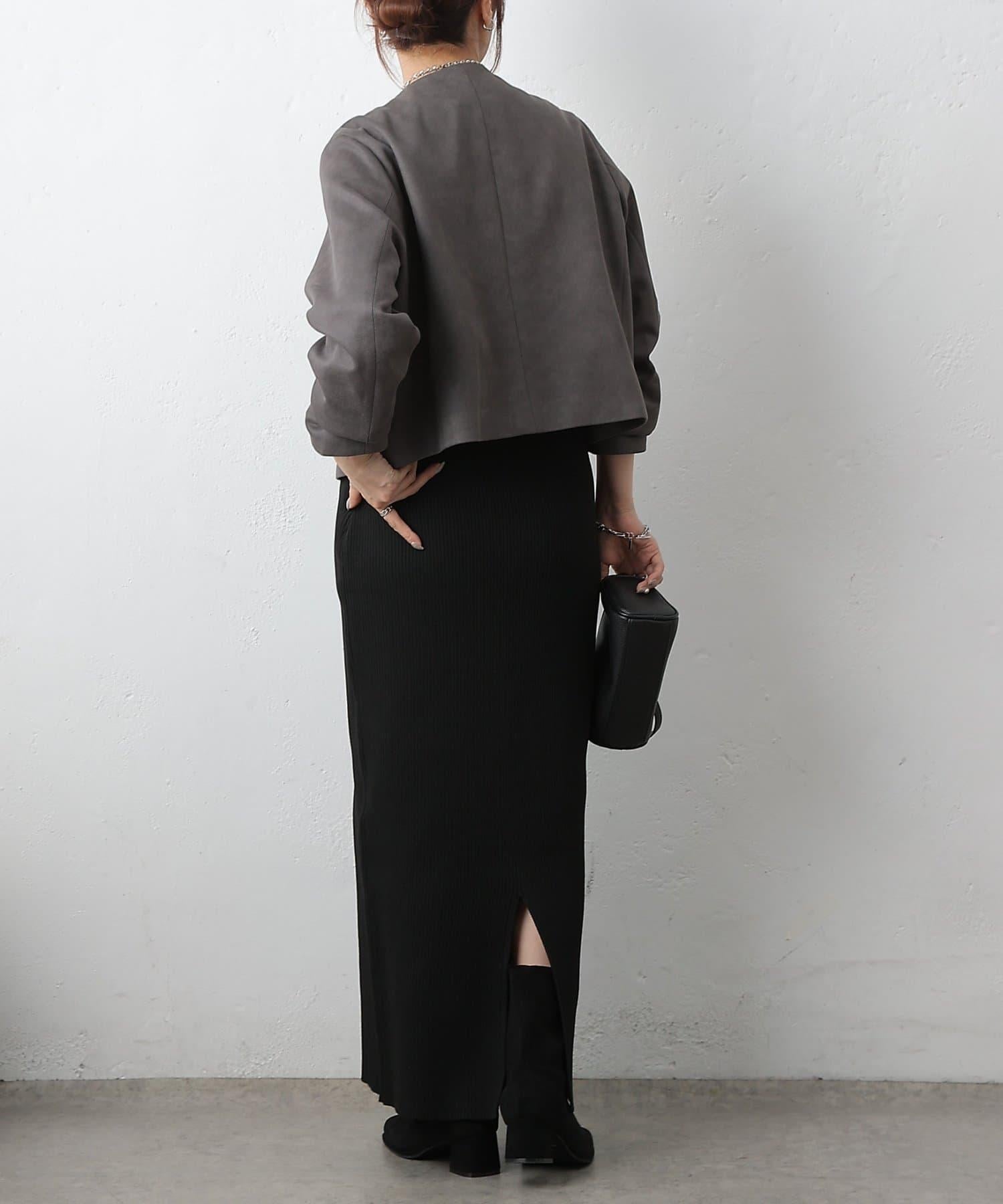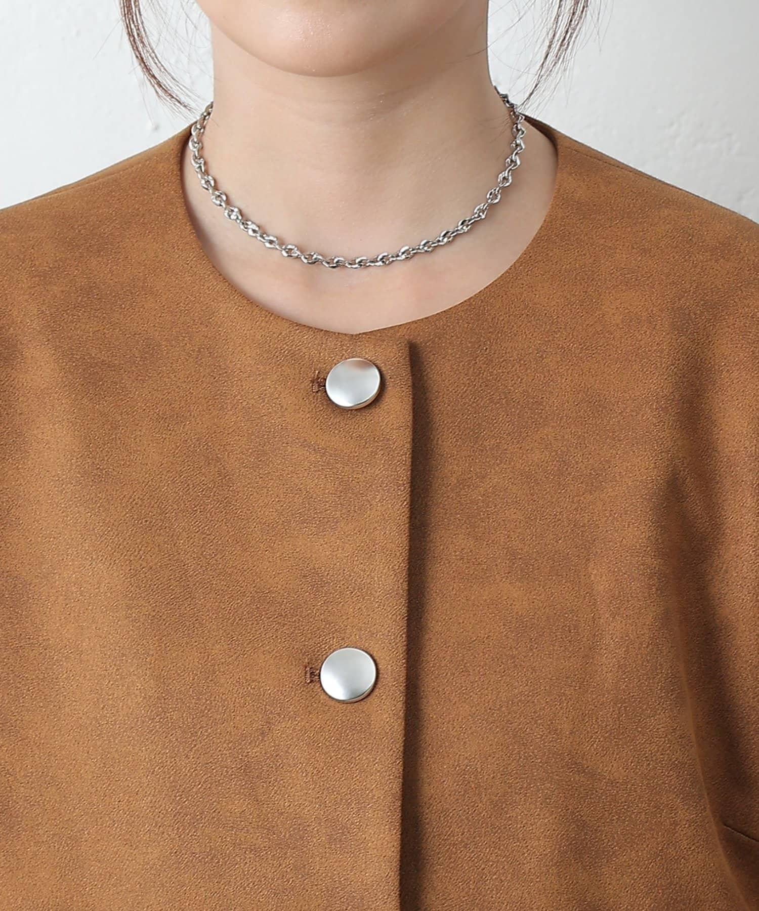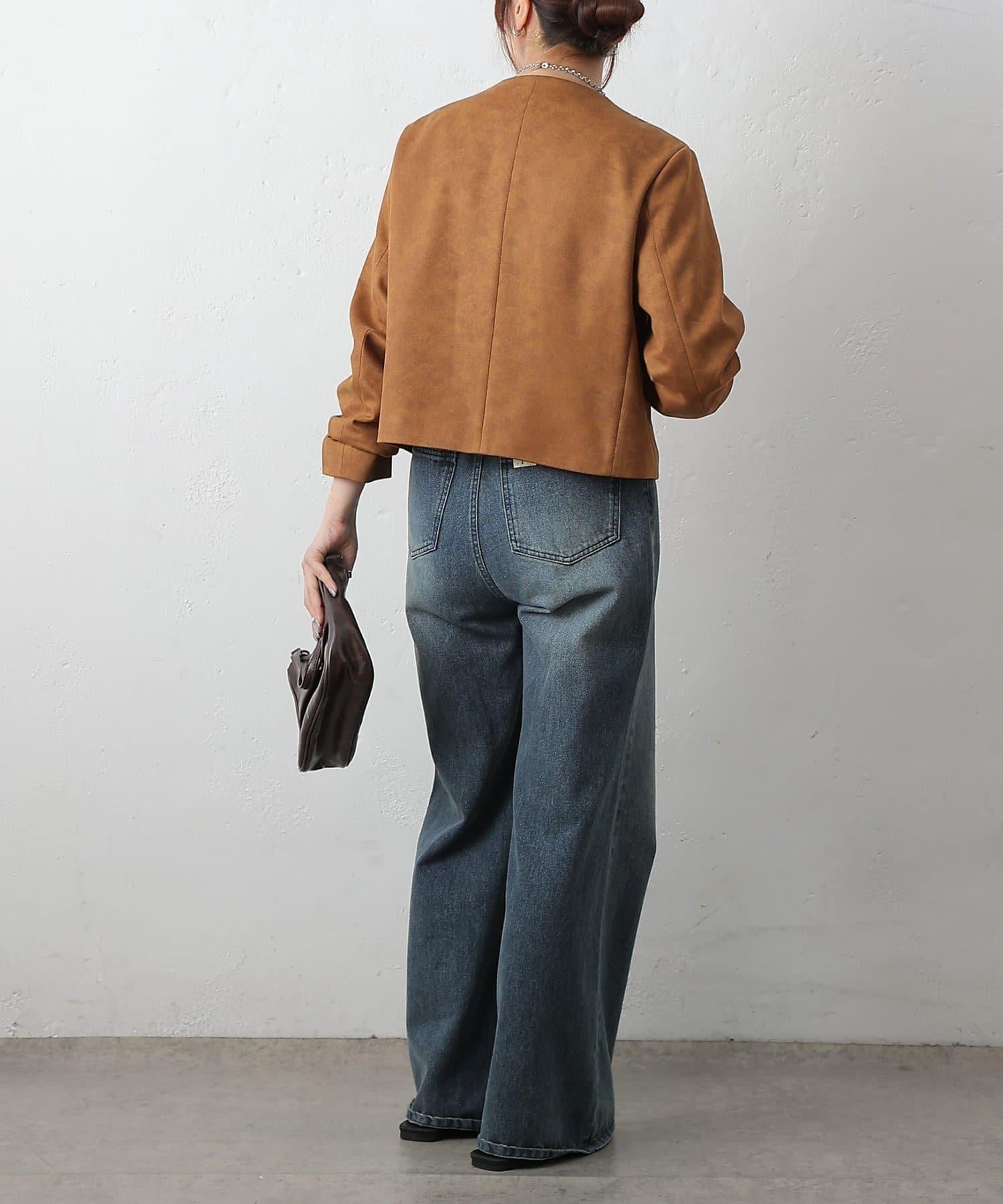 這款優雅的無領夾克採用麂皮絨面料製成,質地溼潤,回彈性好。