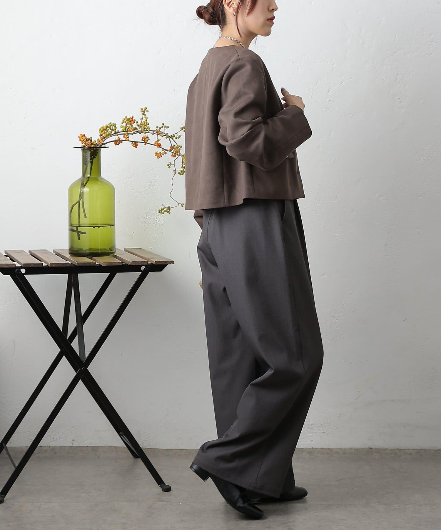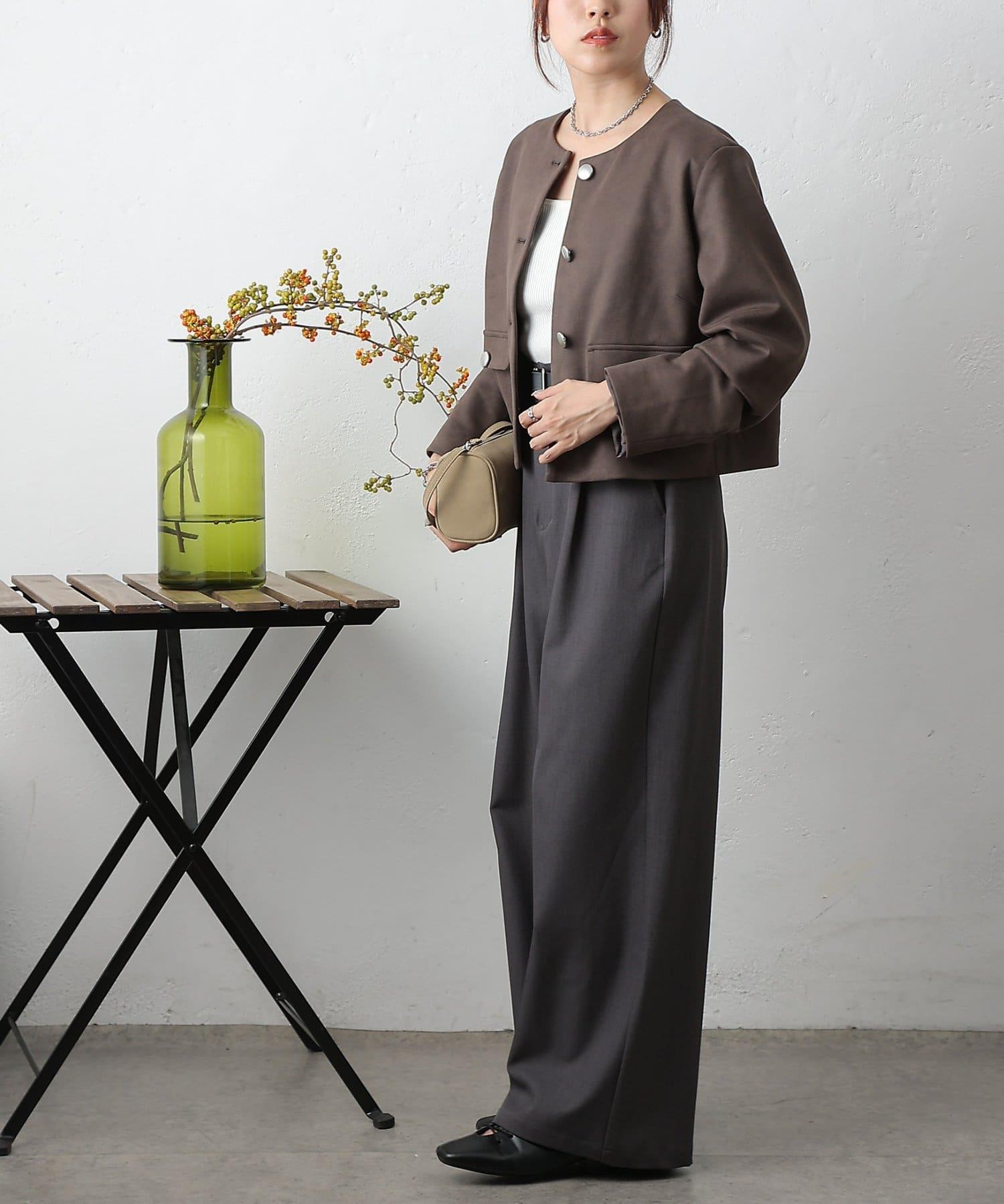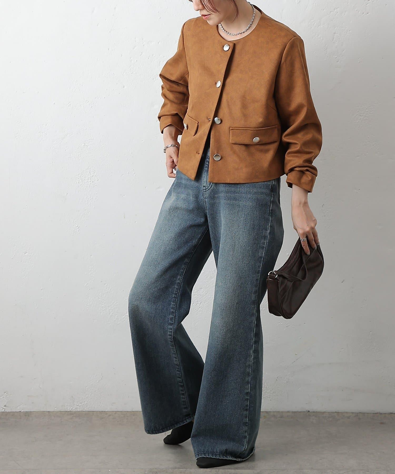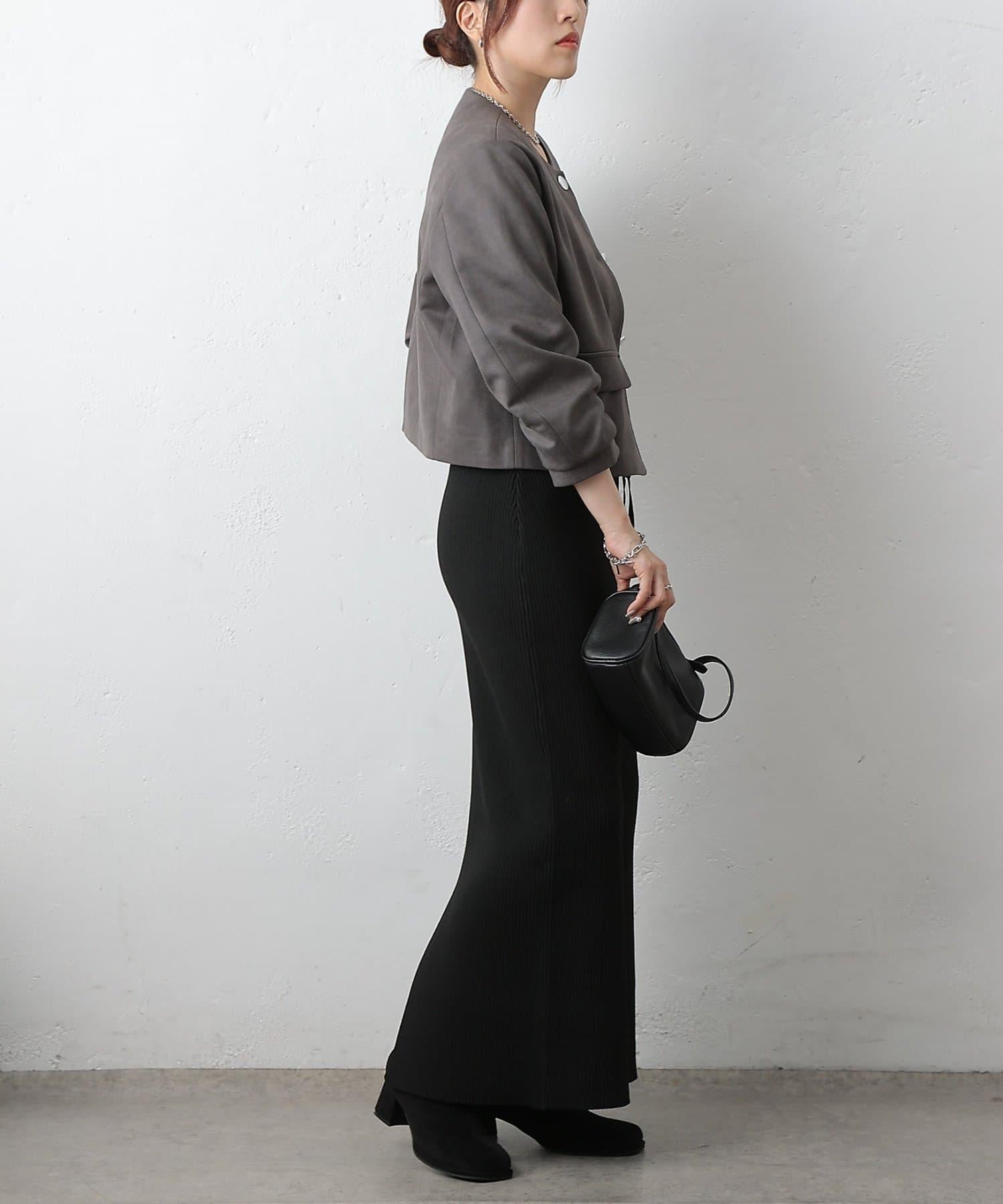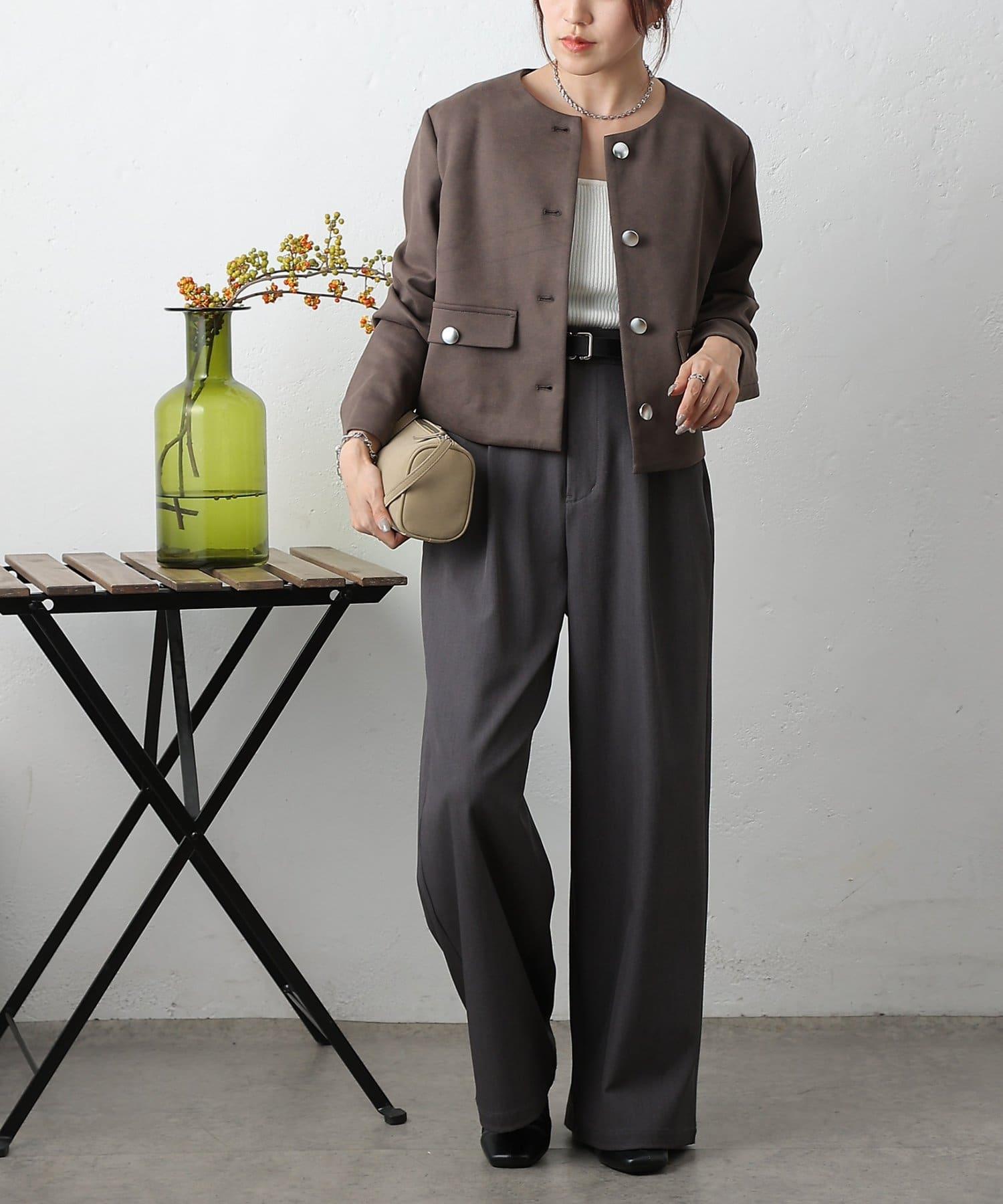 這款優雅的無領夾克採用麂皮絨面料製成,質地溼潤,回彈性好。