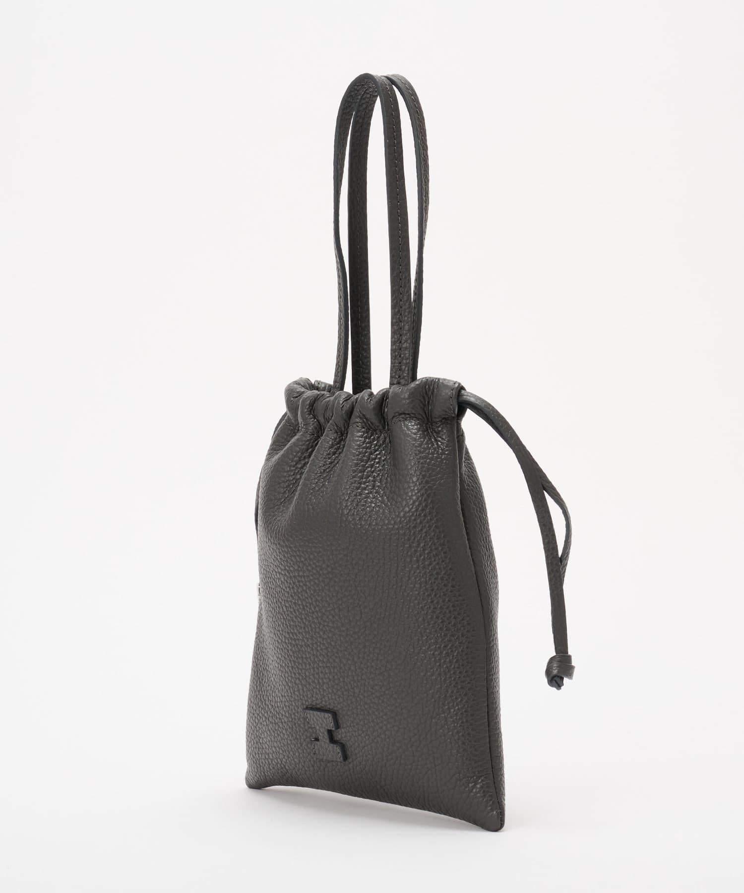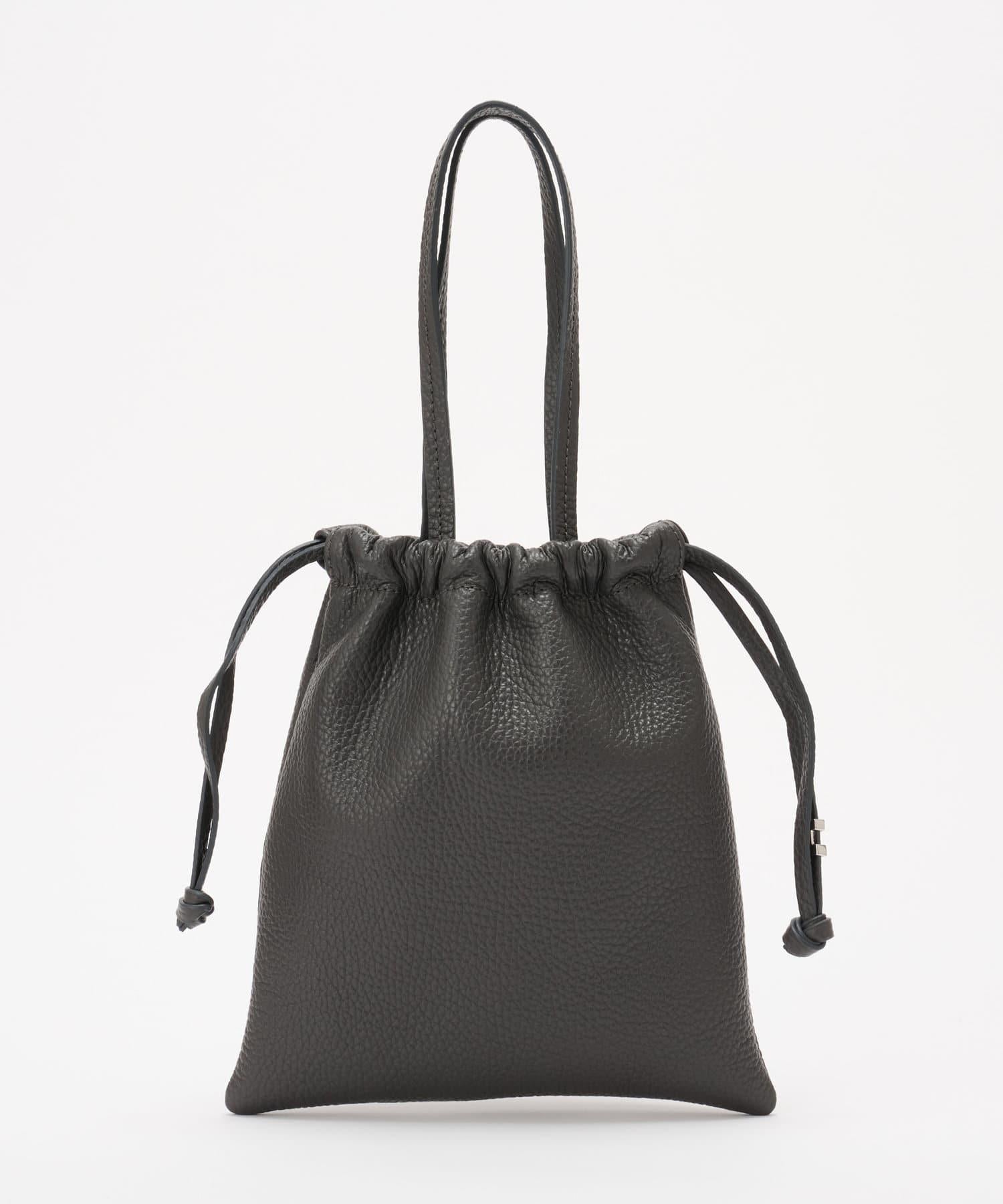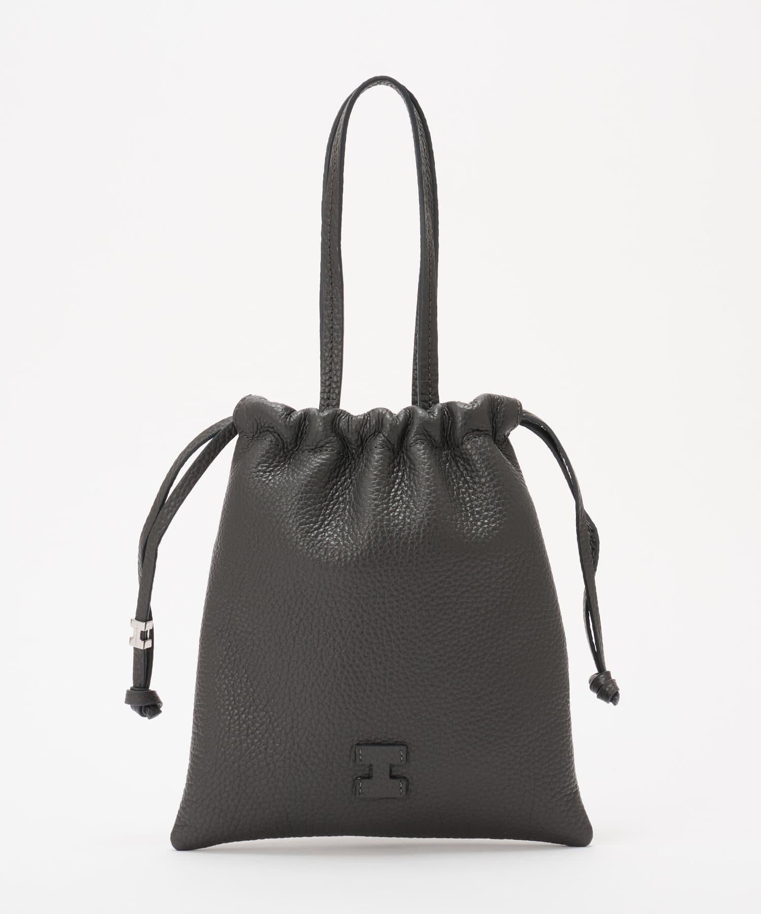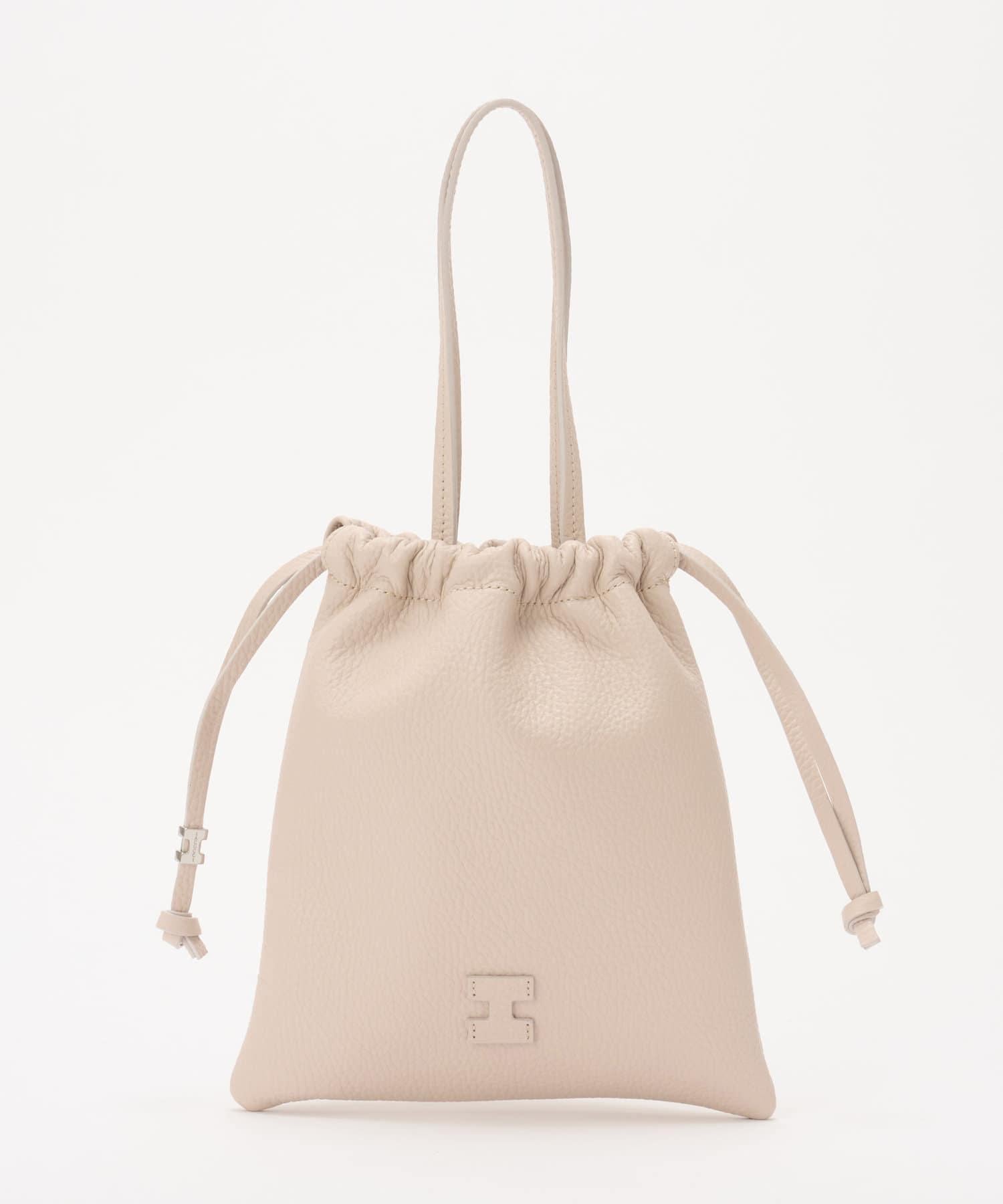 雙向抽繩手提包 "GRANELLO "正面飾有皮革 "I "字樣,包繩上帶有徽標金屬。