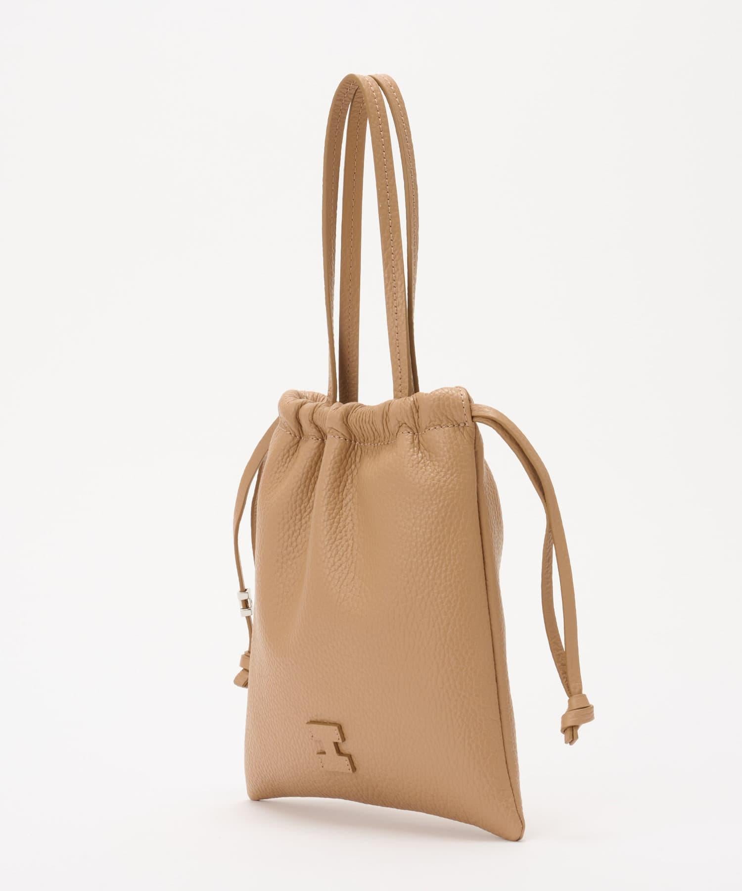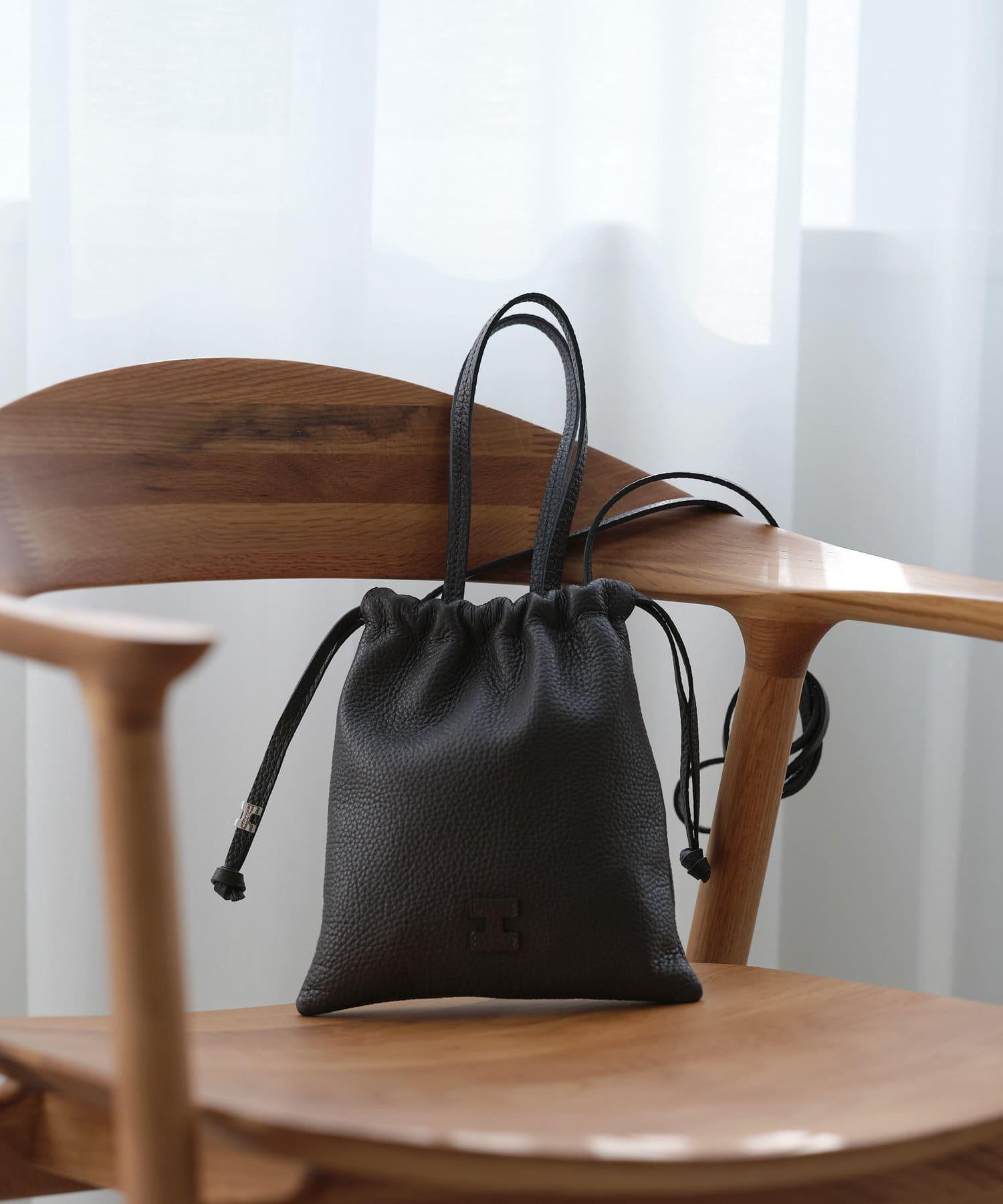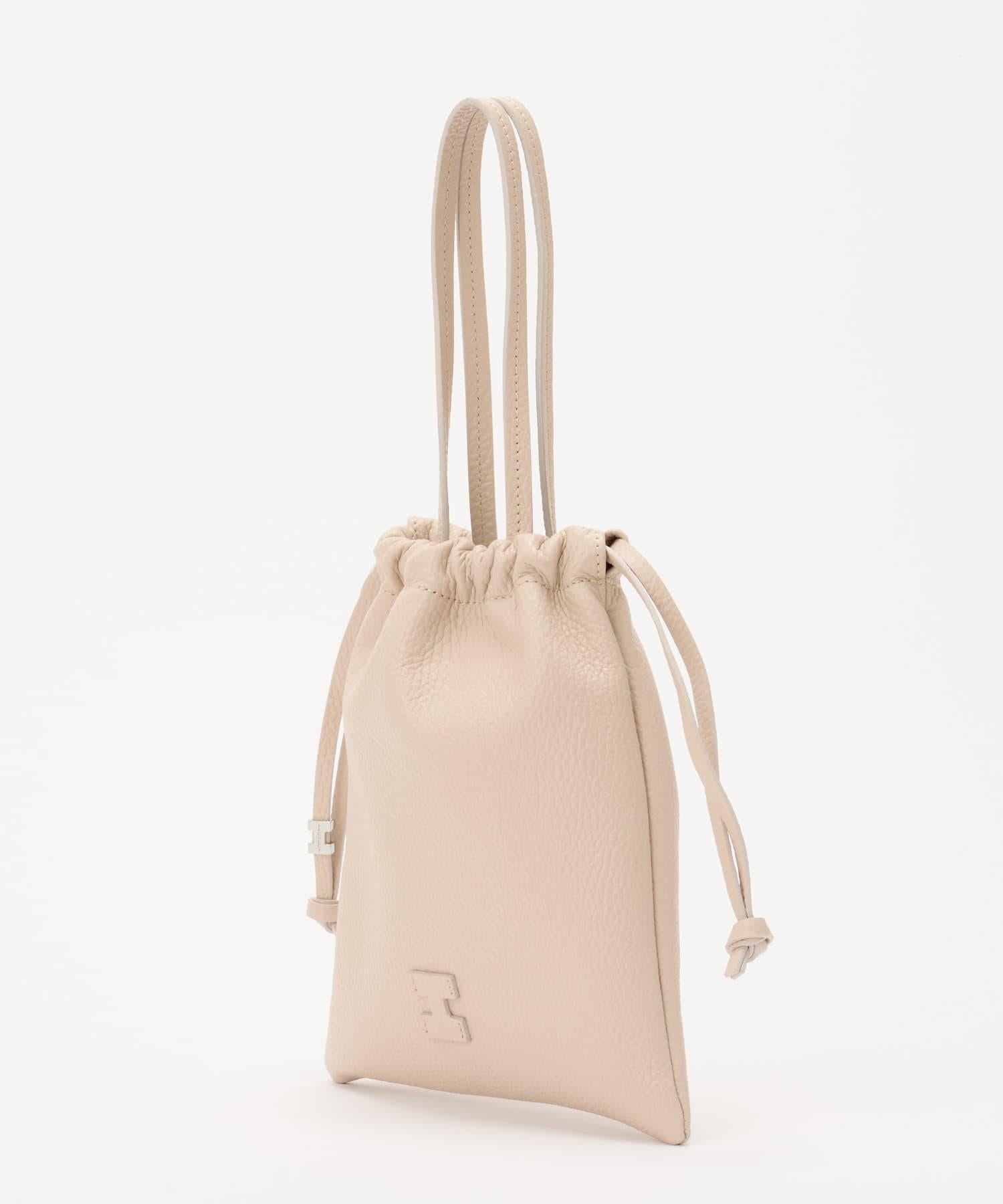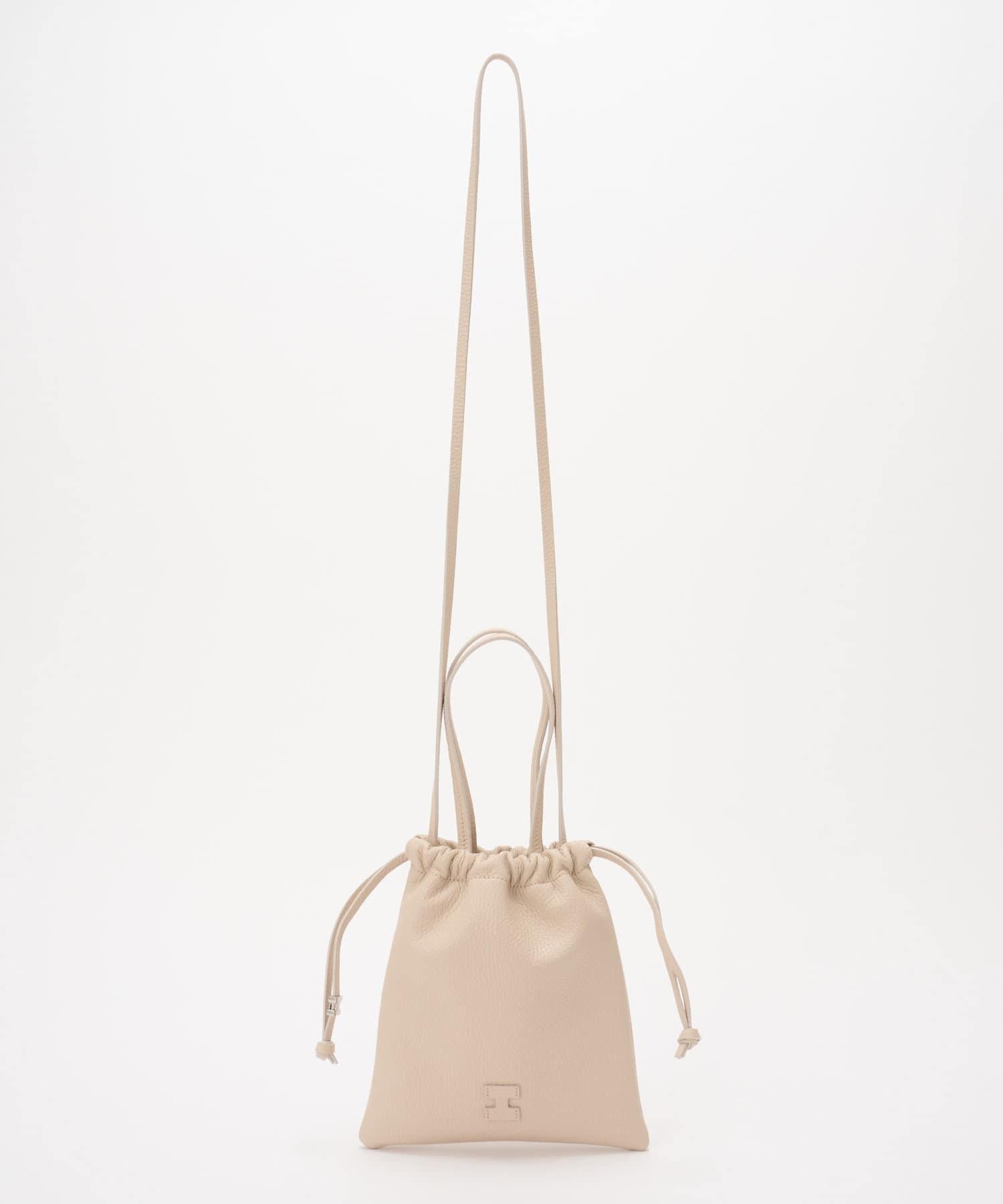 雙向抽繩手提包 "GRANELLO "正面飾有皮革 "I "字樣,包繩上帶有徽標金屬。