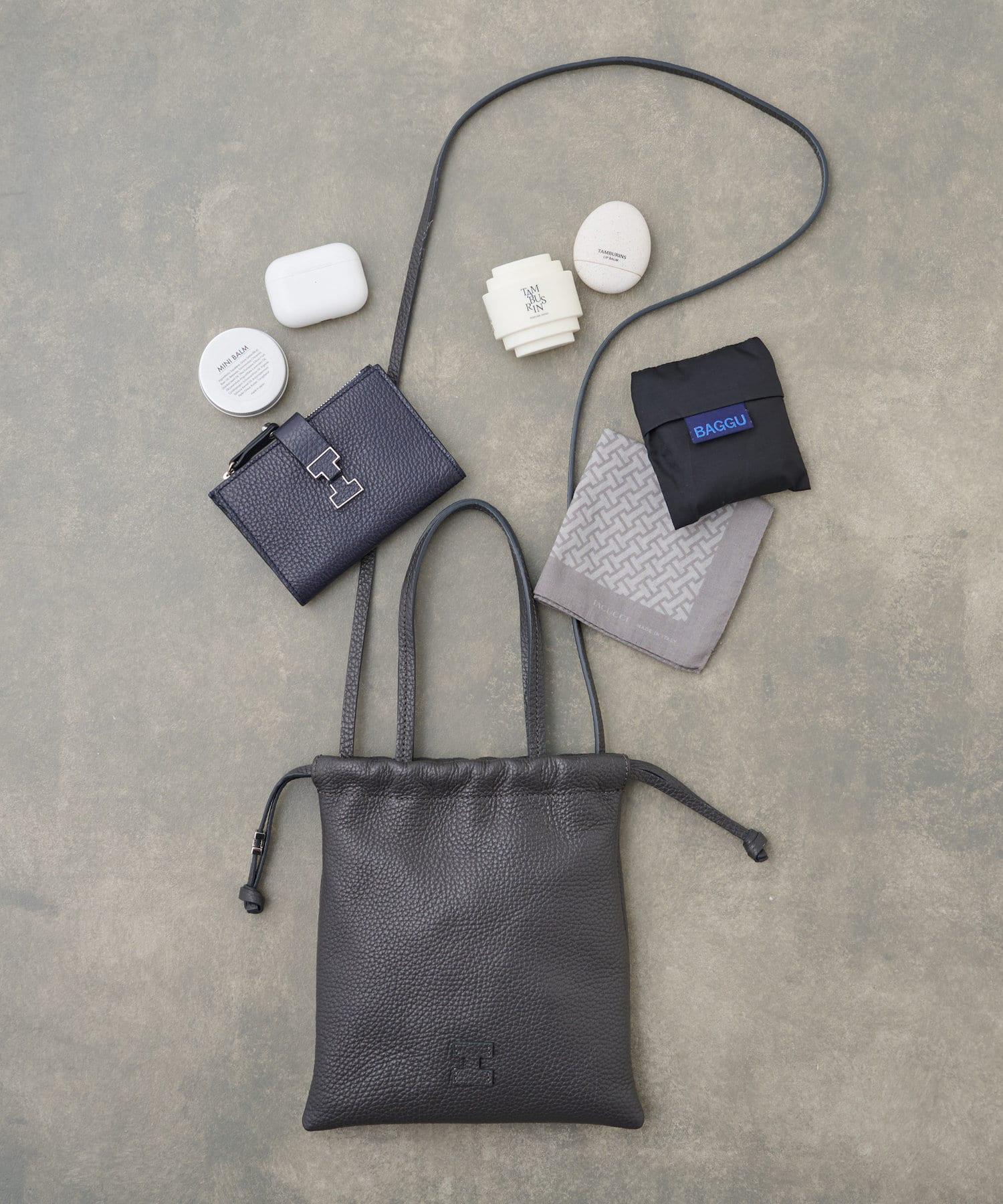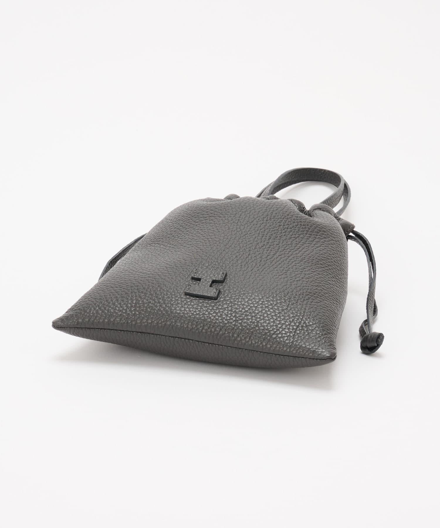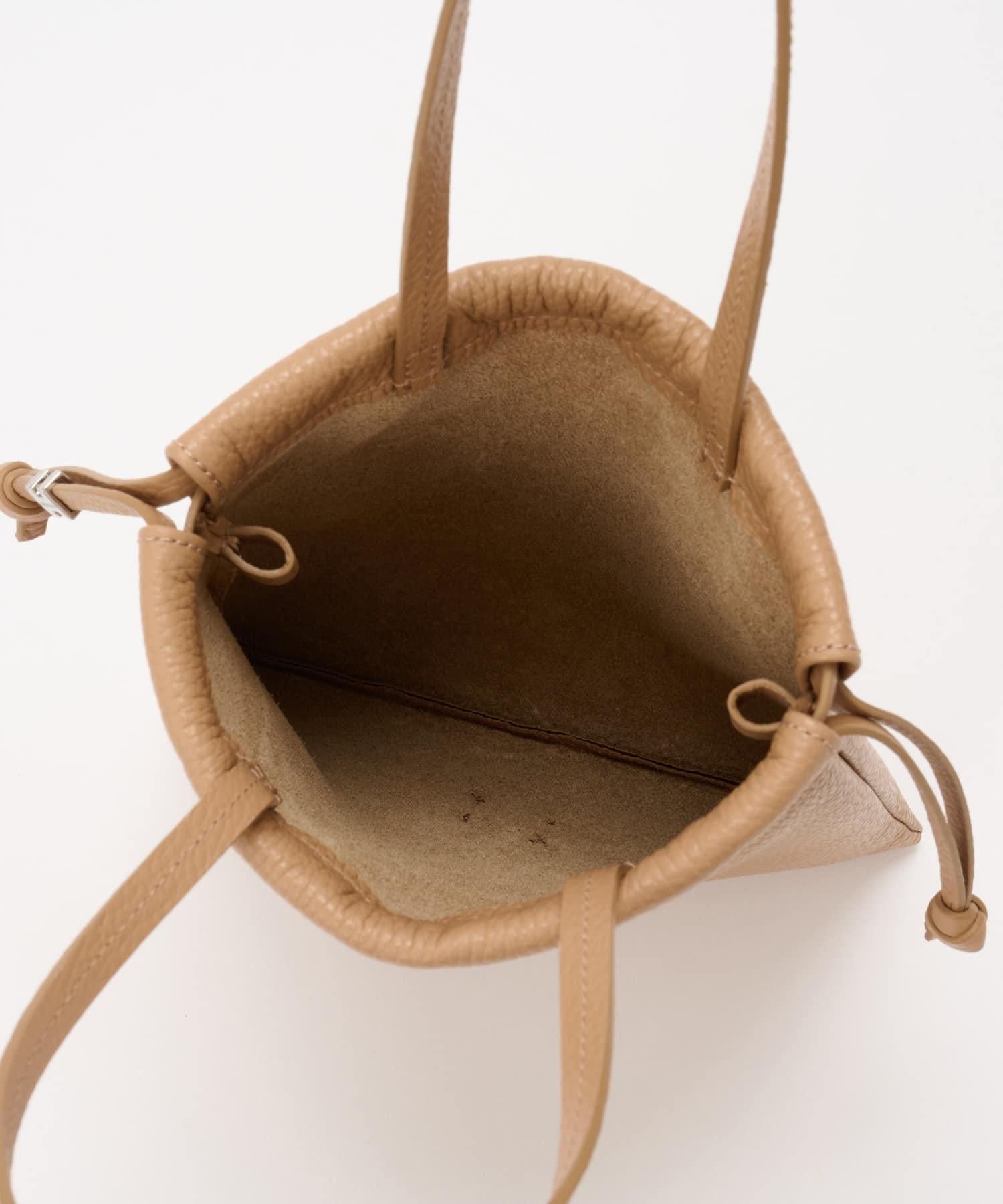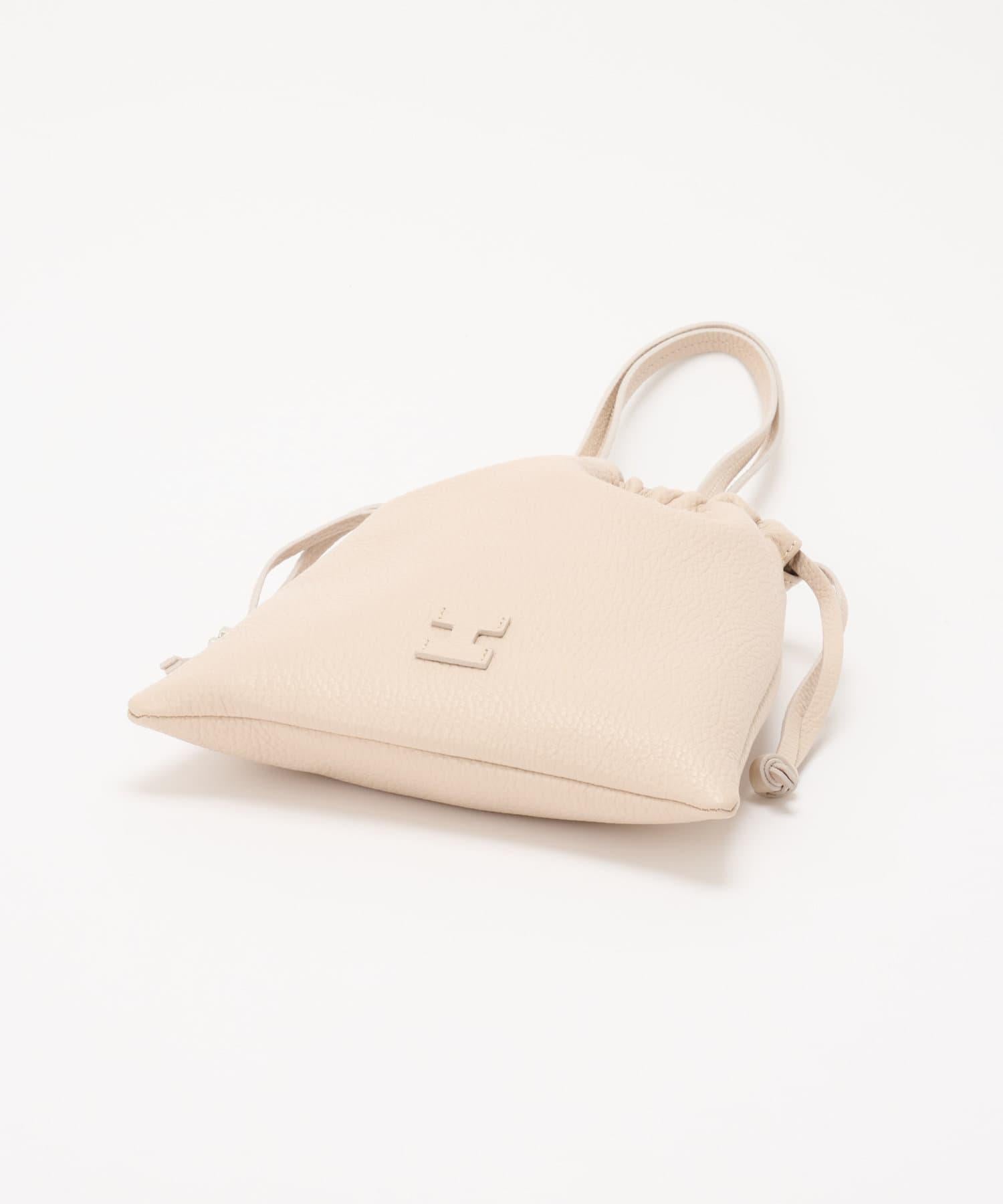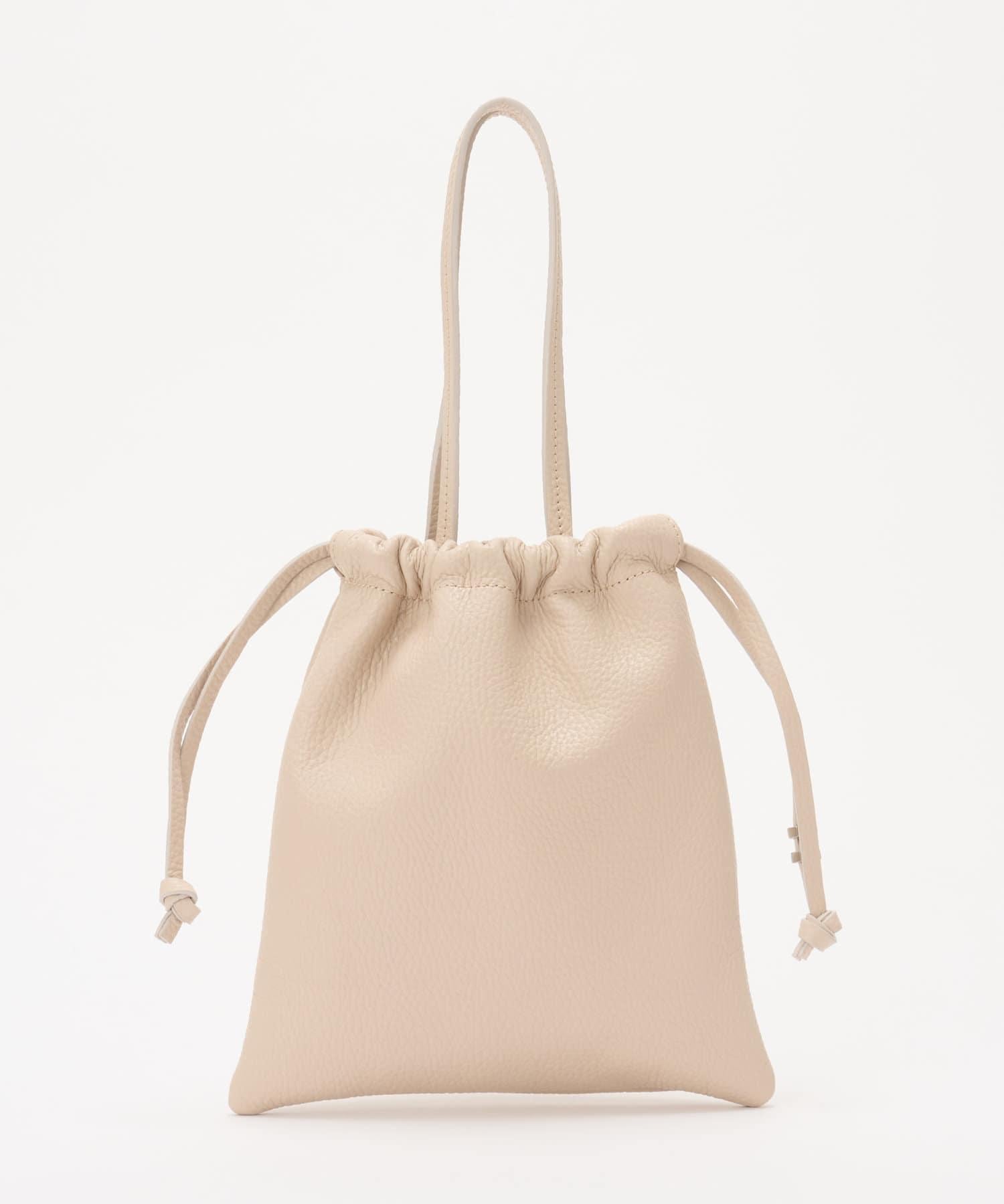 雙向抽繩手提包 "GRANELLO "正面飾有皮革 "I "字樣,包繩上帶有徽標金屬。