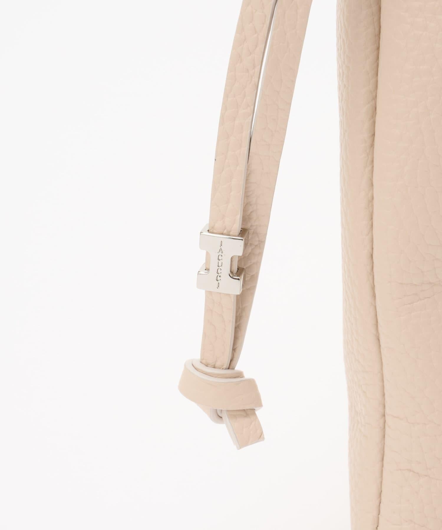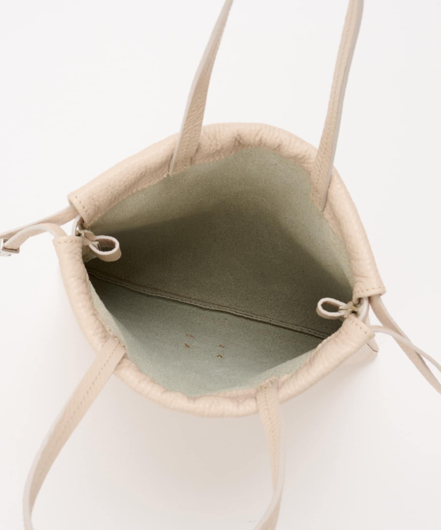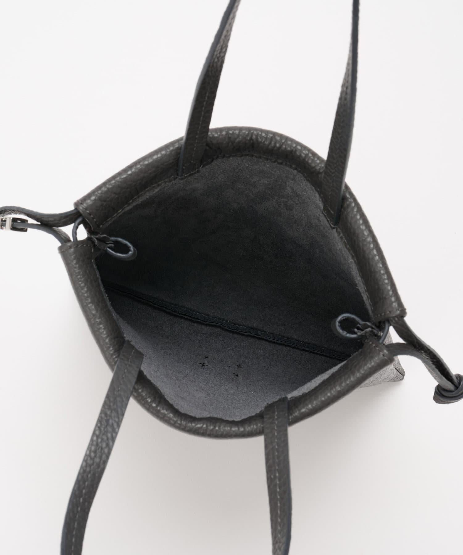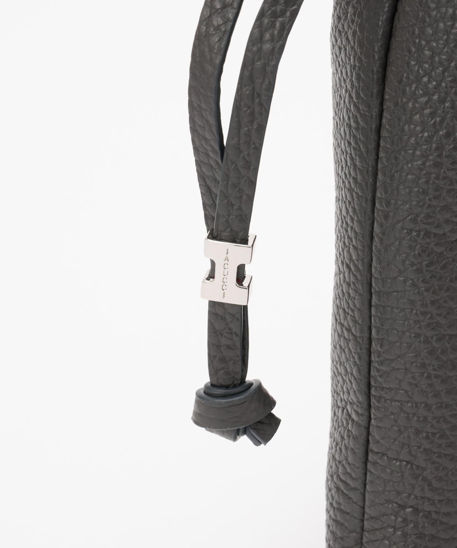 雙向抽繩手提包 "GRANELLO "正面飾有皮革 "I "字樣,包繩上帶有徽標金屬。