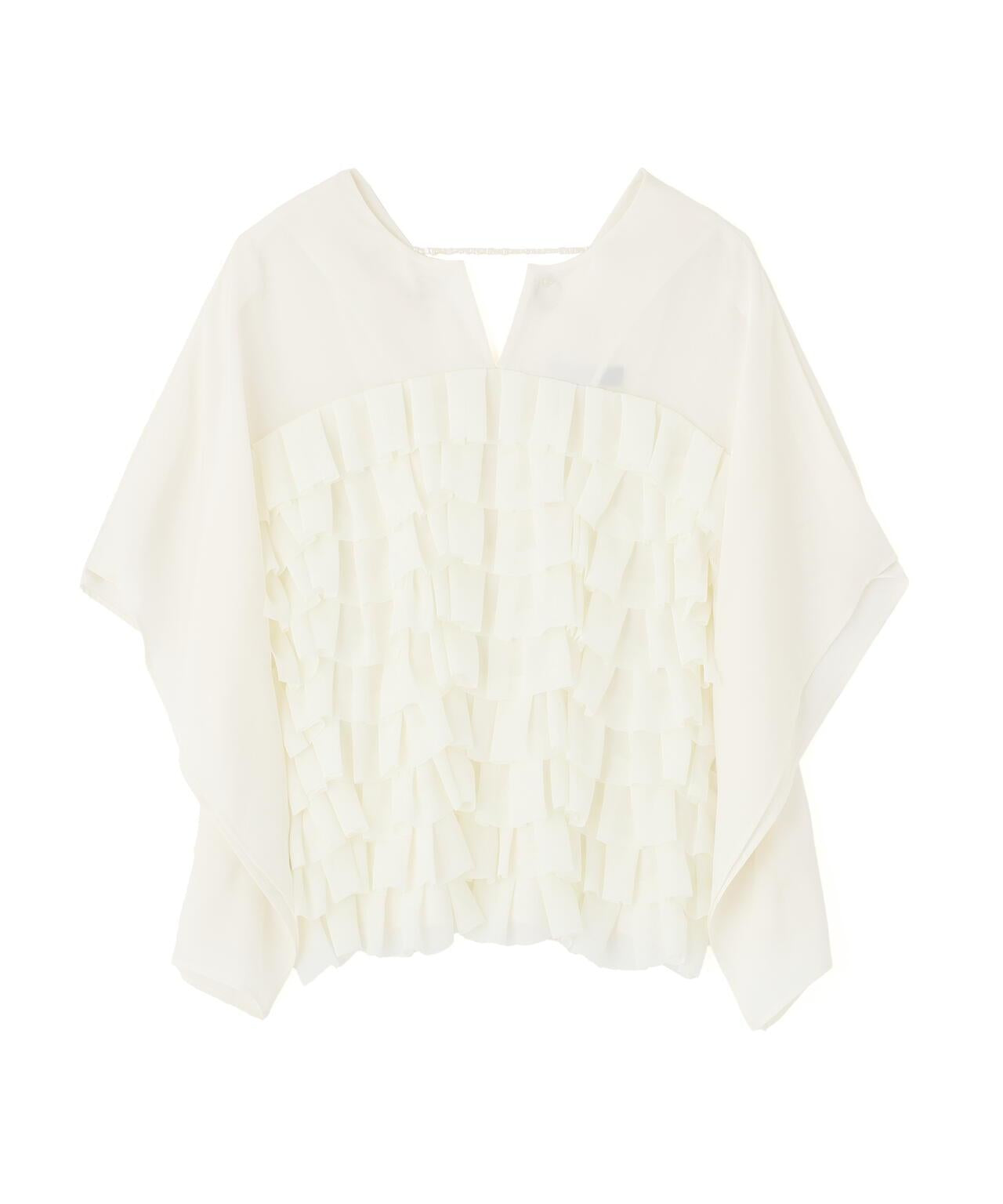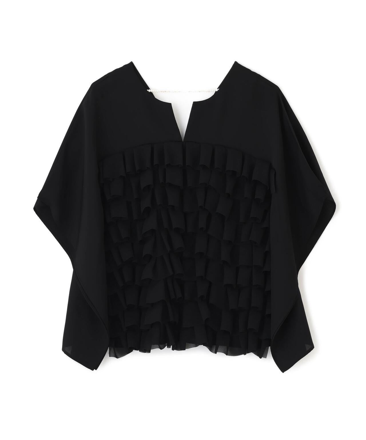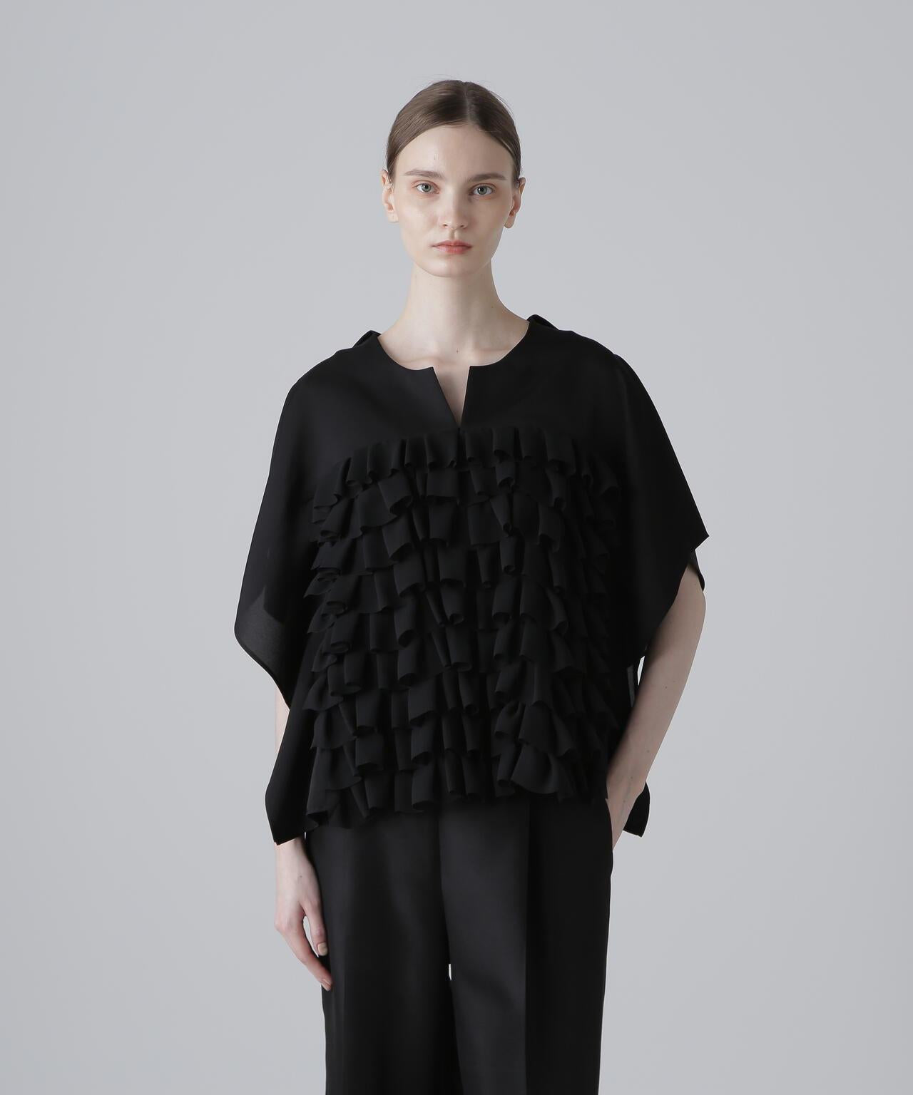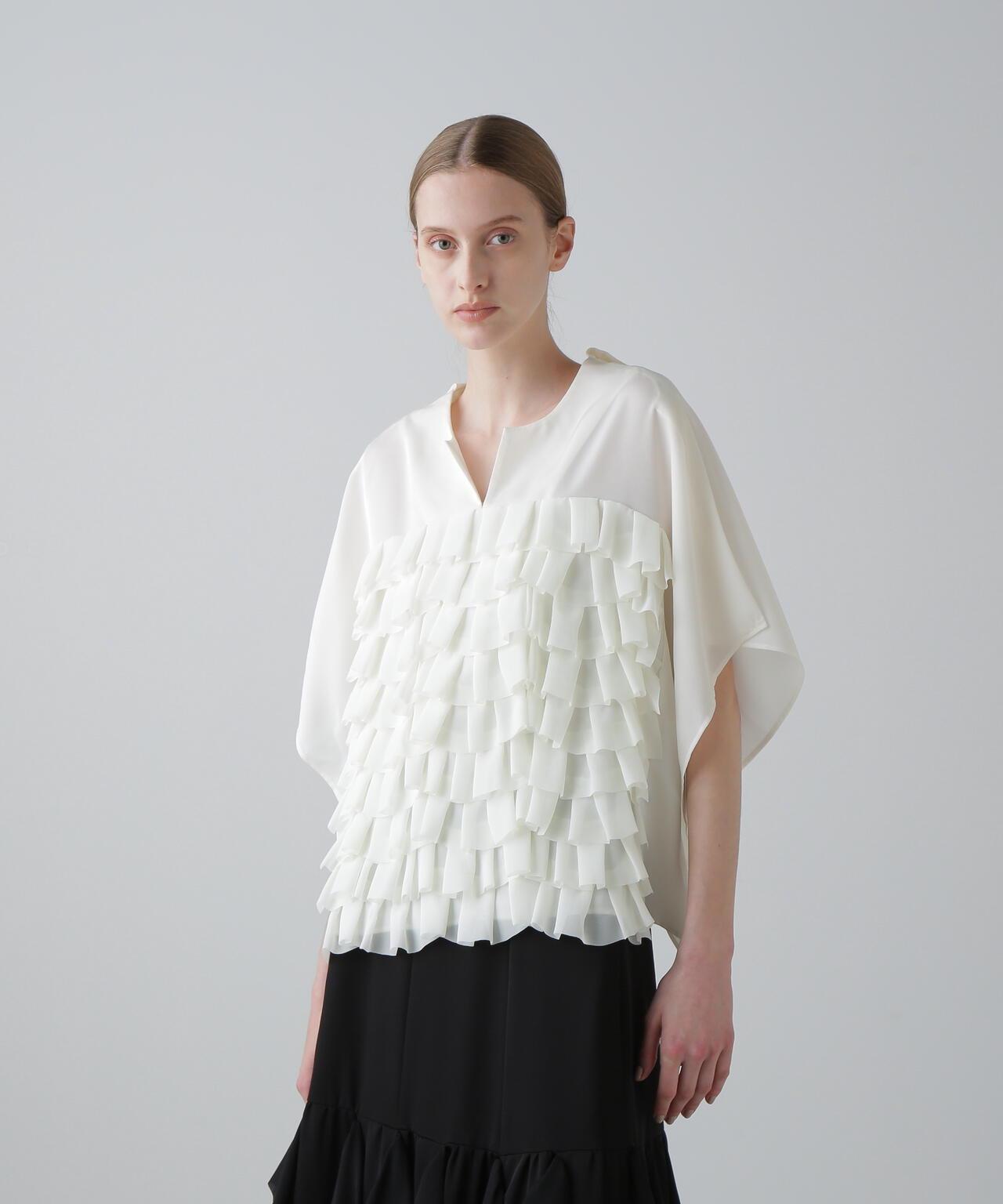 高品質襯衫,荷葉邊層疊設計讓人印象深刻隨機內搭的荷葉邊層疊襯衫,正面有荷葉邊層疊設計。後領口鑲有淡水珍珠。後領採用開襟設計,給人以成熟的印象。袖子也採用開衩設計,使上衣的輪廓方方正正,動感十足。採用斜紋布製成,具有獨特的懸垂感、輕盈感和適度的張力,荷葉邊採用輕質棉布大膽縫製。