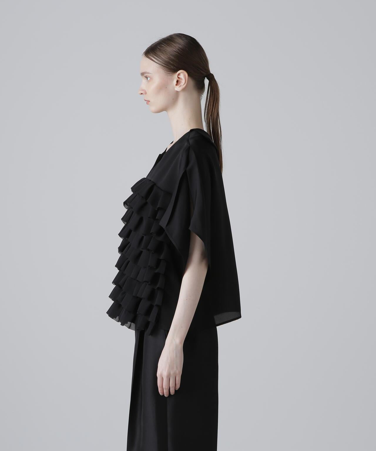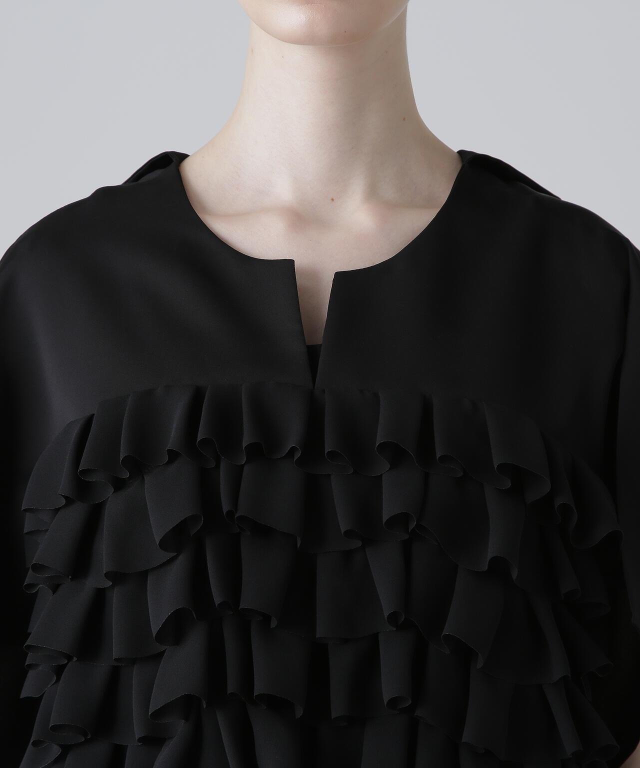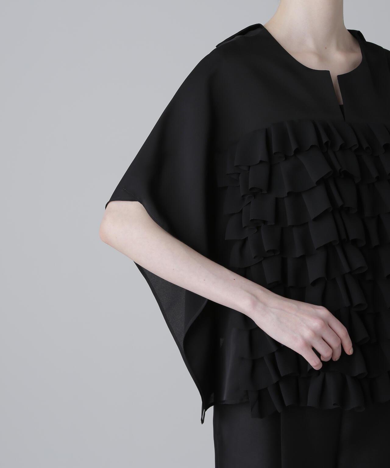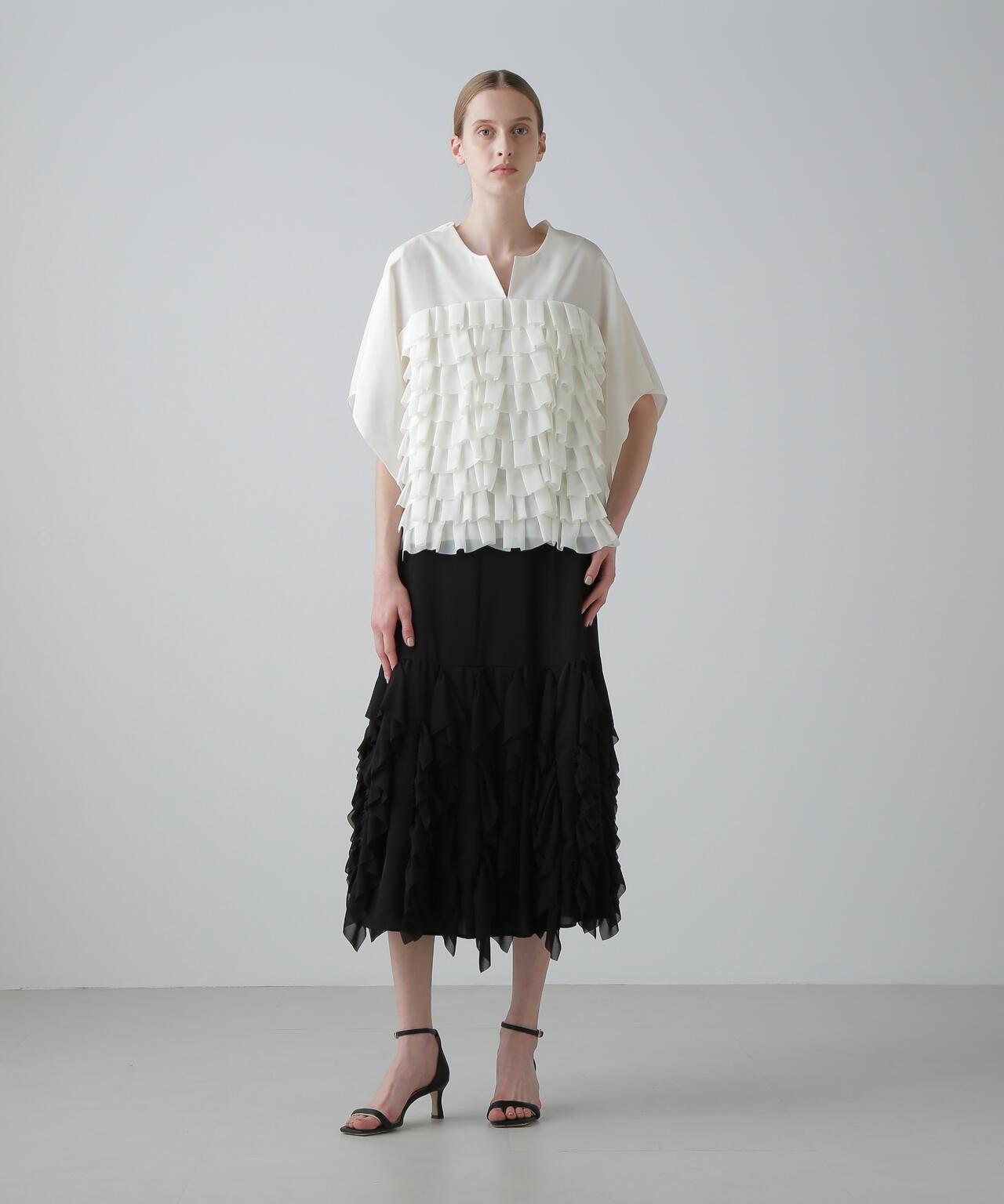 高品質襯衫,荷葉邊層疊設計讓人印象深刻隨機內搭的荷葉邊層疊襯衫,正面有荷葉邊層疊設計。後領口鑲有淡水珍珠。後領採用開襟設計,給人以成熟的印象。袖子也採用開衩設計,使上衣的輪廓方方正正,動感十足。採用斜紋布製成,具有獨特的懸垂感、輕盈感和適度的張力,荷葉邊採用輕質棉布大膽縫製。