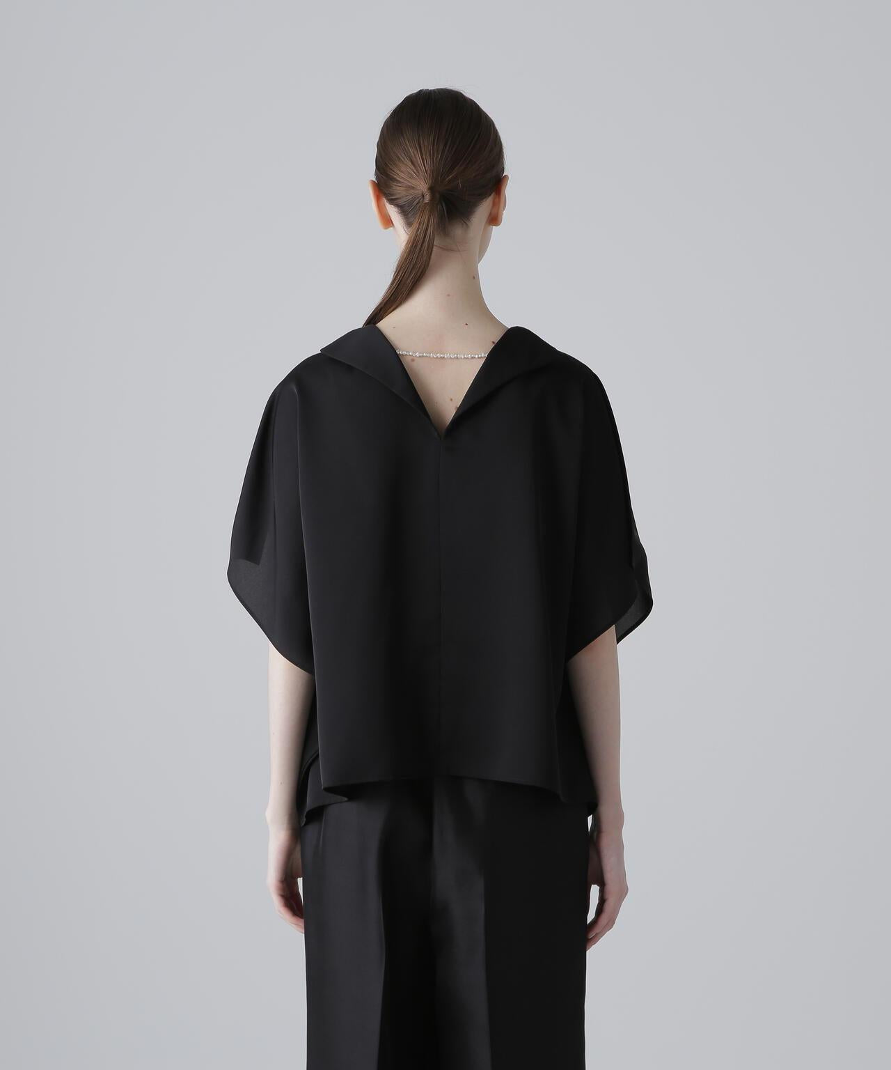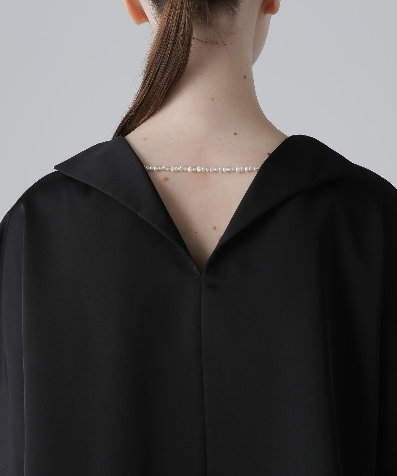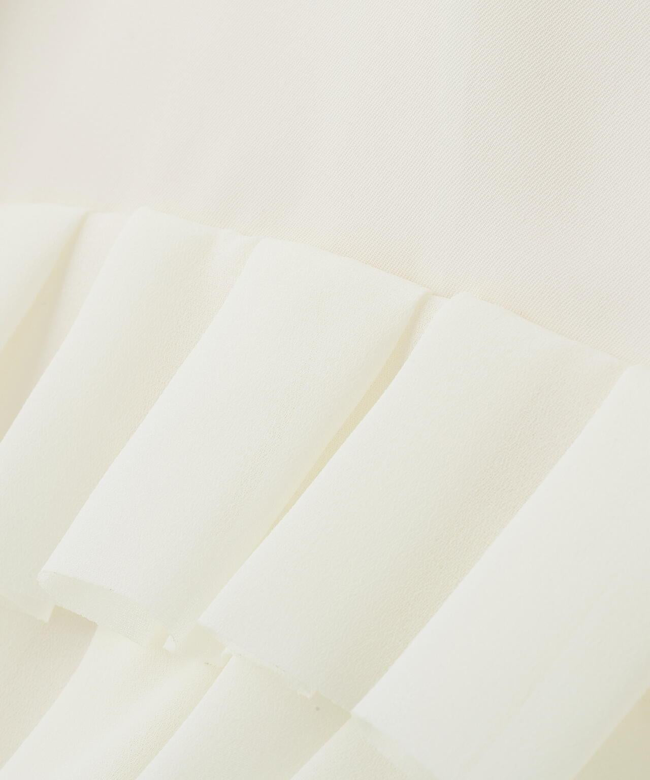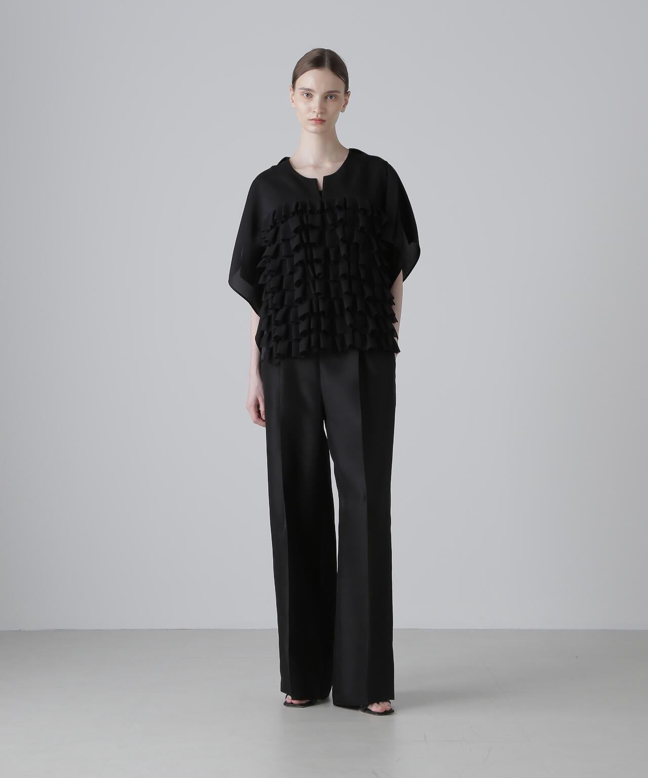 高品質襯衫,荷葉邊層疊設計讓人印象深刻隨機內搭的荷葉邊層疊襯衫,正面有荷葉邊層疊設計。後領口鑲有淡水珍珠。後領採用開襟設計,給人以成熟的印象。袖子也採用開衩設計,使上衣的輪廓方方正正,動感十足。採用斜紋布製成,具有獨特的懸垂感、輕盈感和適度的張力,荷葉邊採用輕質棉布大膽縫製。