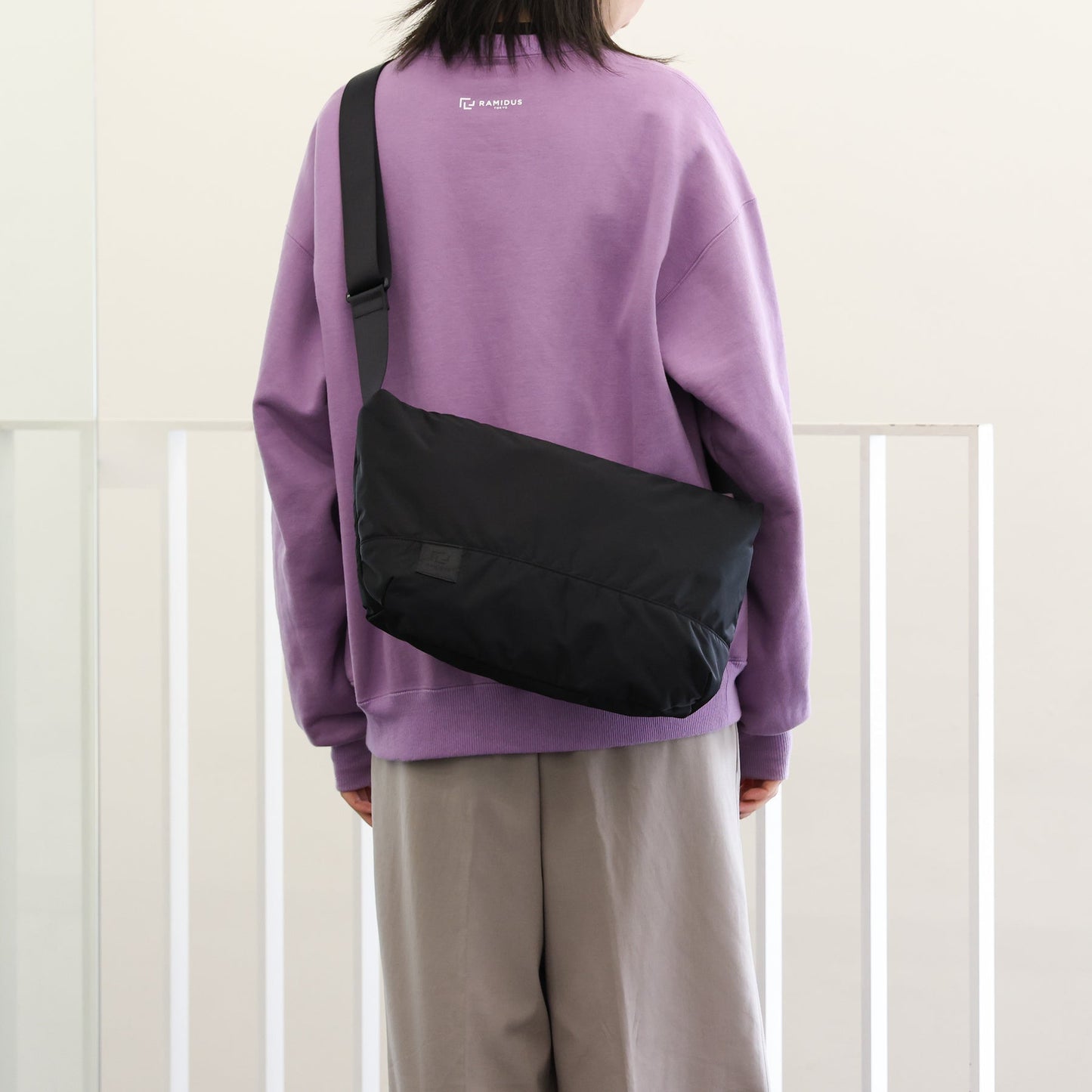 這款單肩包擁有優美的弧線輪廓。內部設有一個網狀插袋,適合存放手機和小件物品。柔軟貼身的設計使其適用於從日常使用到旅行的各種場合。
