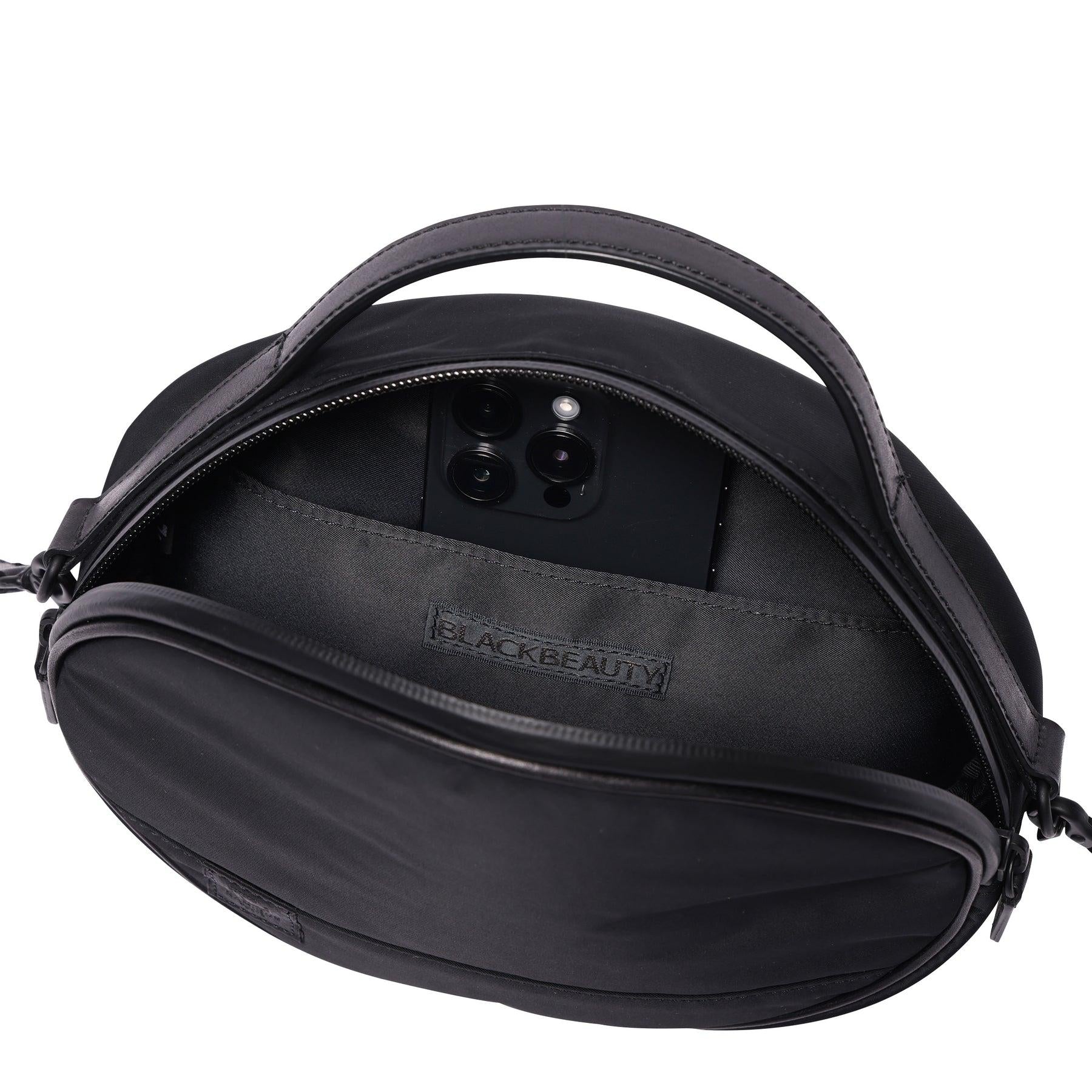橢圓形輪廓的單肩包,既可斜挎,也可作為手提包使用。內袋大小恰好可放置手機。以品牌標誌性的 BLACK BEAUTY 面料為基礎,邊緣飾以國產牛皮,營造出奢華、高品質的感覺。