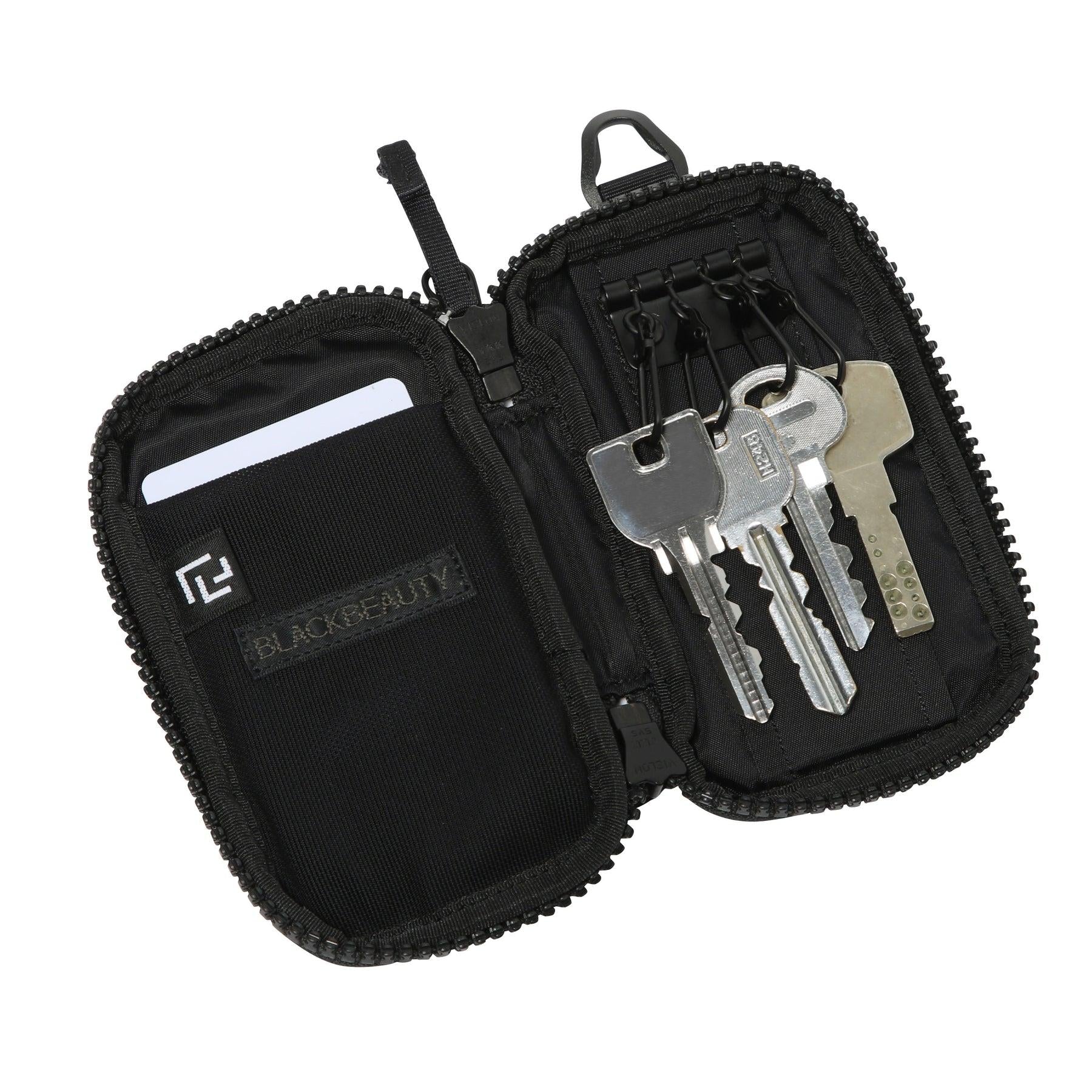鑰匙包採用雙拉鍊開合,方便開合。內部設有四個鑰匙掛鉤和一個卡袋,可放置安全卡和卡片鑰匙。背面設有鑰匙圈和卡片夾,方便攜帶。內部設計實用,適合日常使用。