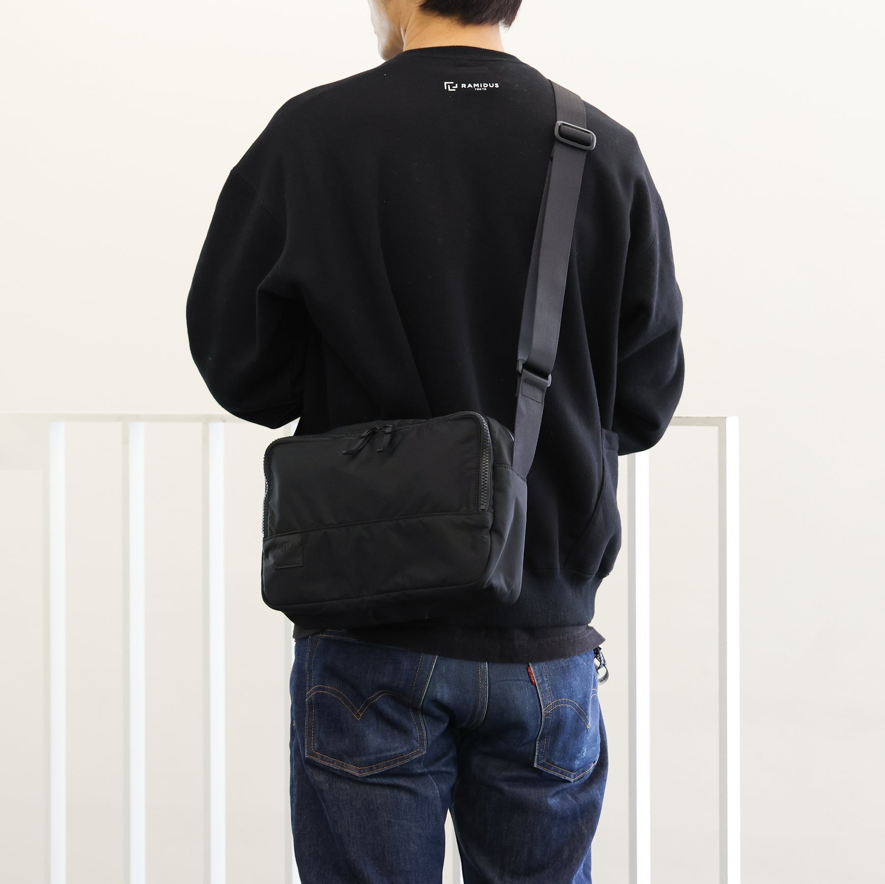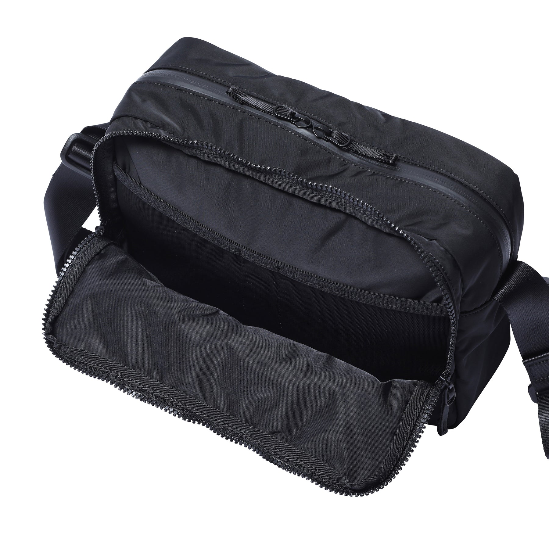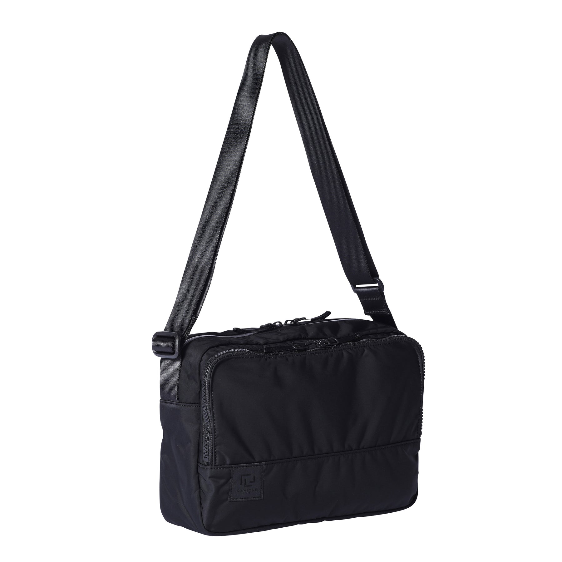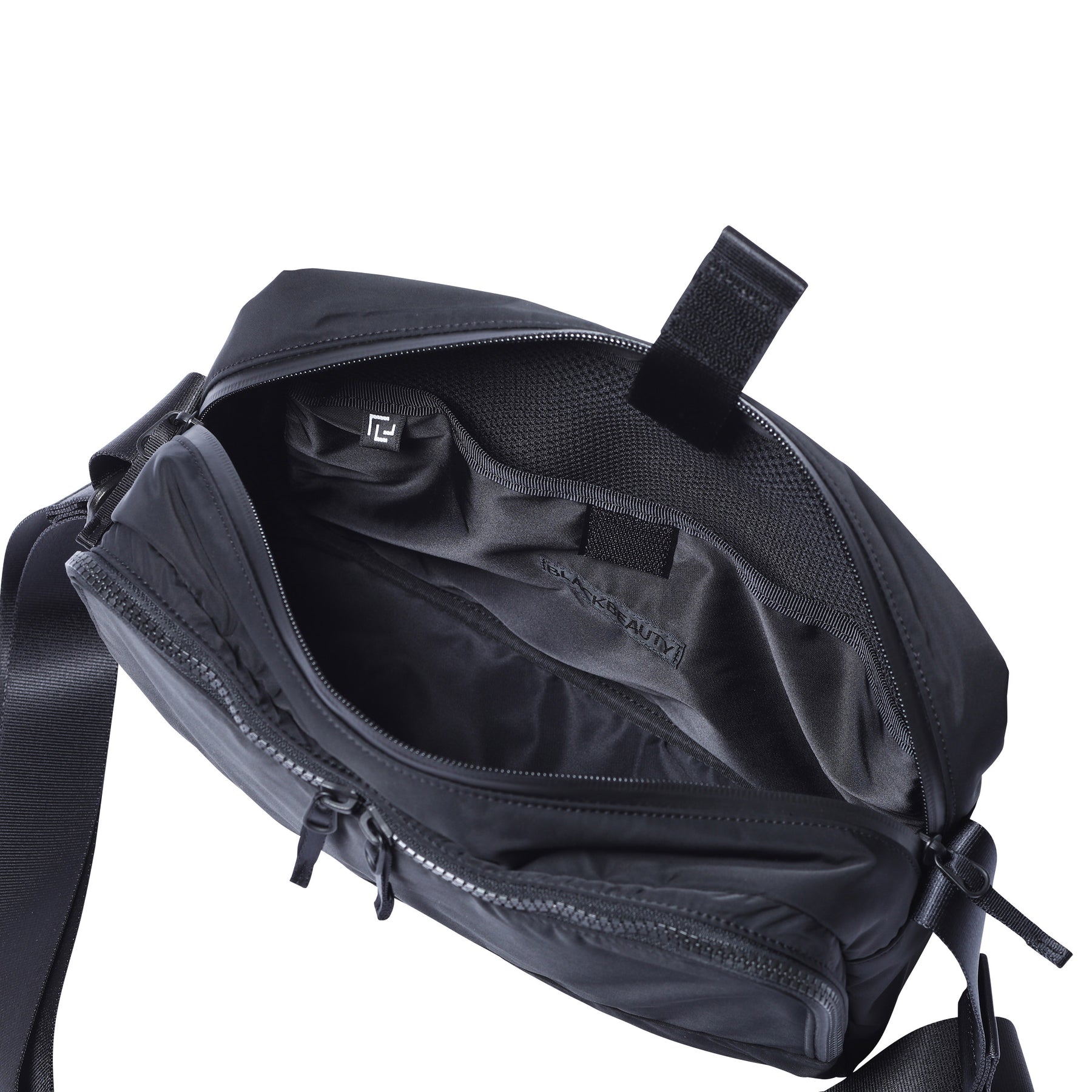 方形輪廓單肩包,可容納一個 500 毫升塑料瓶和一個長錢包,橫向設計,適合在城市中使用。正面有一個大的拉鍊口袋,主隔層內部有一個軟墊平板電腦隔層。