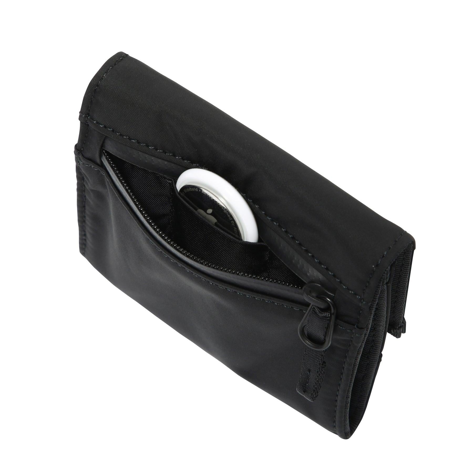三折錢包,帶鉤扣開合,兼具實用性和時尚感。背面配有拉鍊零錢口袋,操作順暢。內部設有 AirTag 儲物袋,可防止意外丟失。內部設有一個紙幣收納袋和一個卡片收納袋,確保充足的存儲空間。它易於整理,既可用於日常使用,也可用於商務和旅行。