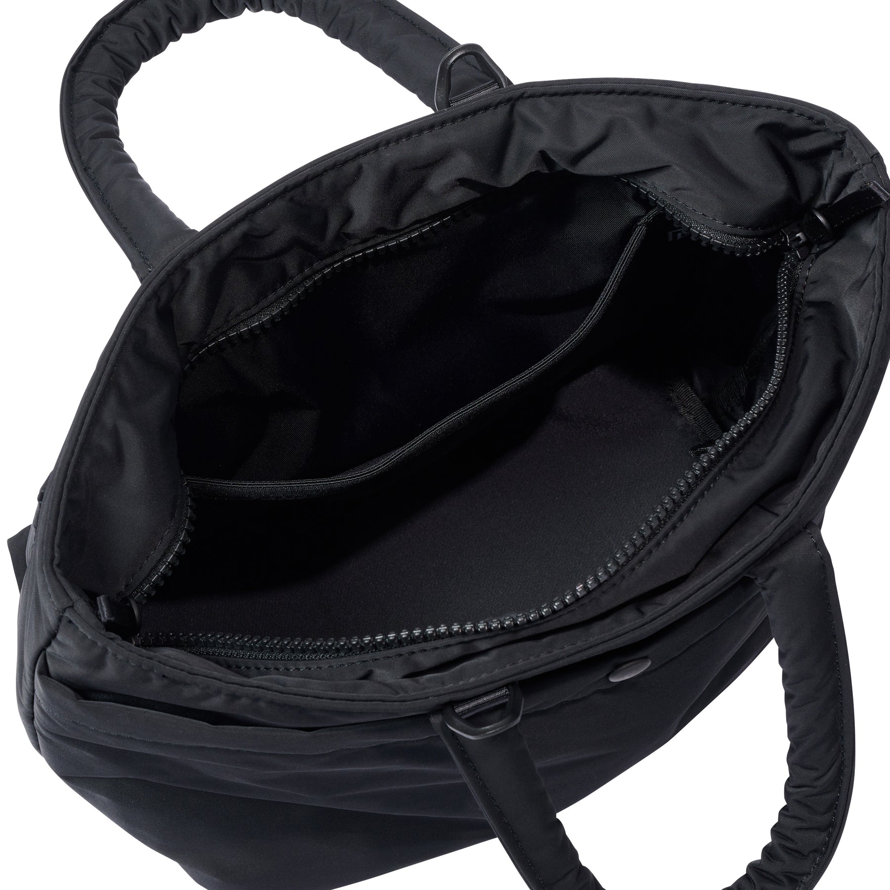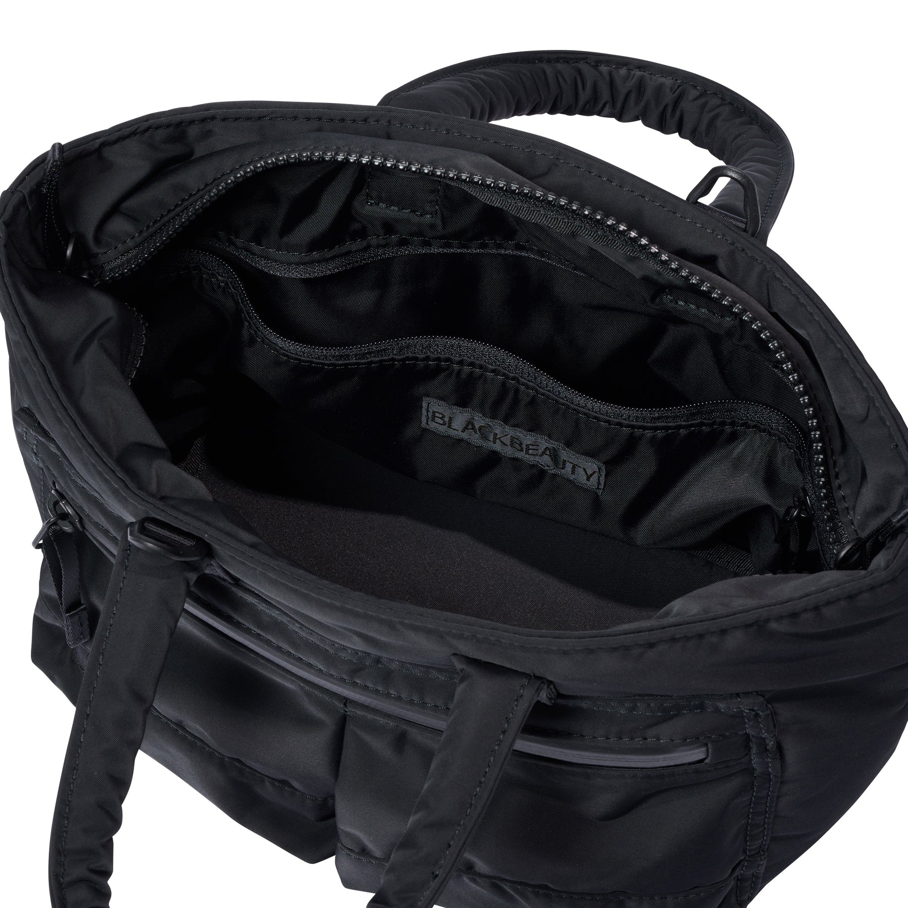 內部:拉鍊口袋、網狀插槽口袋和品牌名稱標籤。