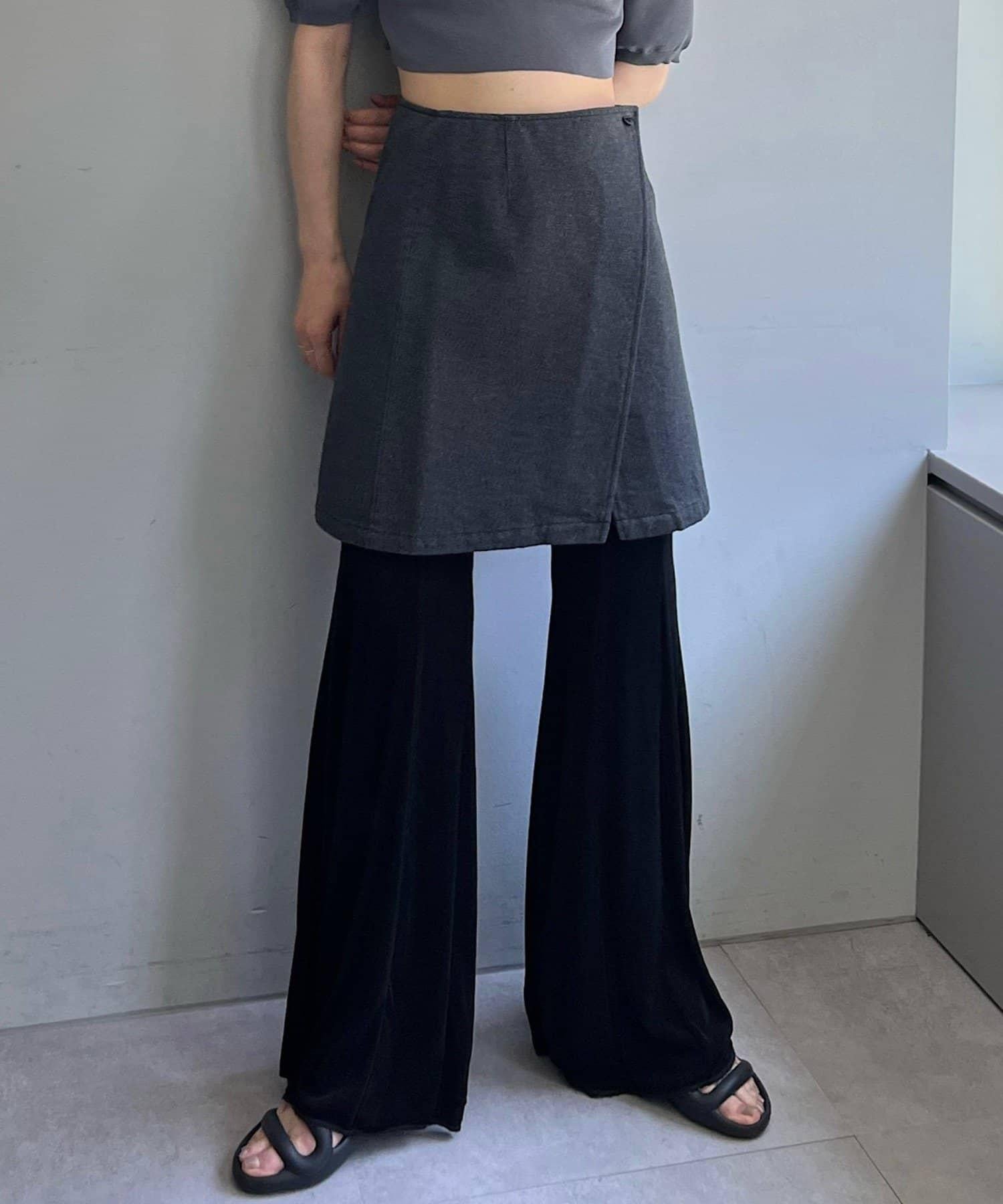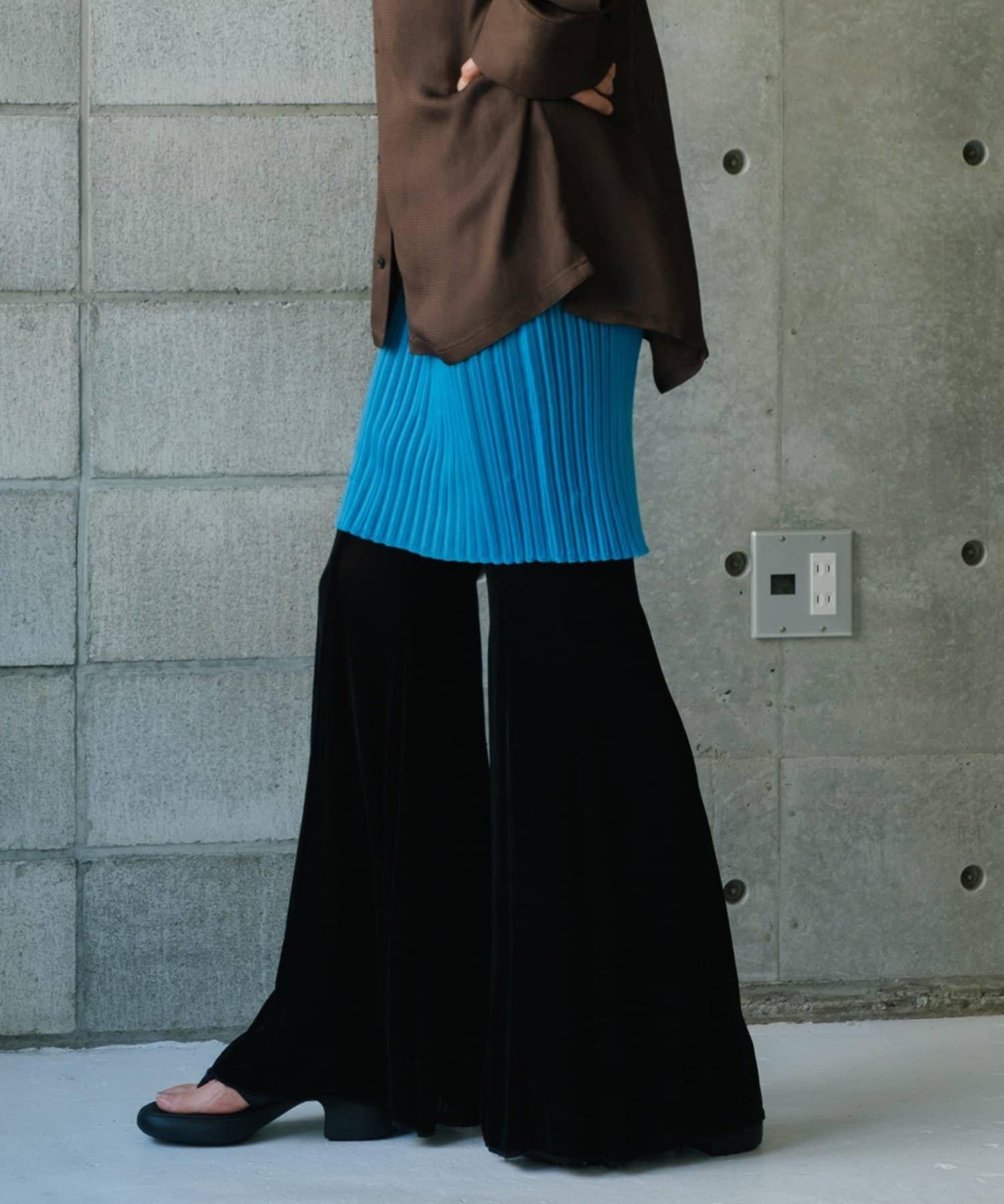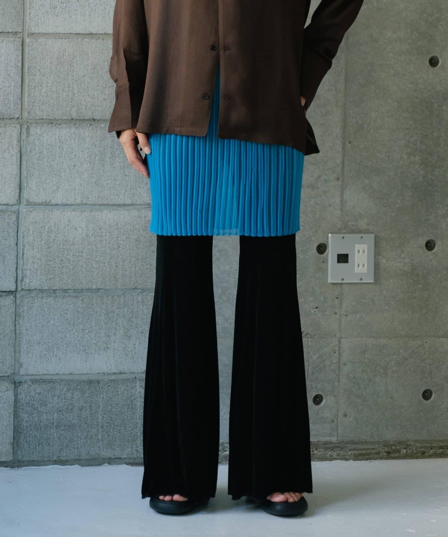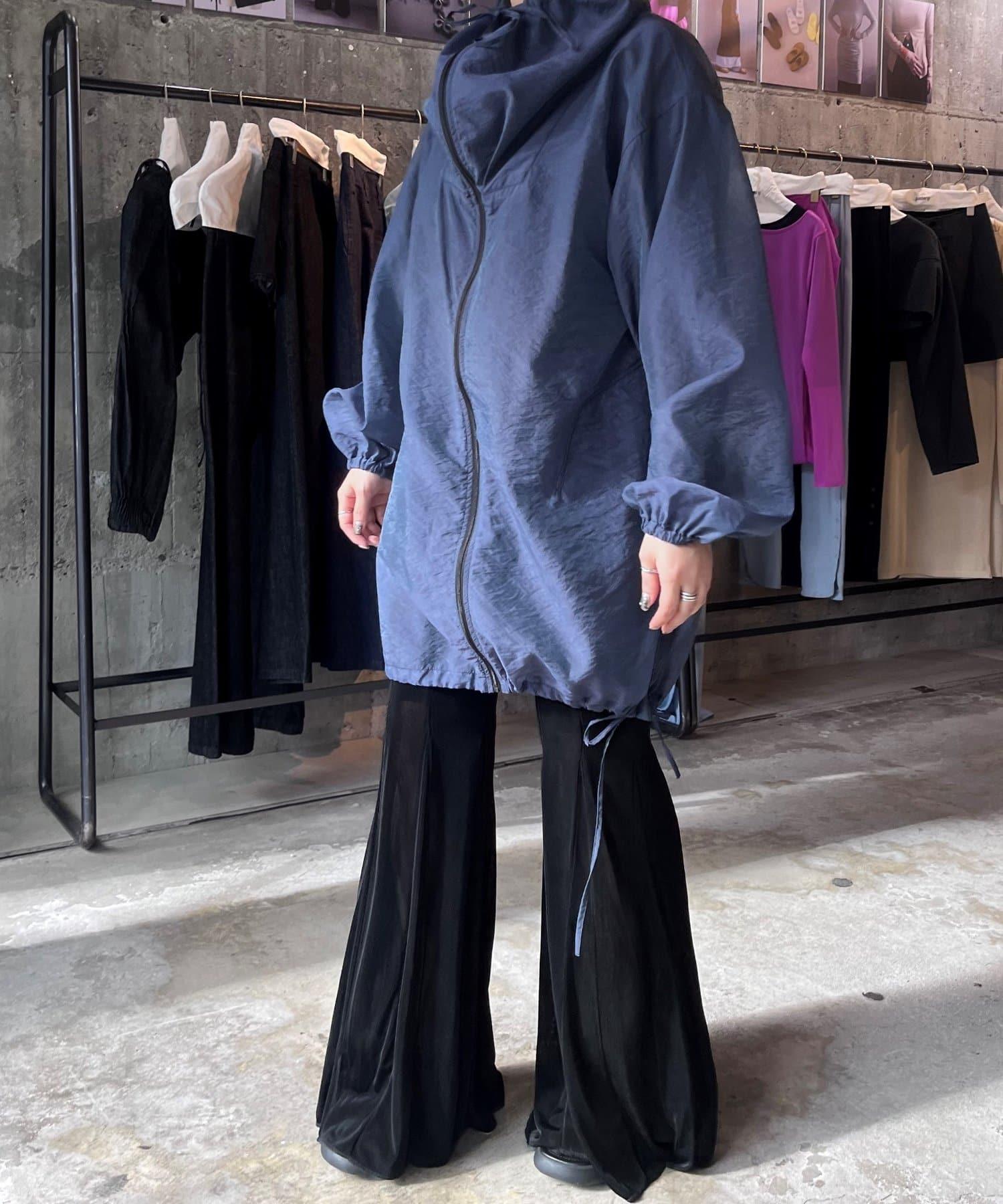 同樣面料的透視羅紋拉鍊裙也可供選擇。本季推薦的穿法是將兩件單品疊穿,並從拉鍊處露出喇叭褲。