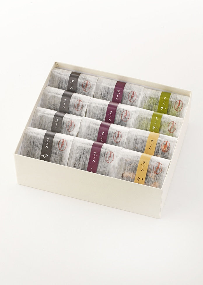 四種黑豆糖果的組合,每一種都是由特定品種的黑豆精心製作而成,稱為丹波黑豆。包含Yawara和Fukumi各四袋,Karari和Karari Matcha各兩袋。