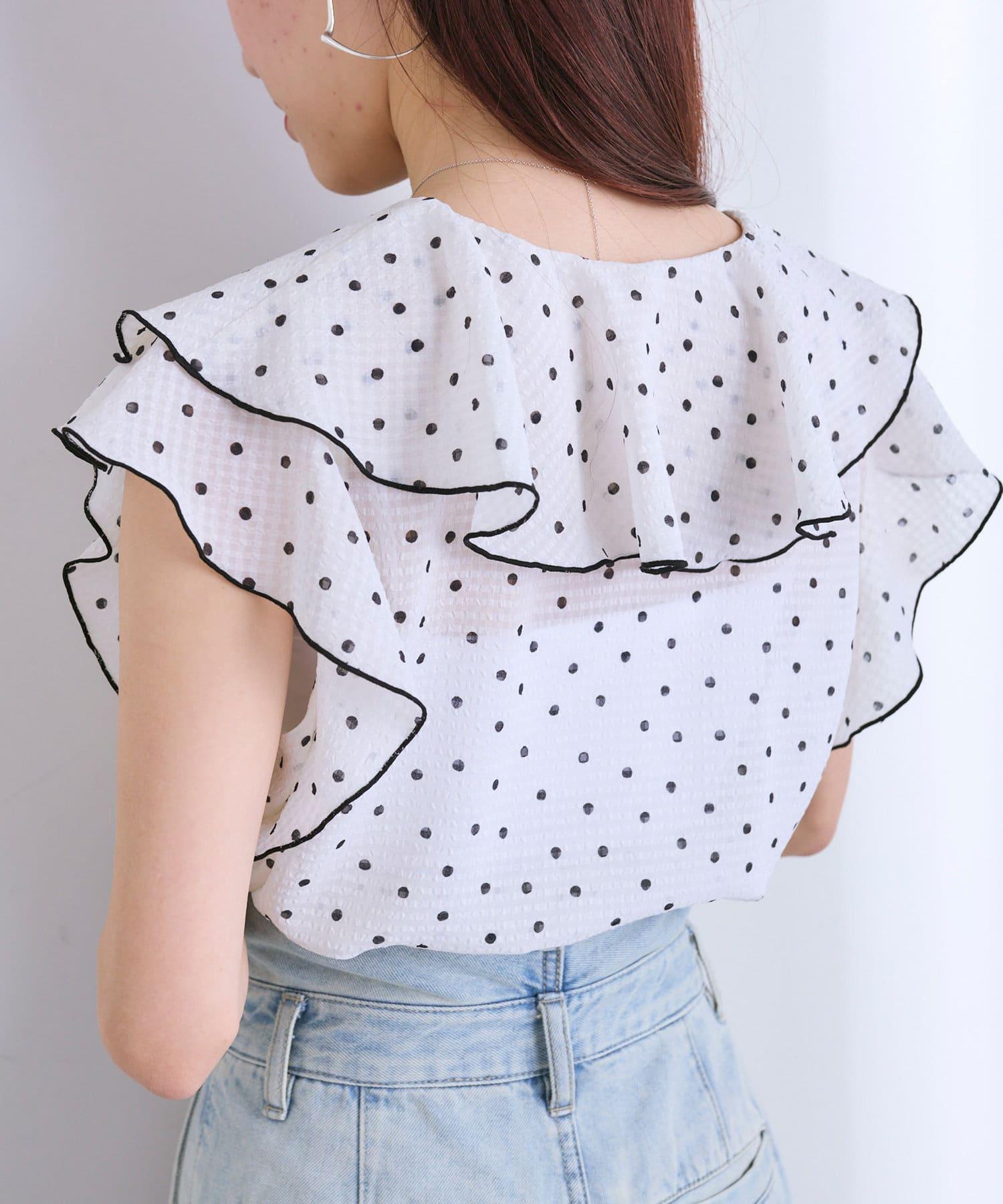 甜美而成熟。單件的圓點圖案上衣就是全場的焦點。