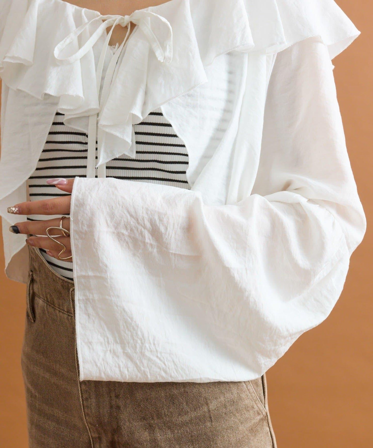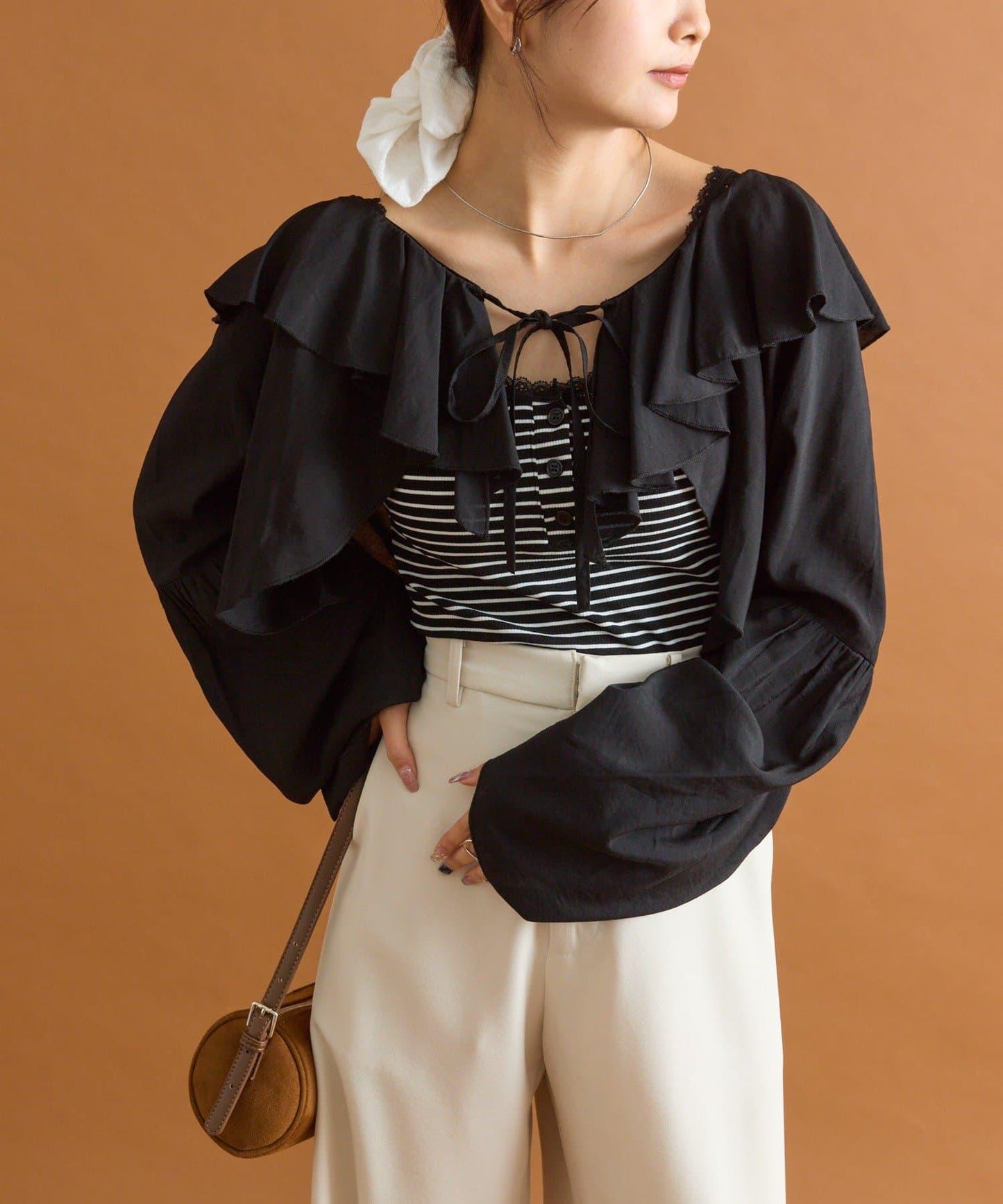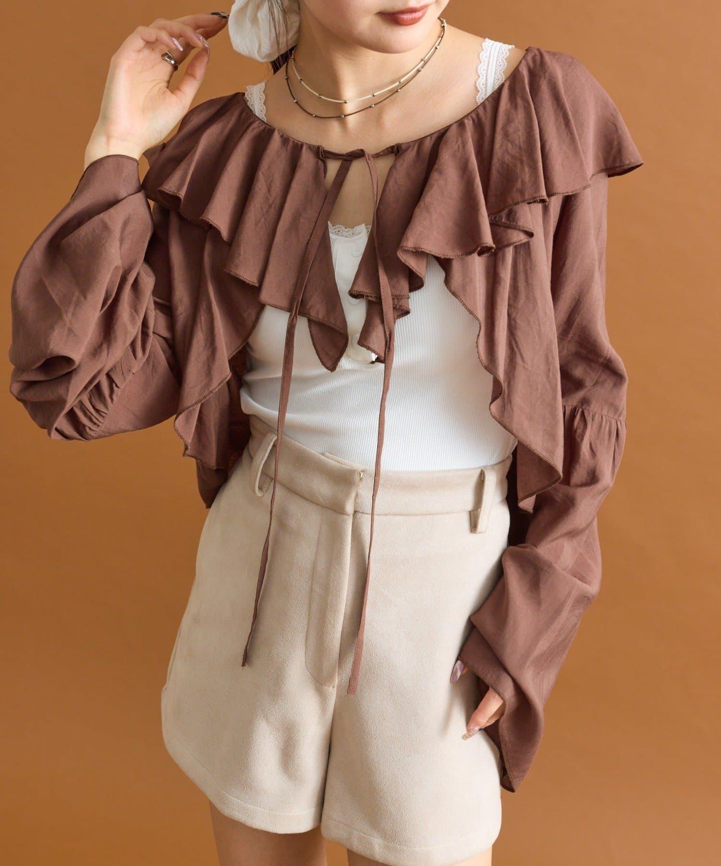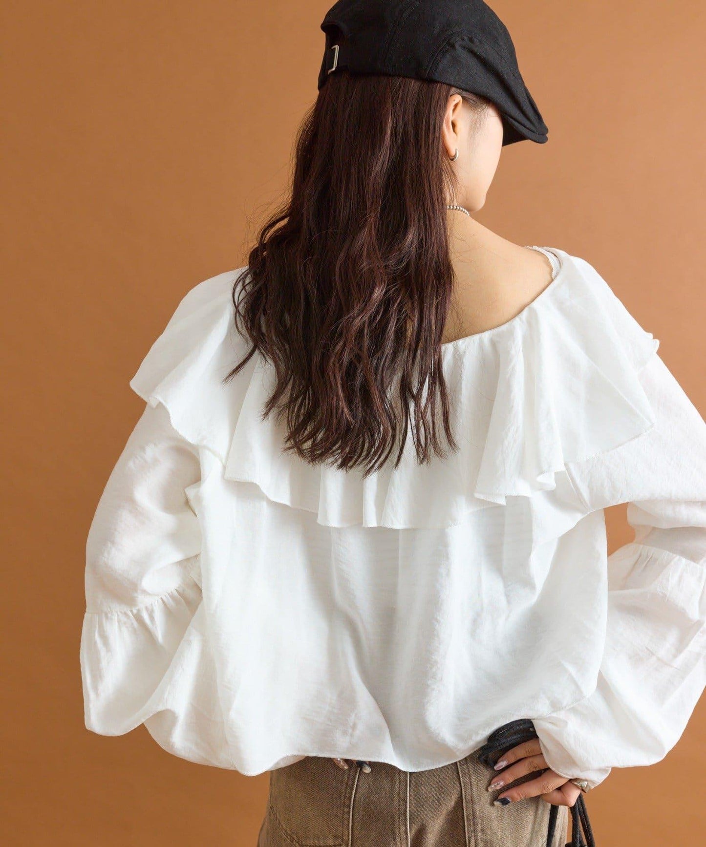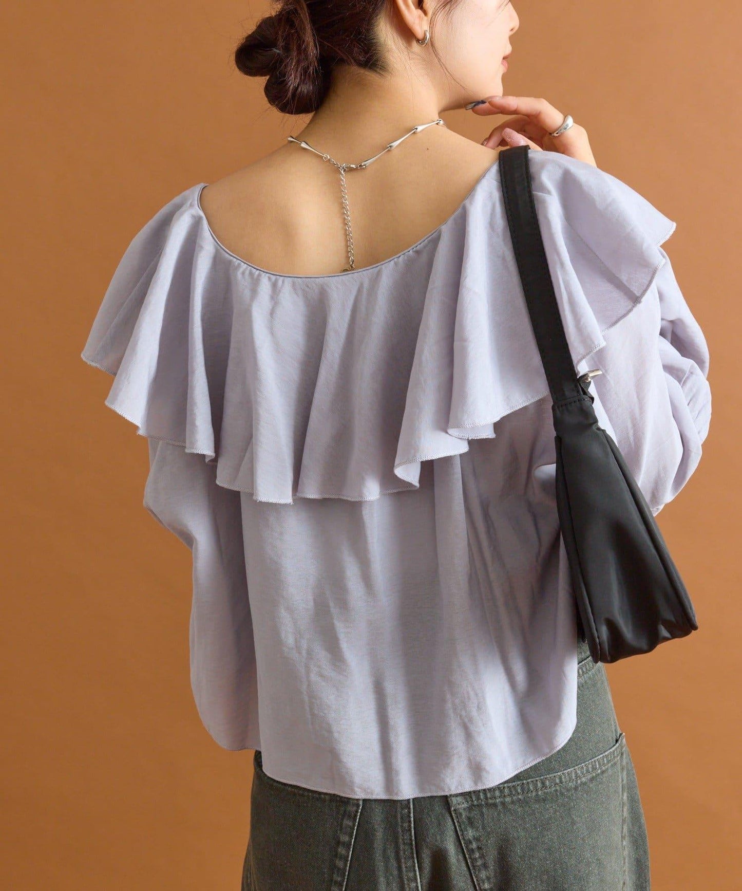 具有存在感的褶邊、大領口和袖口,給人以華麗可愛的印象,是一款帥氣的單品。