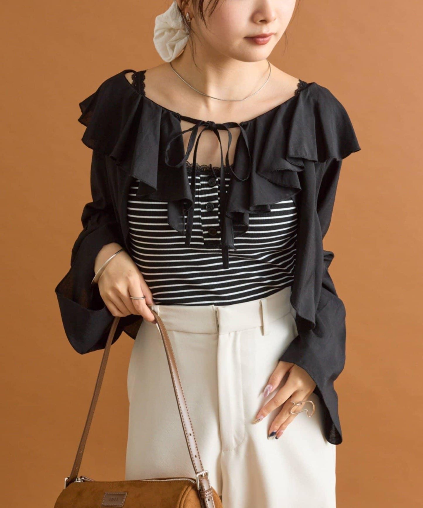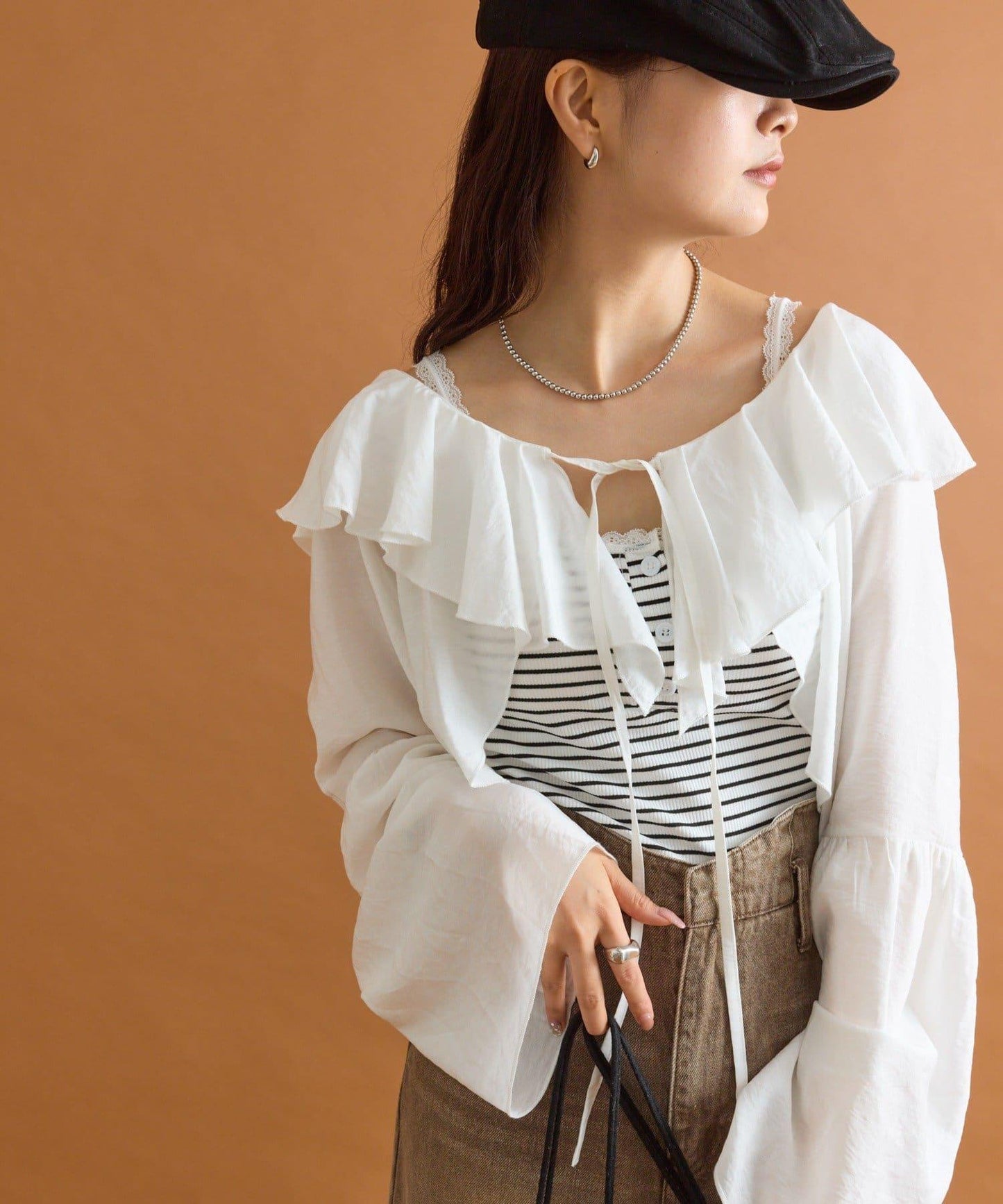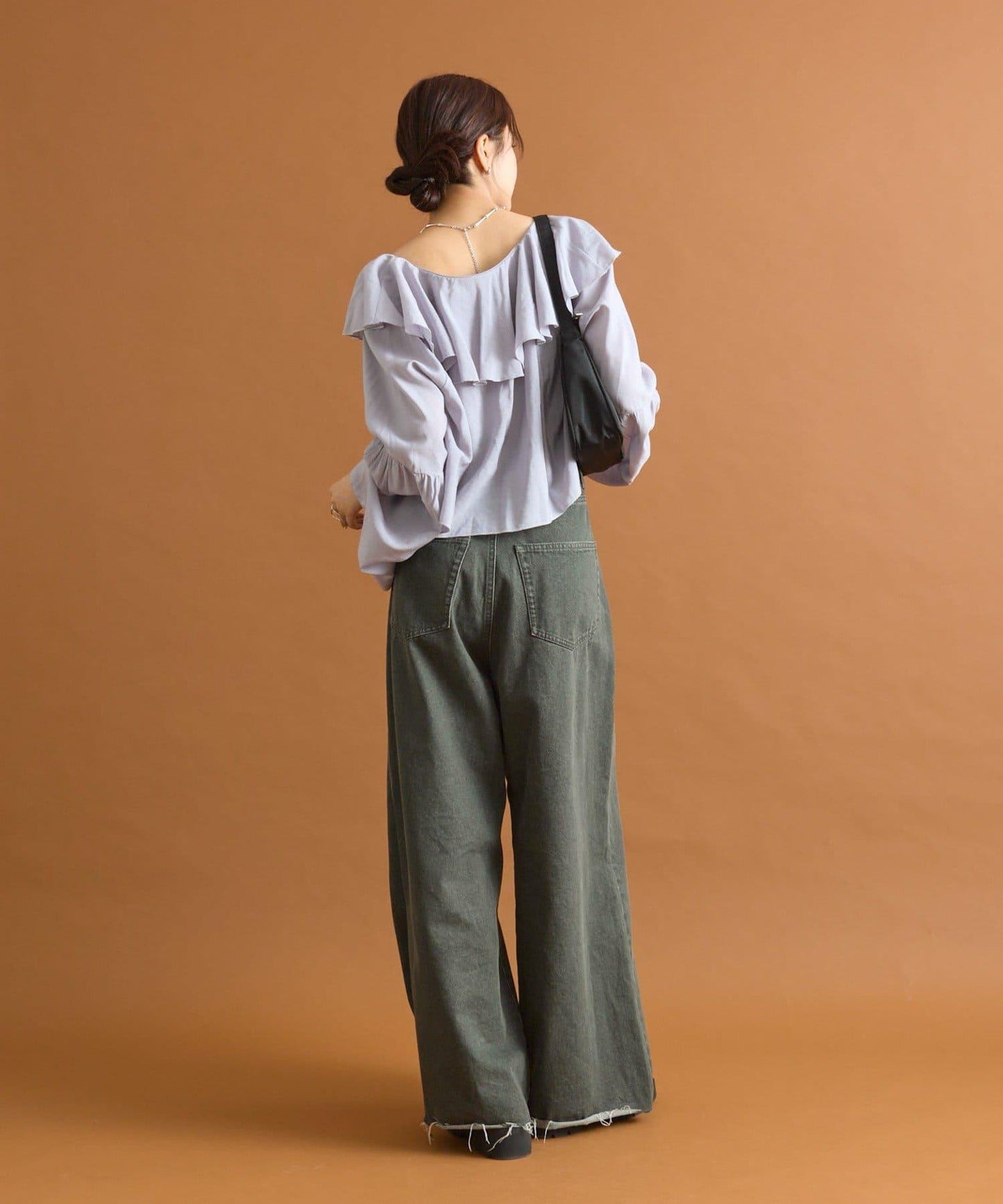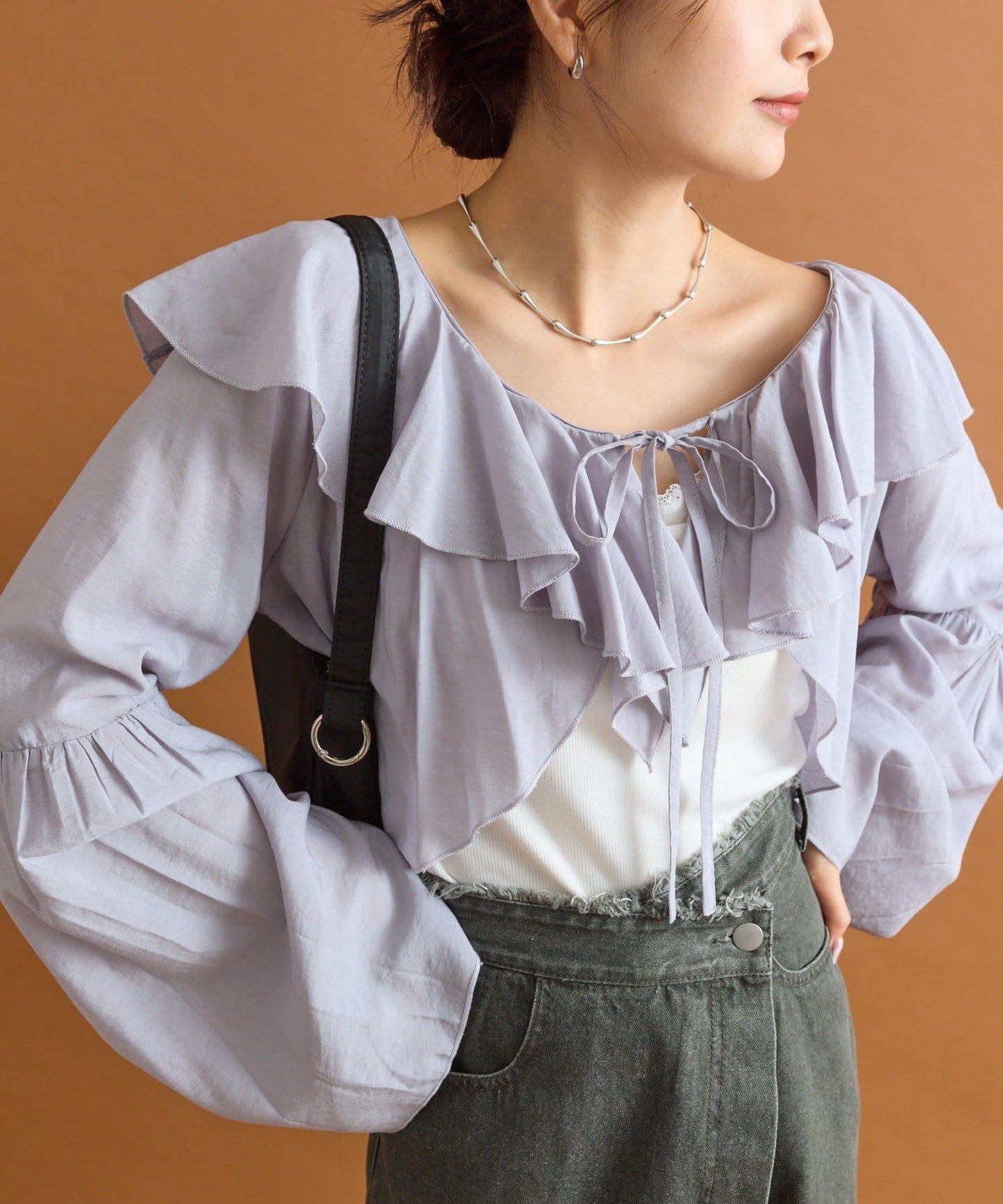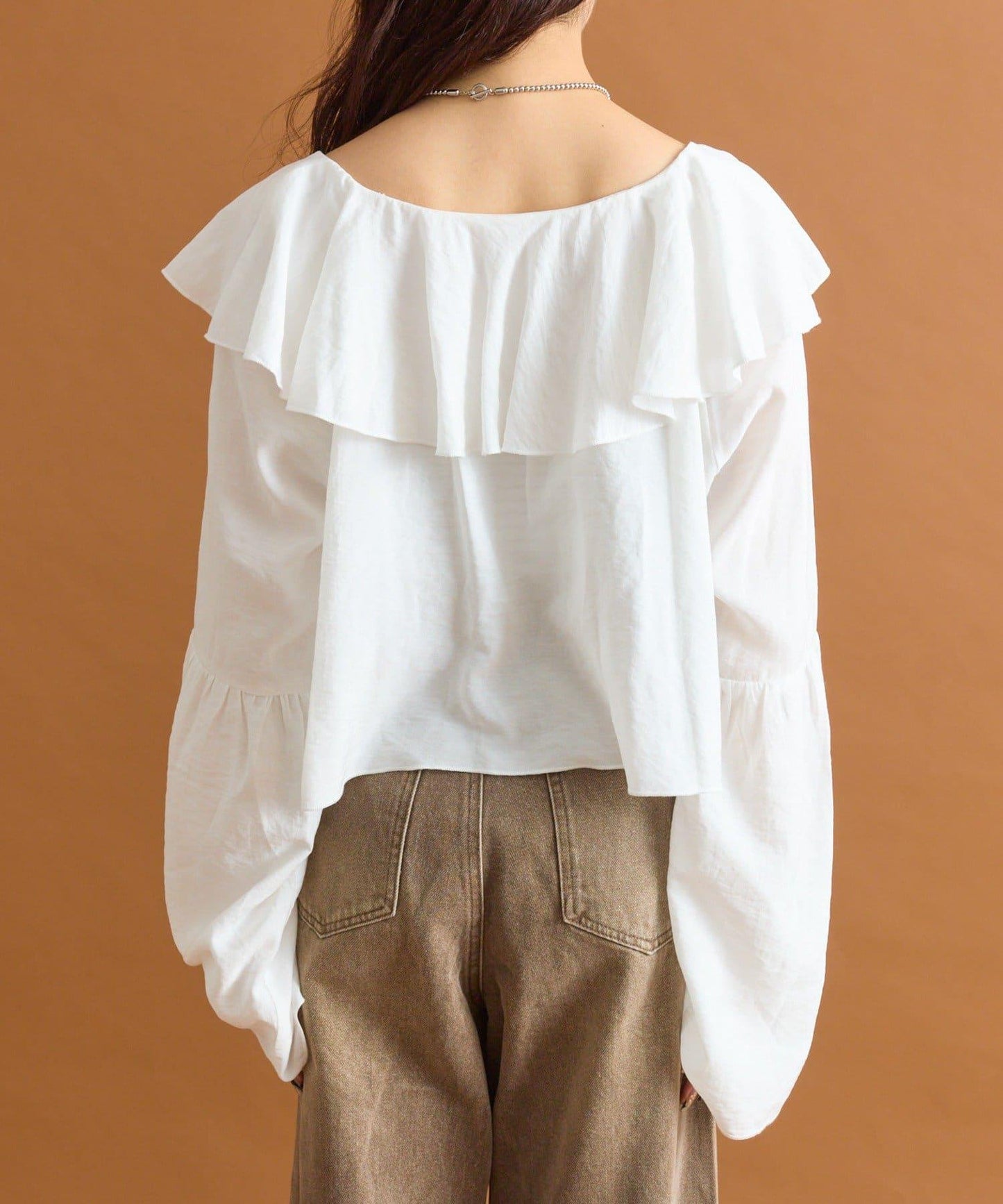 具有存在感的褶邊、大領口和袖口,給人以華麗可愛的印象,是一款帥氣的單品。