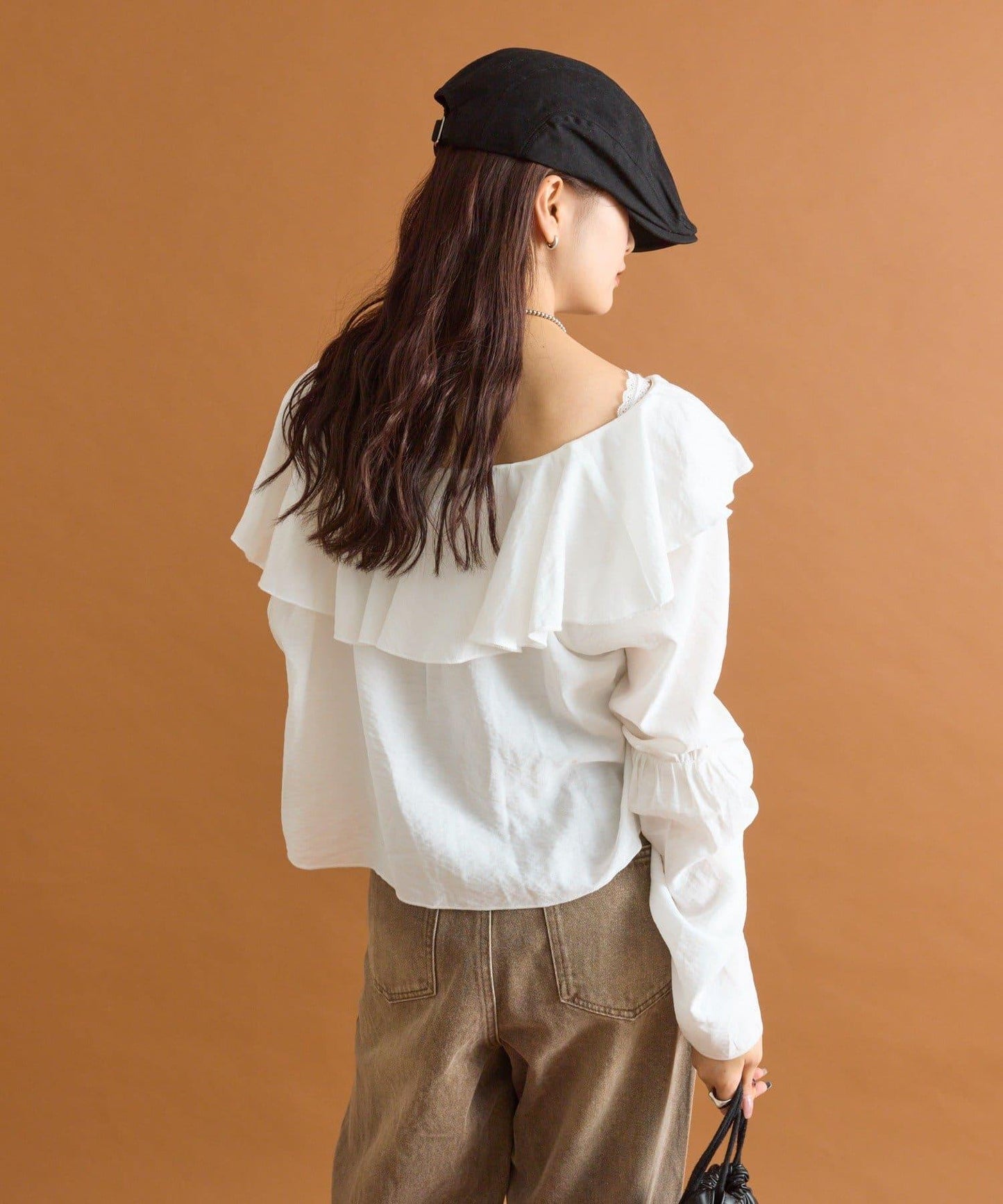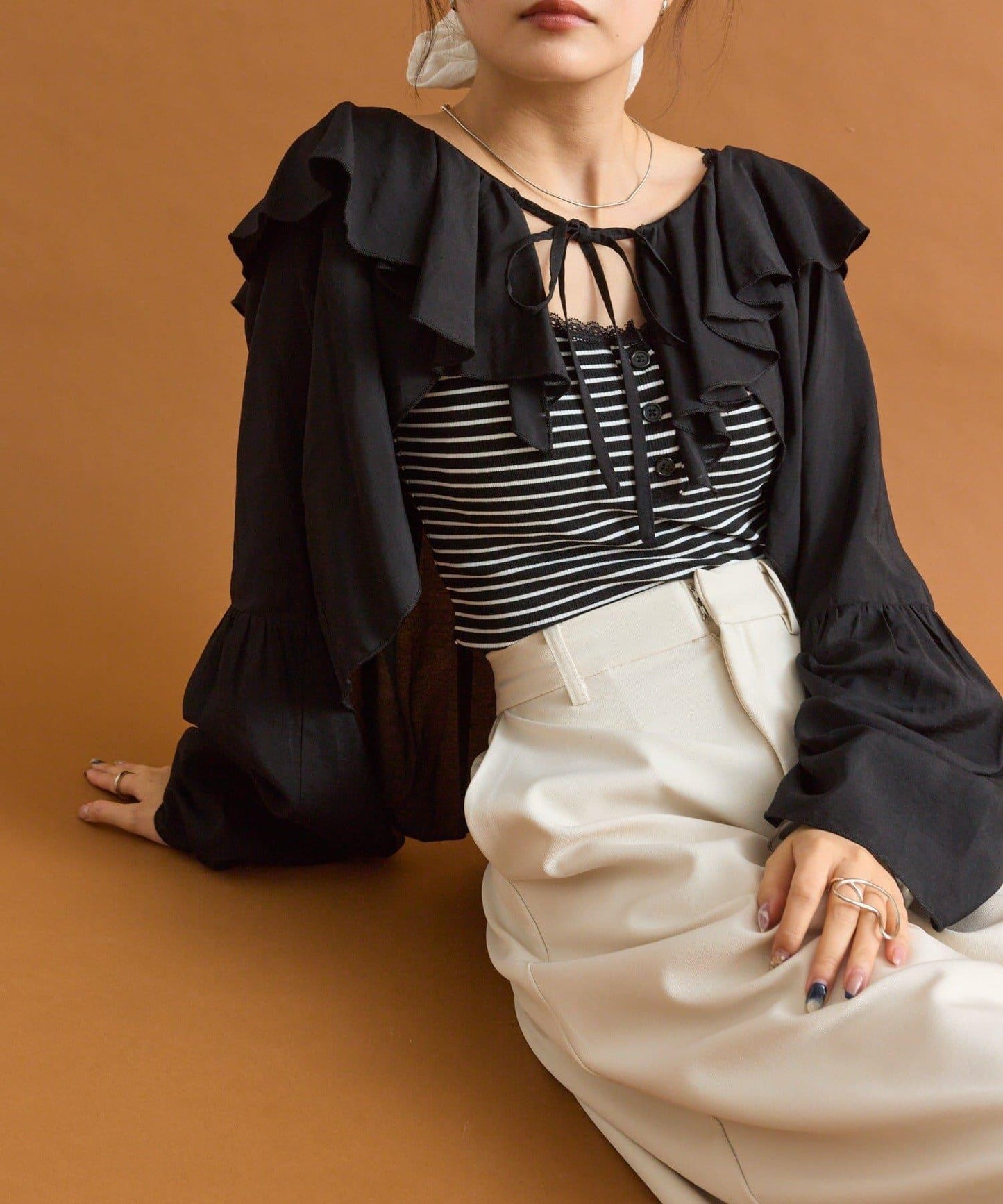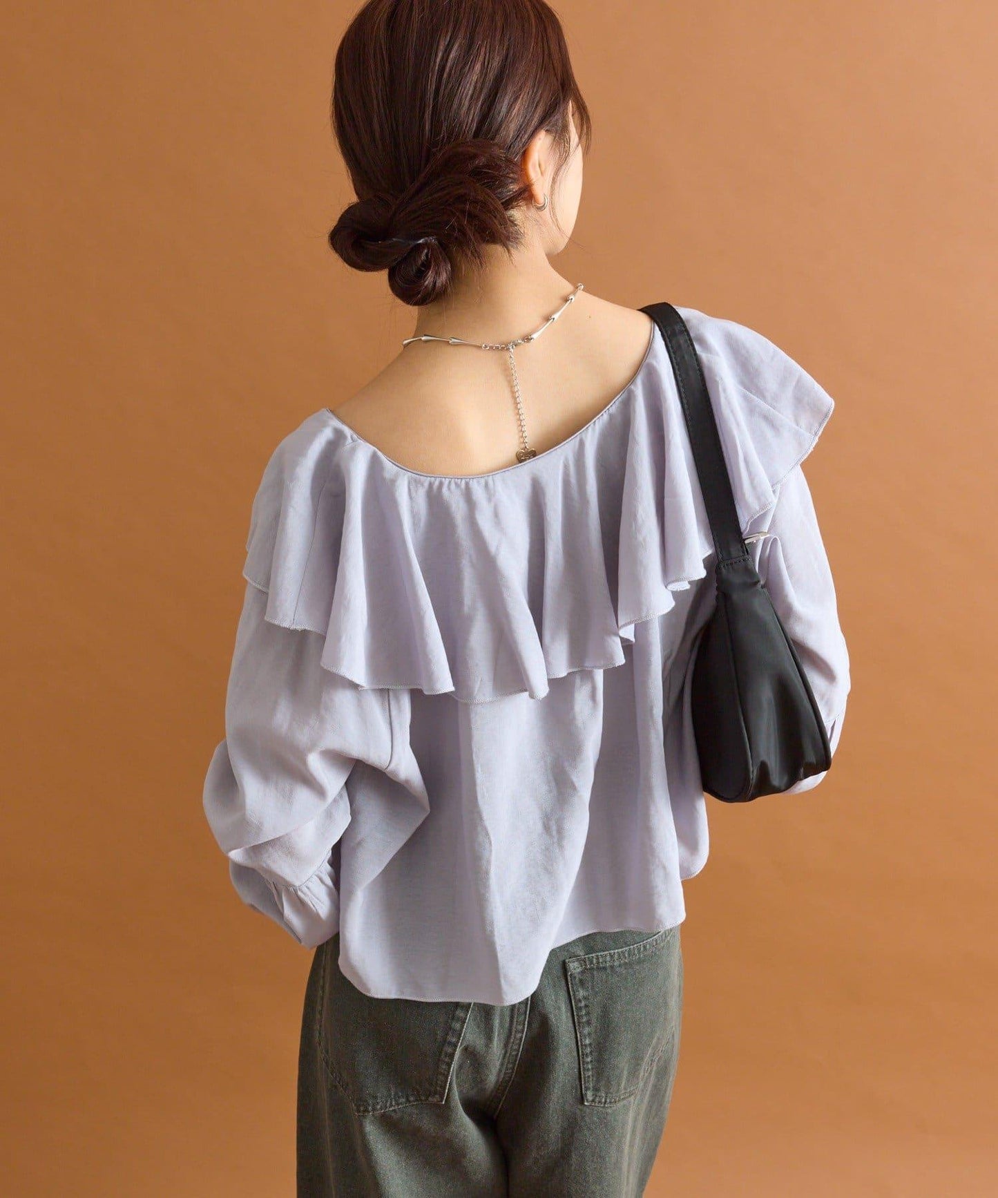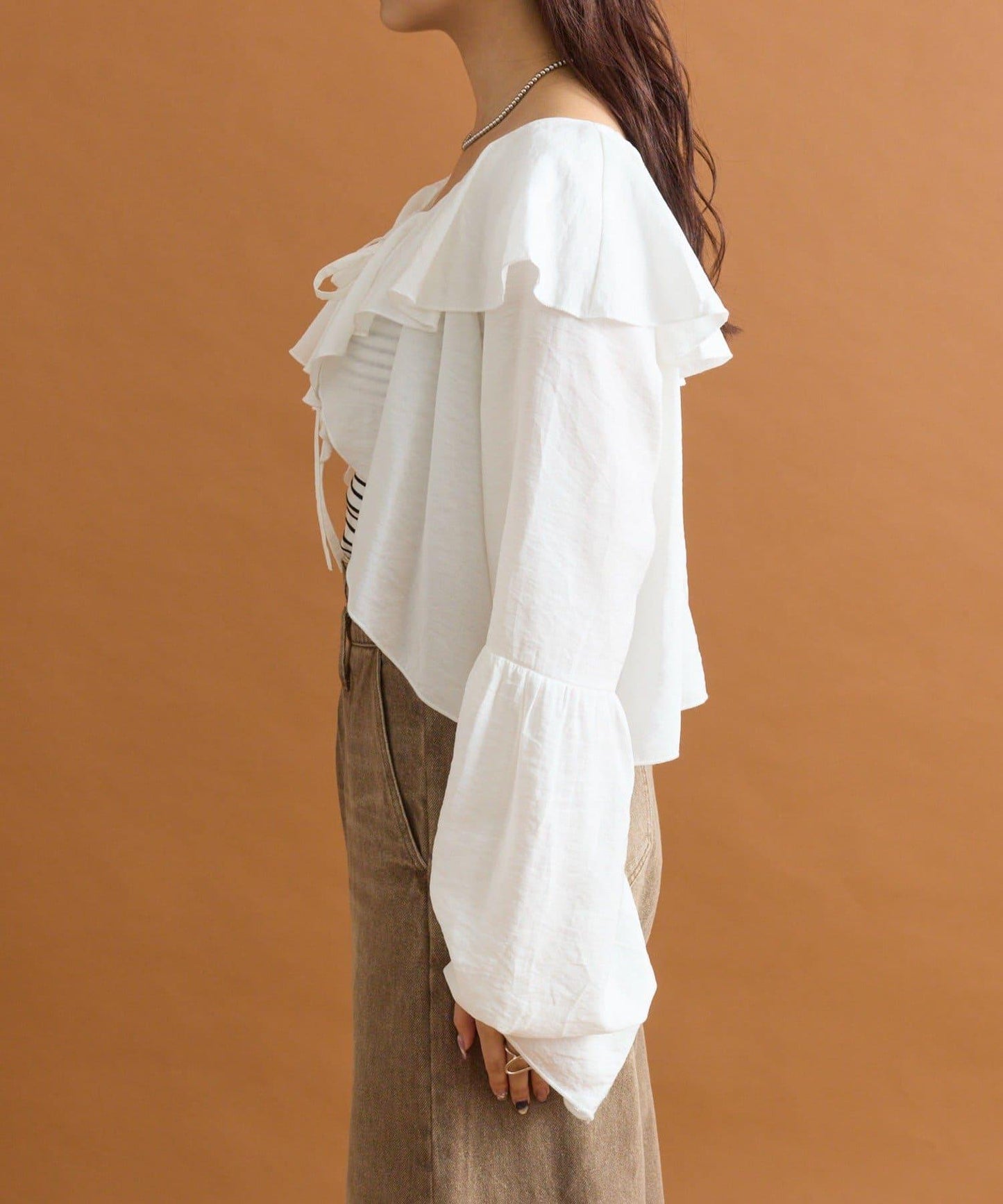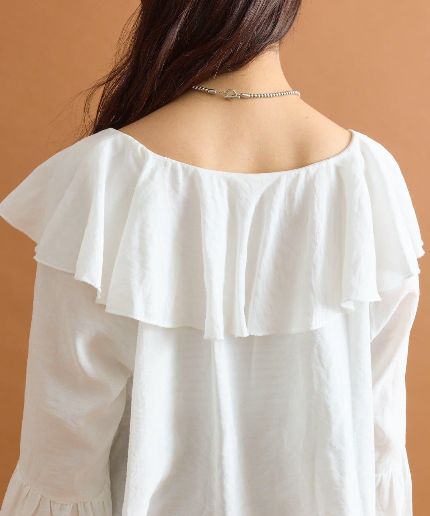 具有存在感的褶邊、大領口和袖口,給人以華麗可愛的印象,是一款帥氣的單品。