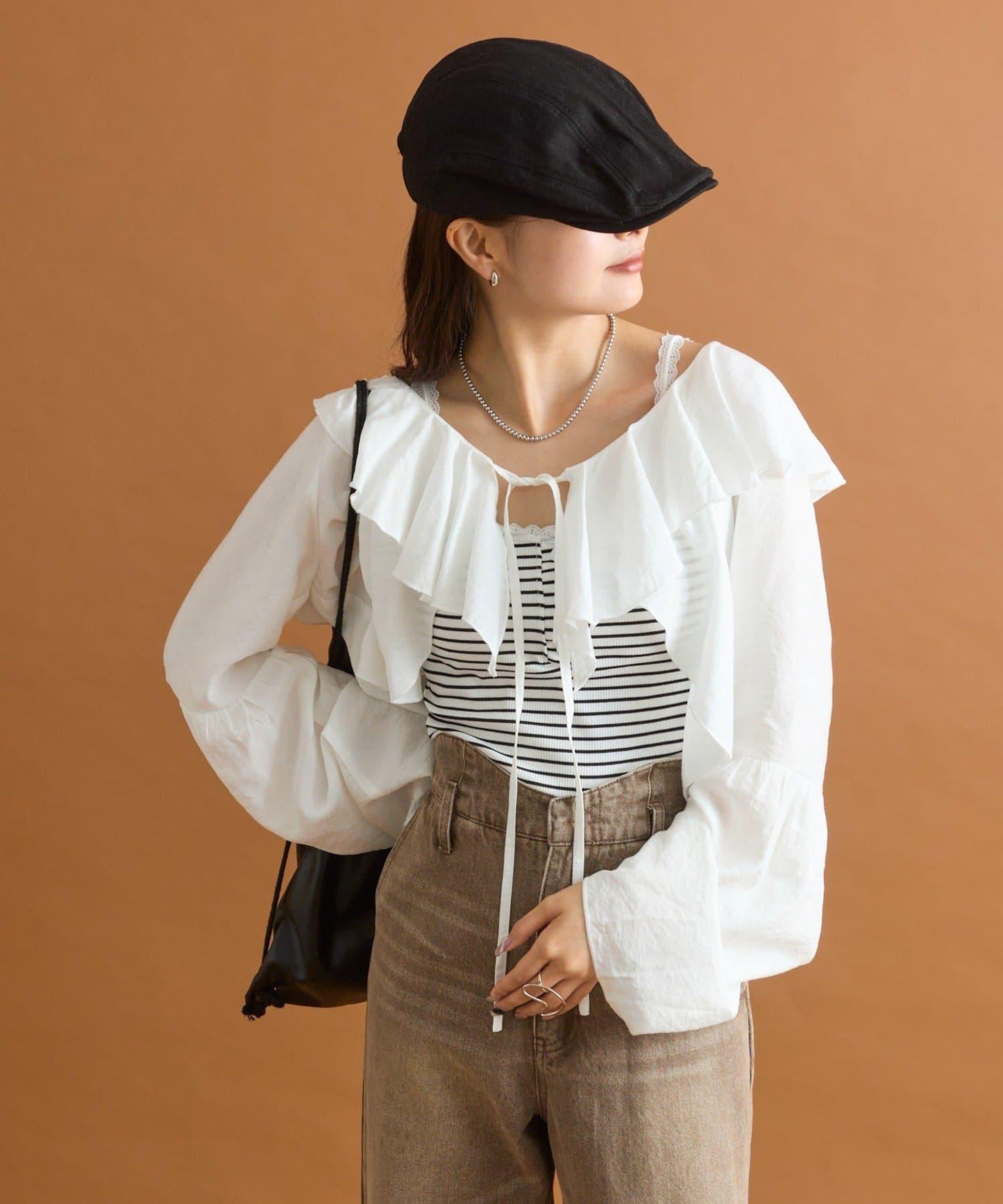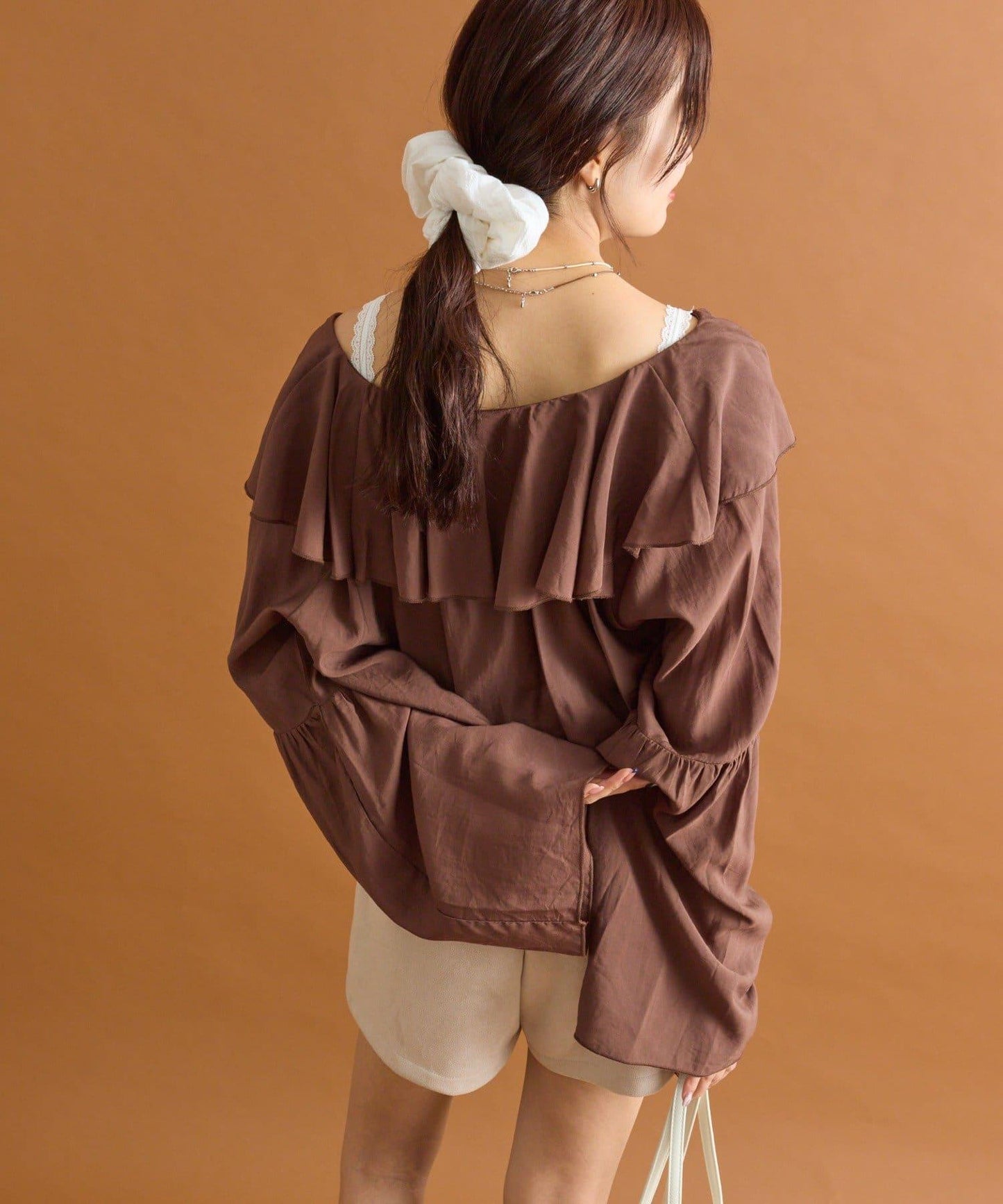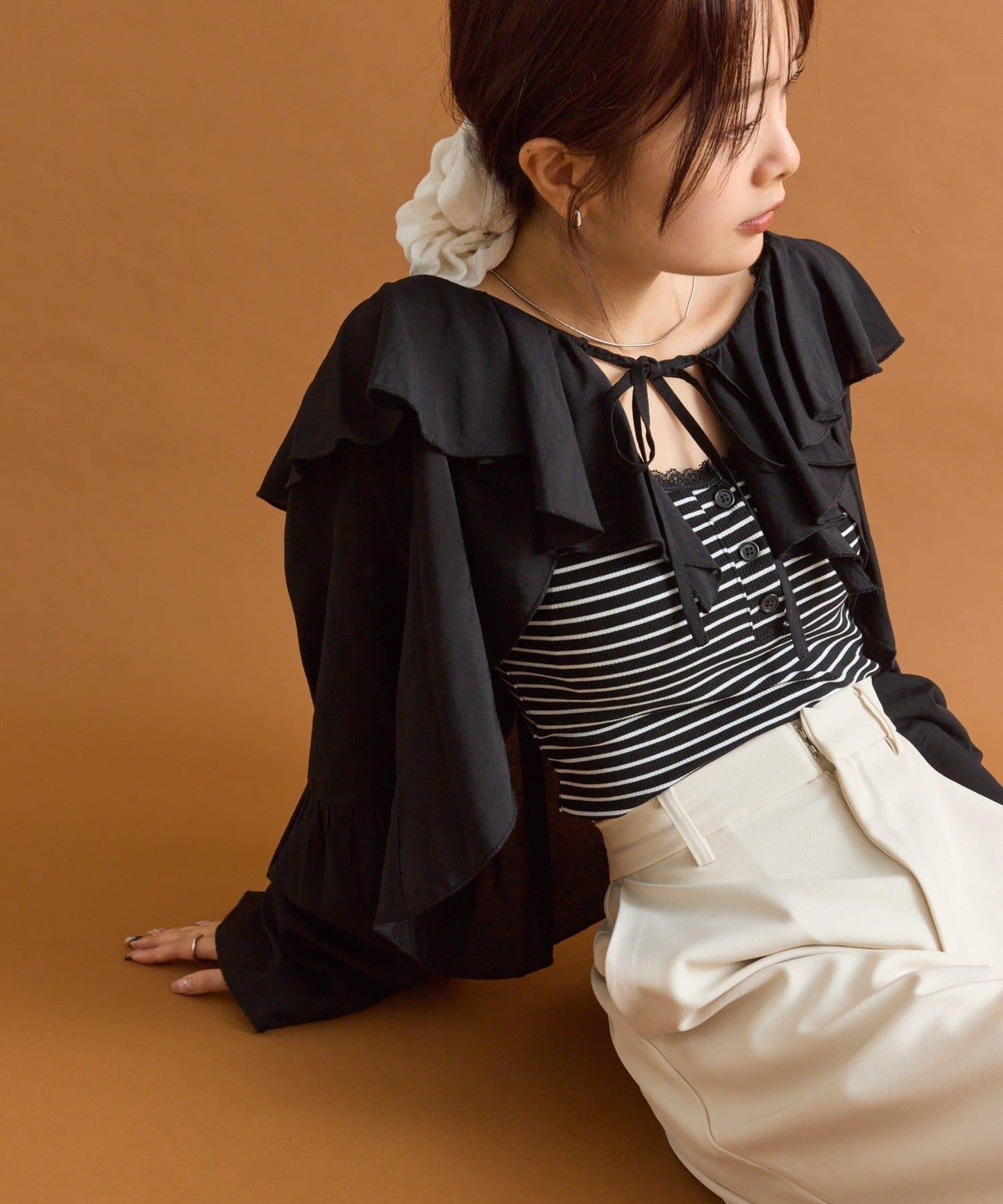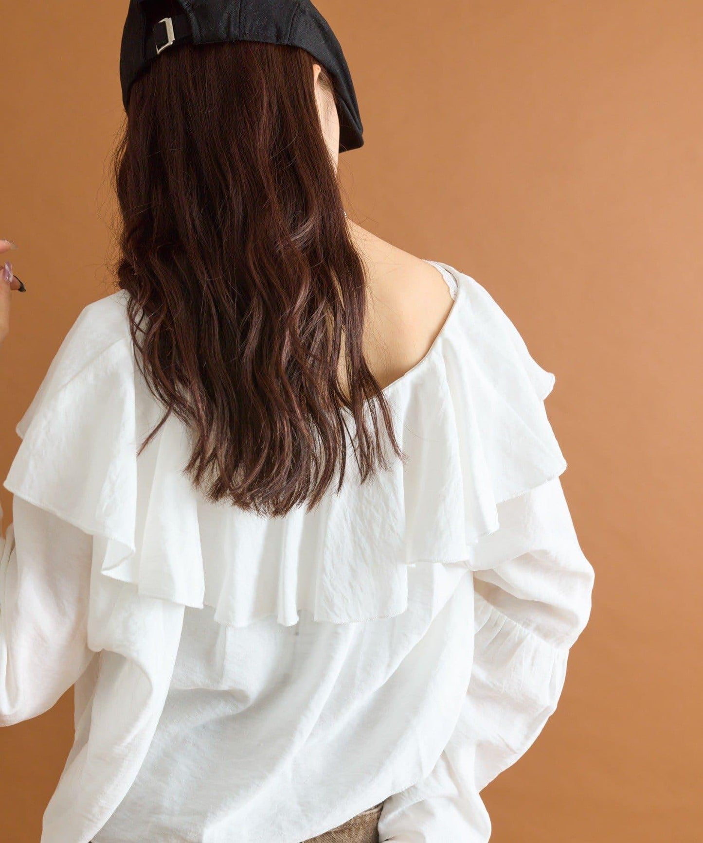 具有存在感的褶邊、大領口和袖口,給人以華麗可愛的印象,是一款帥氣的單品。