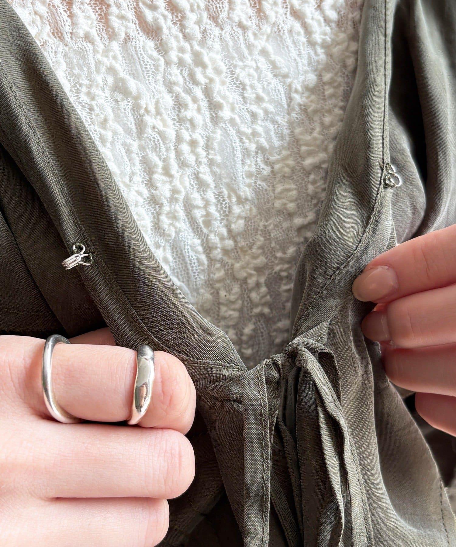 前部設計有掛鉤和絲帶,因此可以鬆鬆垮垮地繫緊,也可以完全脫下作為梭織上衣穿著。