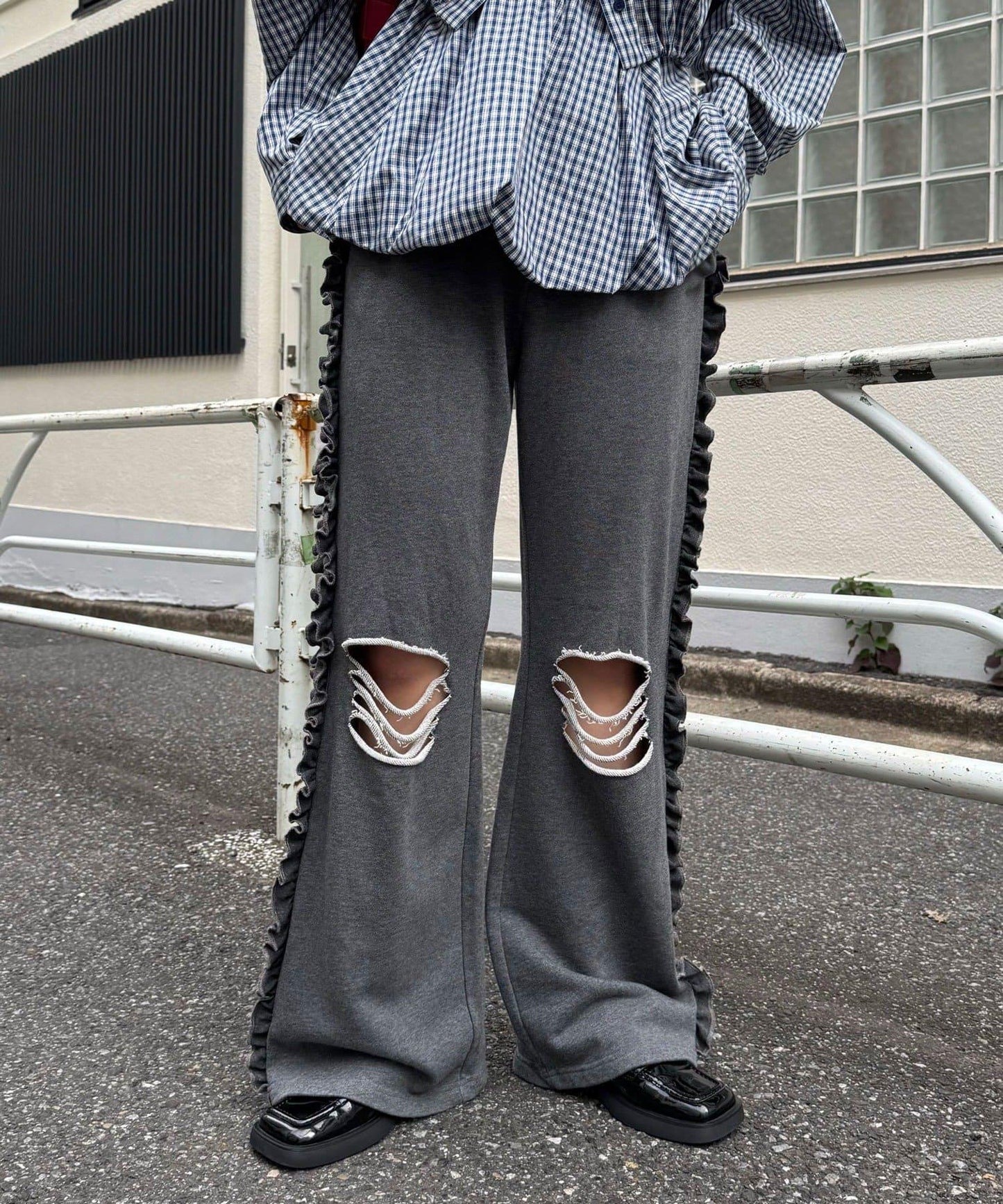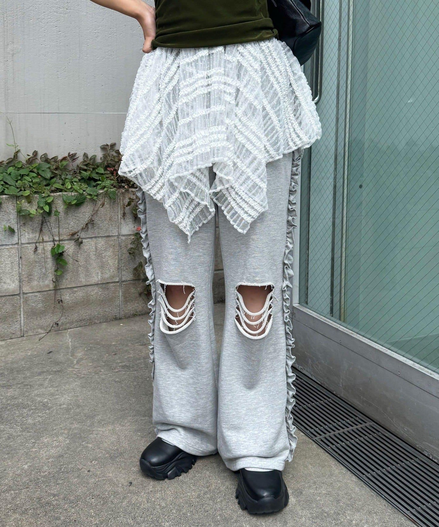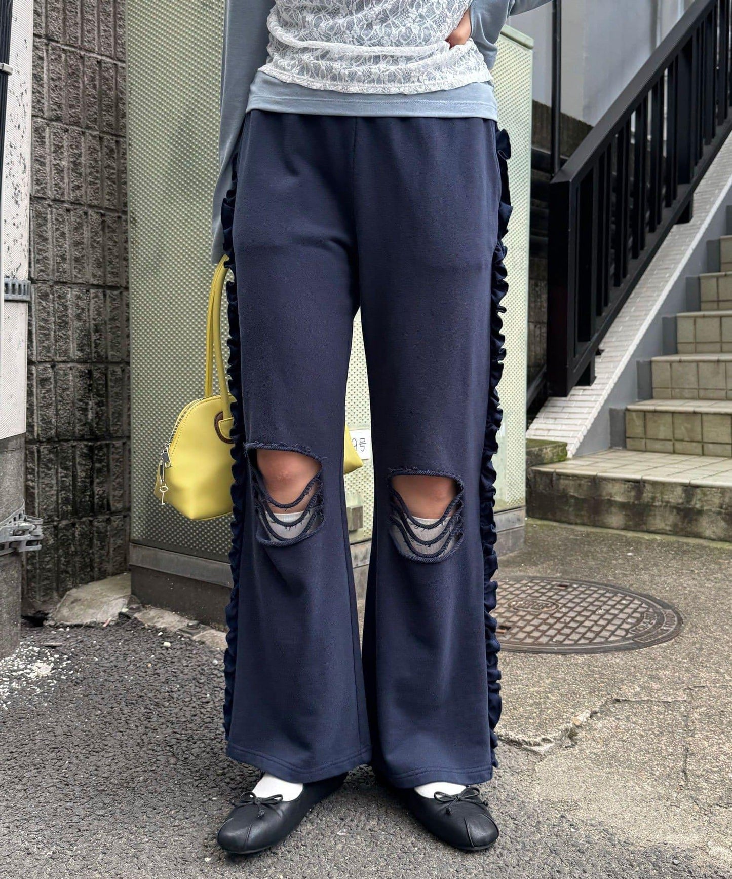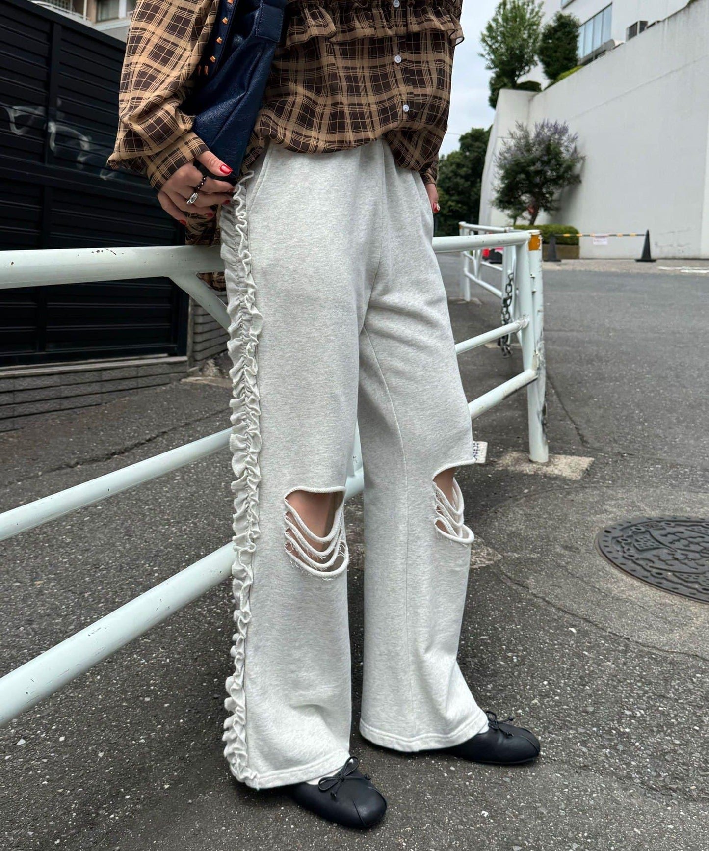 設計運動褲,褶邊帶來甜美感,破損處理帶來寬鬆感。
