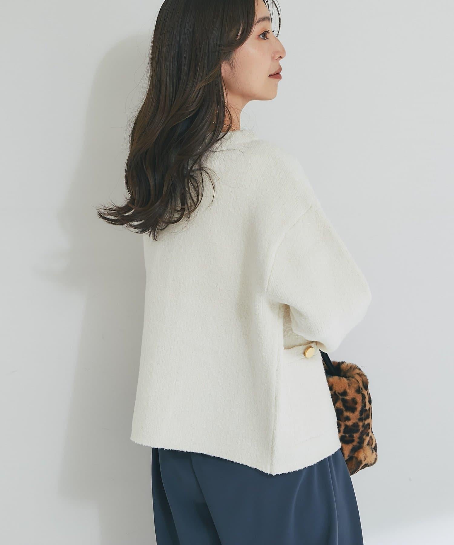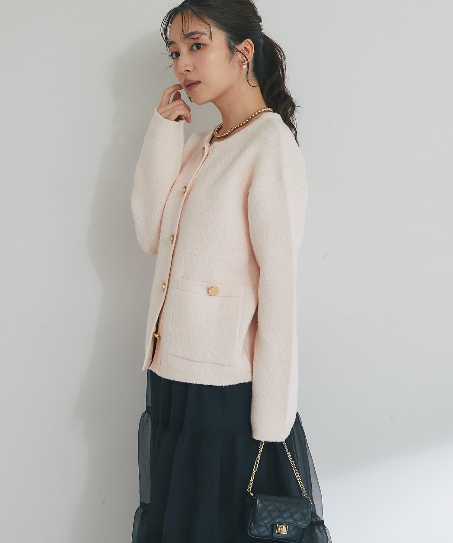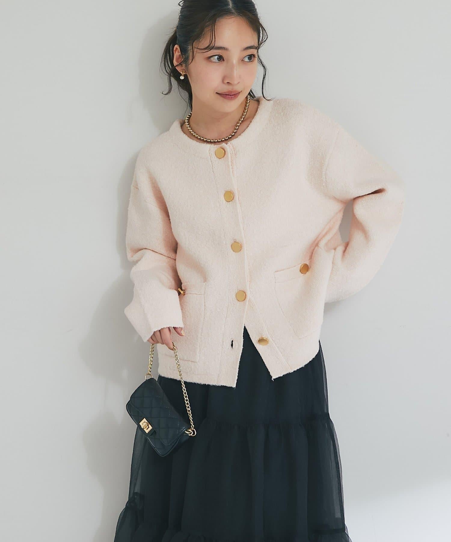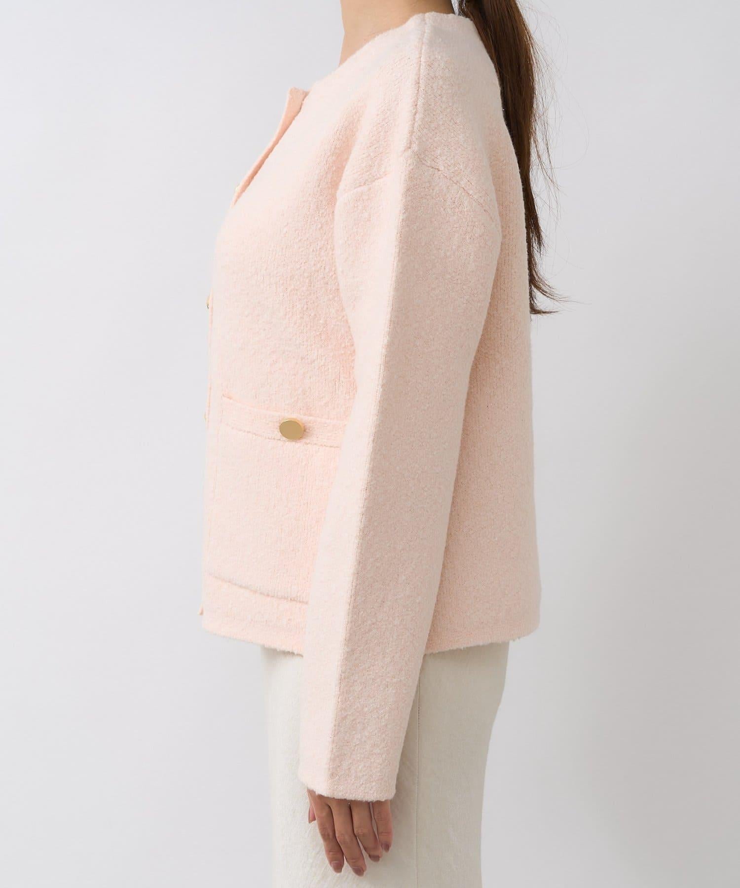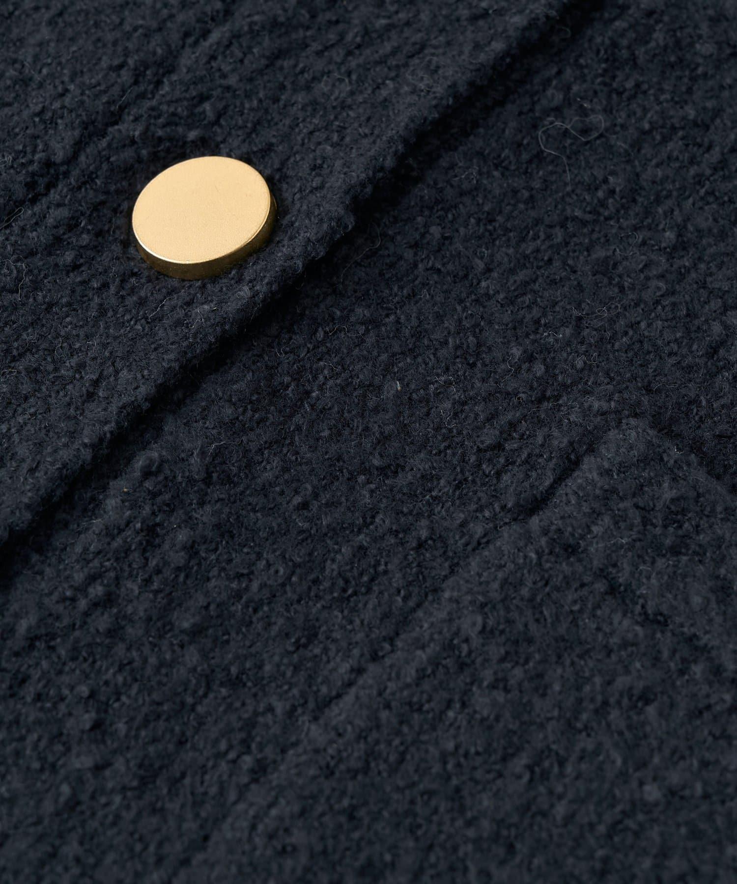 無領設計和金色紐扣給人一種高雅精緻的感覺、