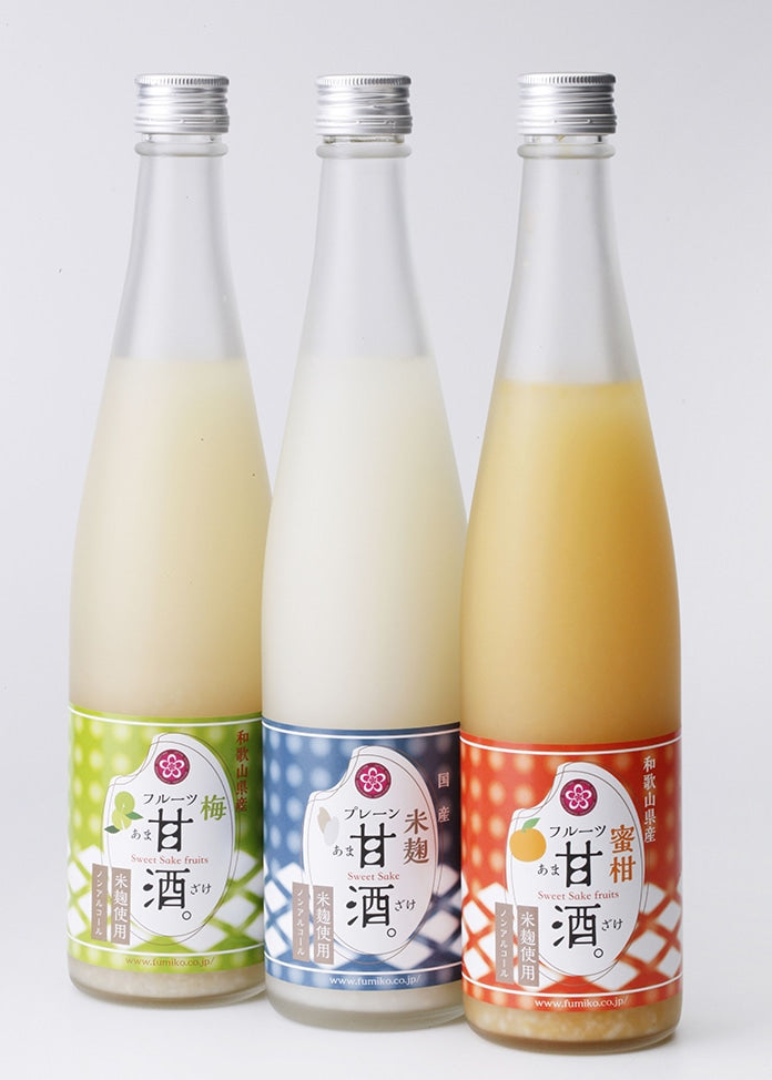 不含酒精的amazake,味道溫和,由國內大米麥芽製成。由和歌山縣的安州柑橘和南科李子的汁液製成的果味天麻酒套裝。
