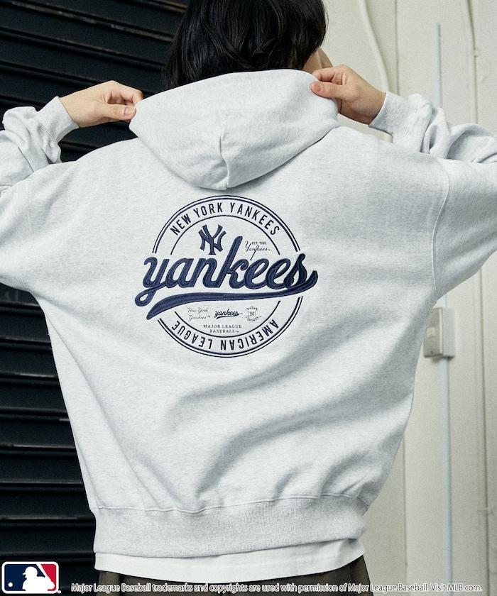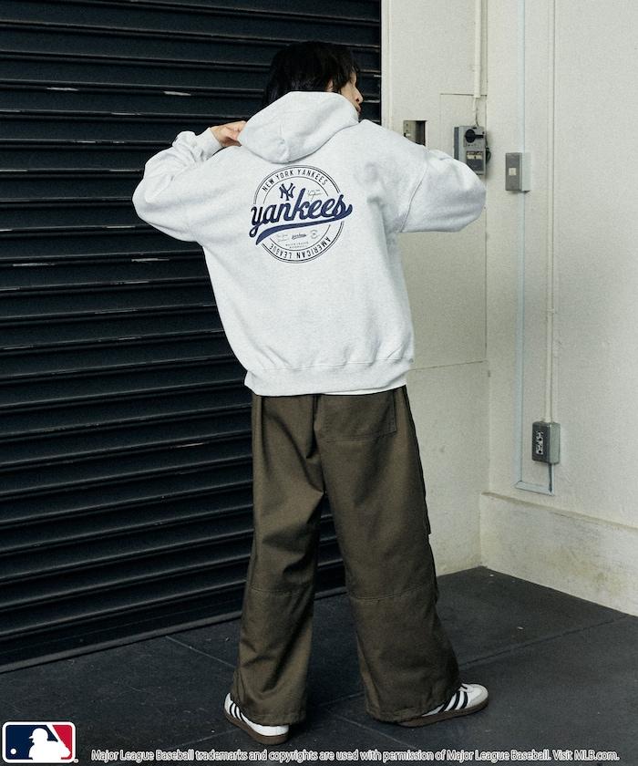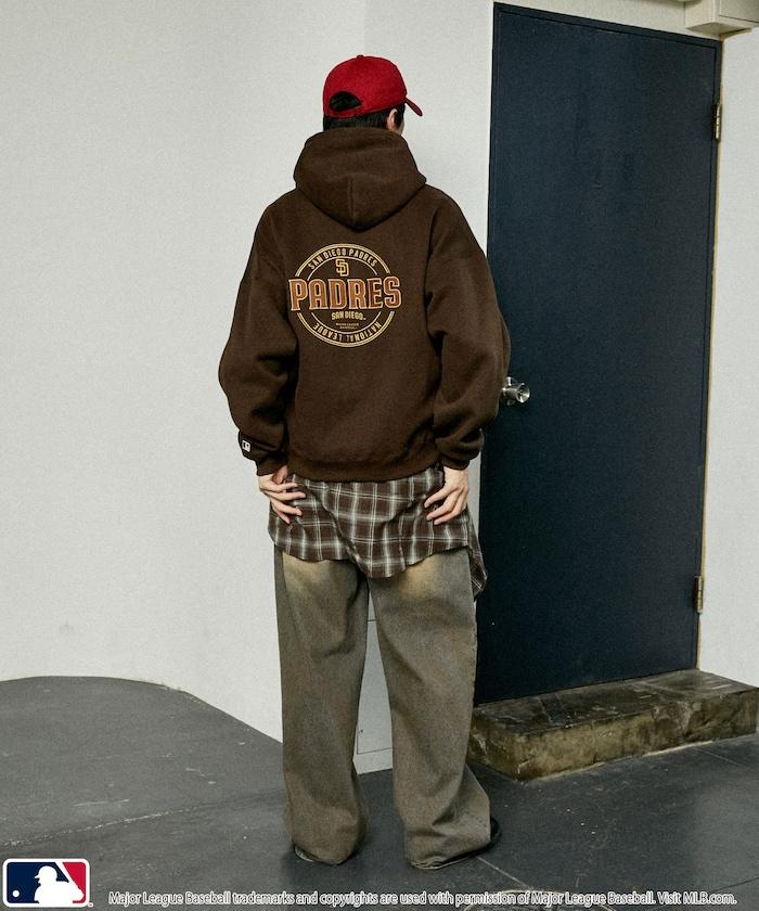 一款引人注目的連帽衫,背面印有 MLB 特別定製的醒目圖案。