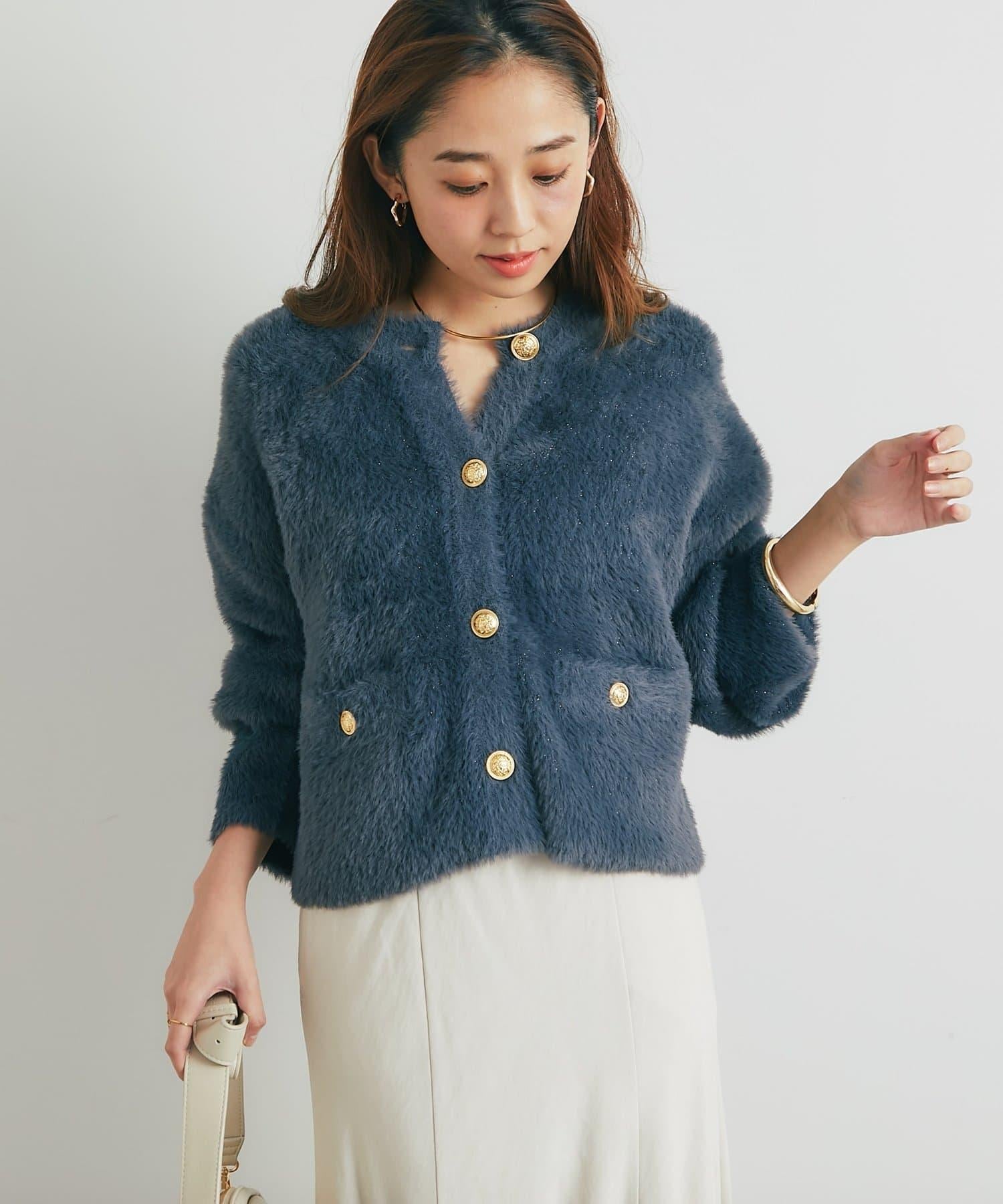 表情豐富優雅針織面料亮絲長毛金色紐扣開衫