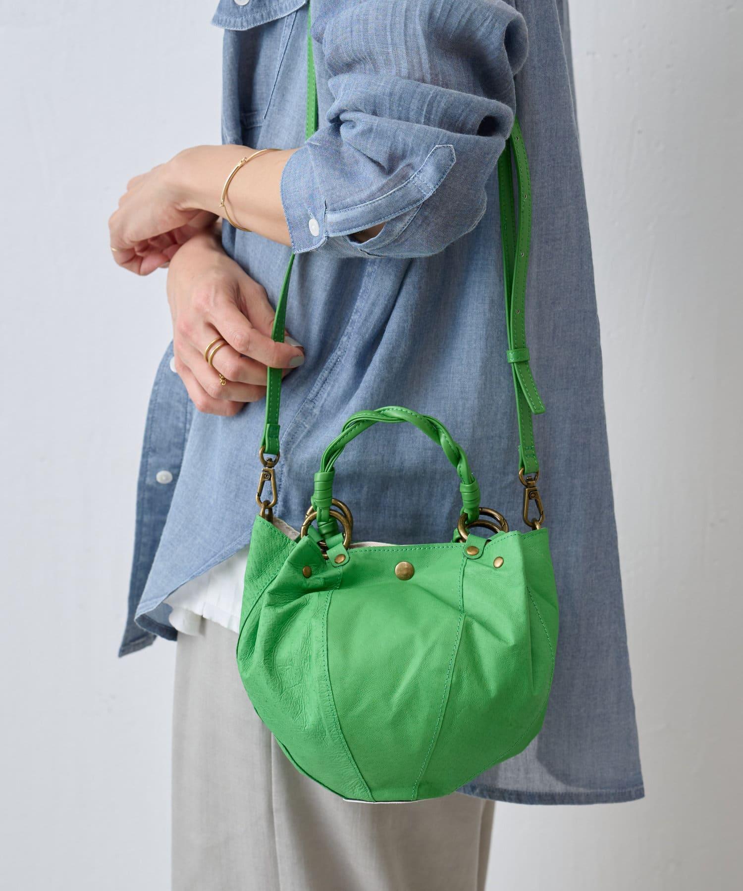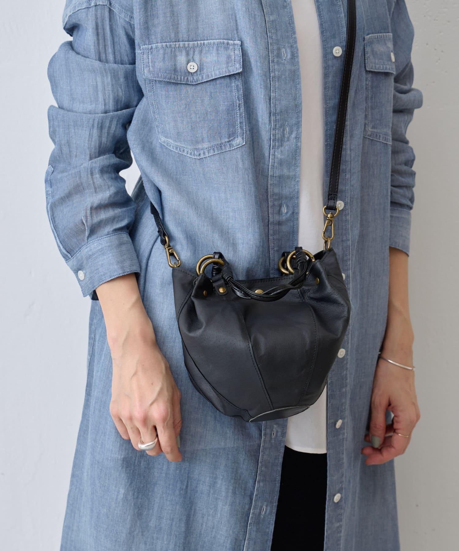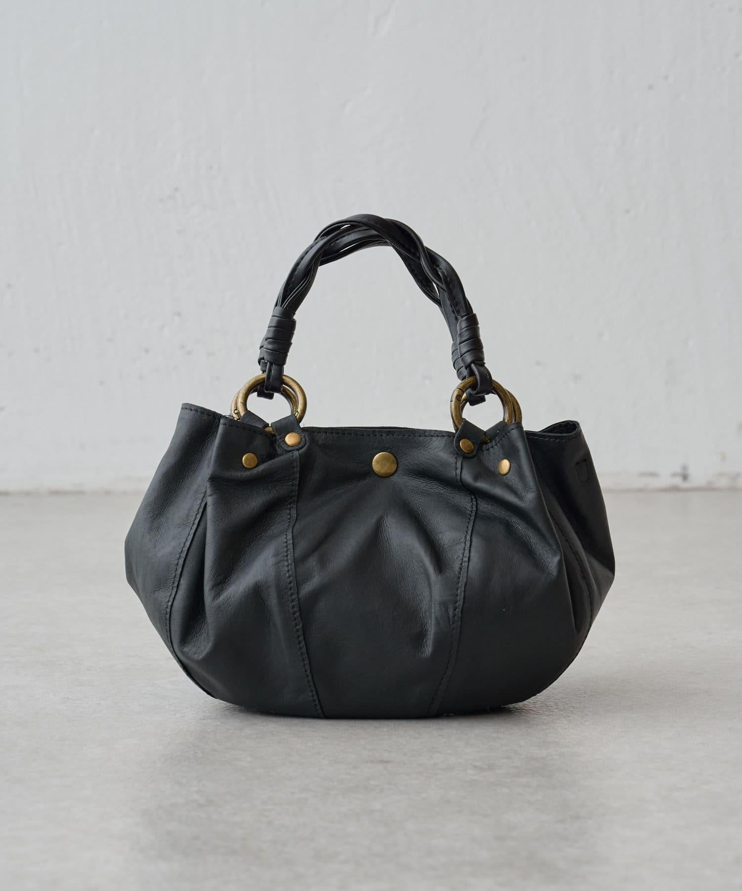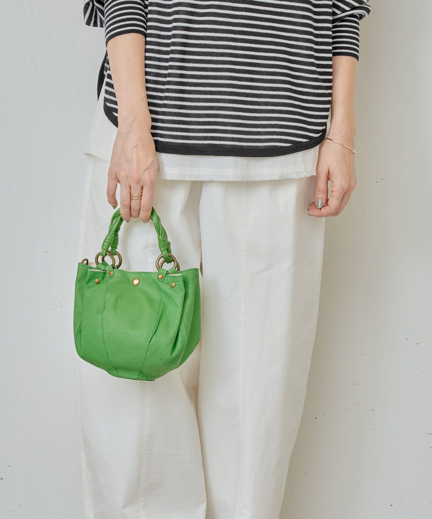 這款手袋的細節設計包括兩個扭曲的皮革手柄和圓形輪廓。