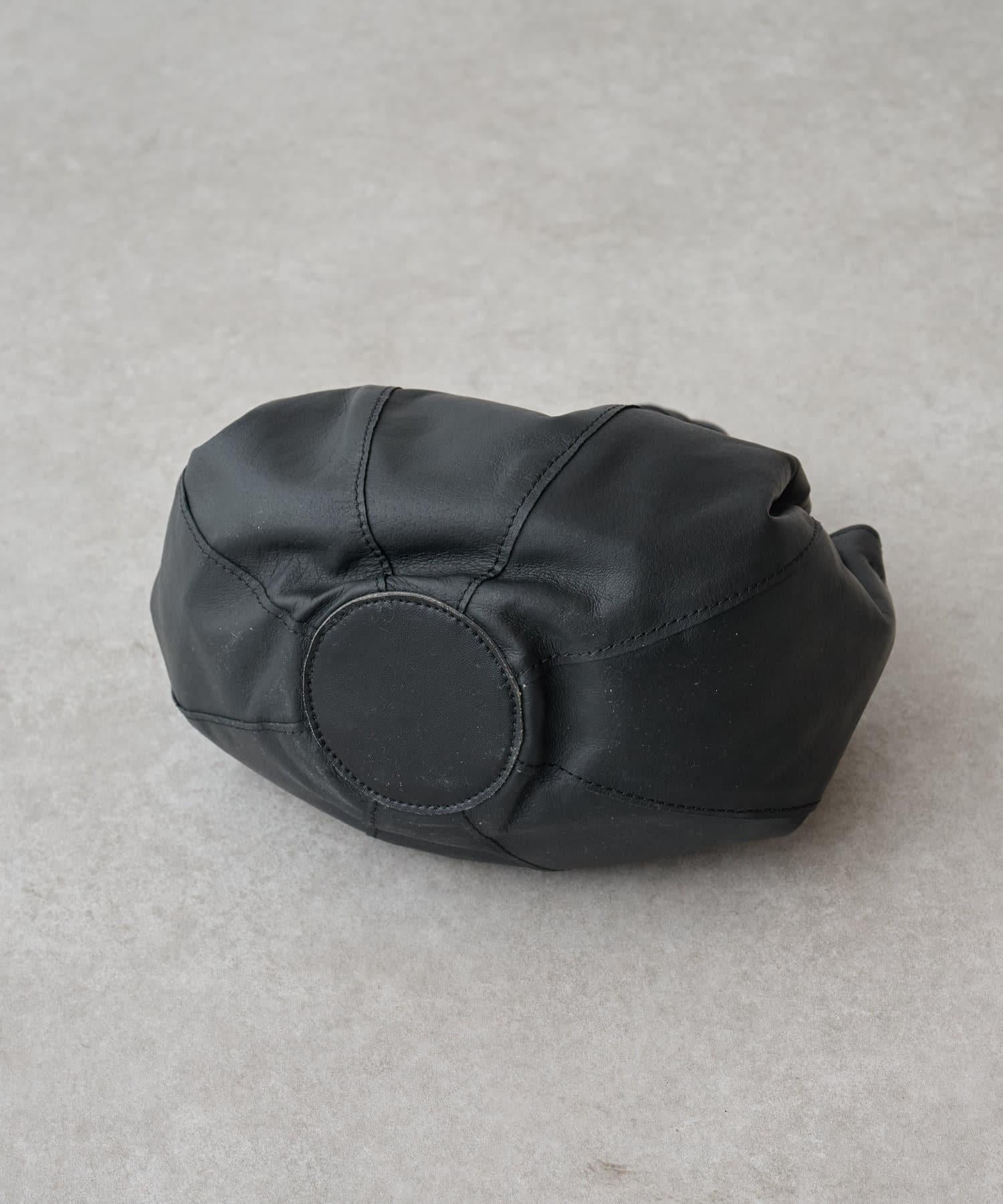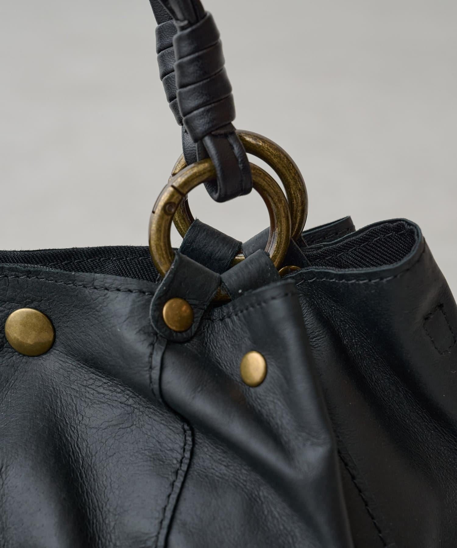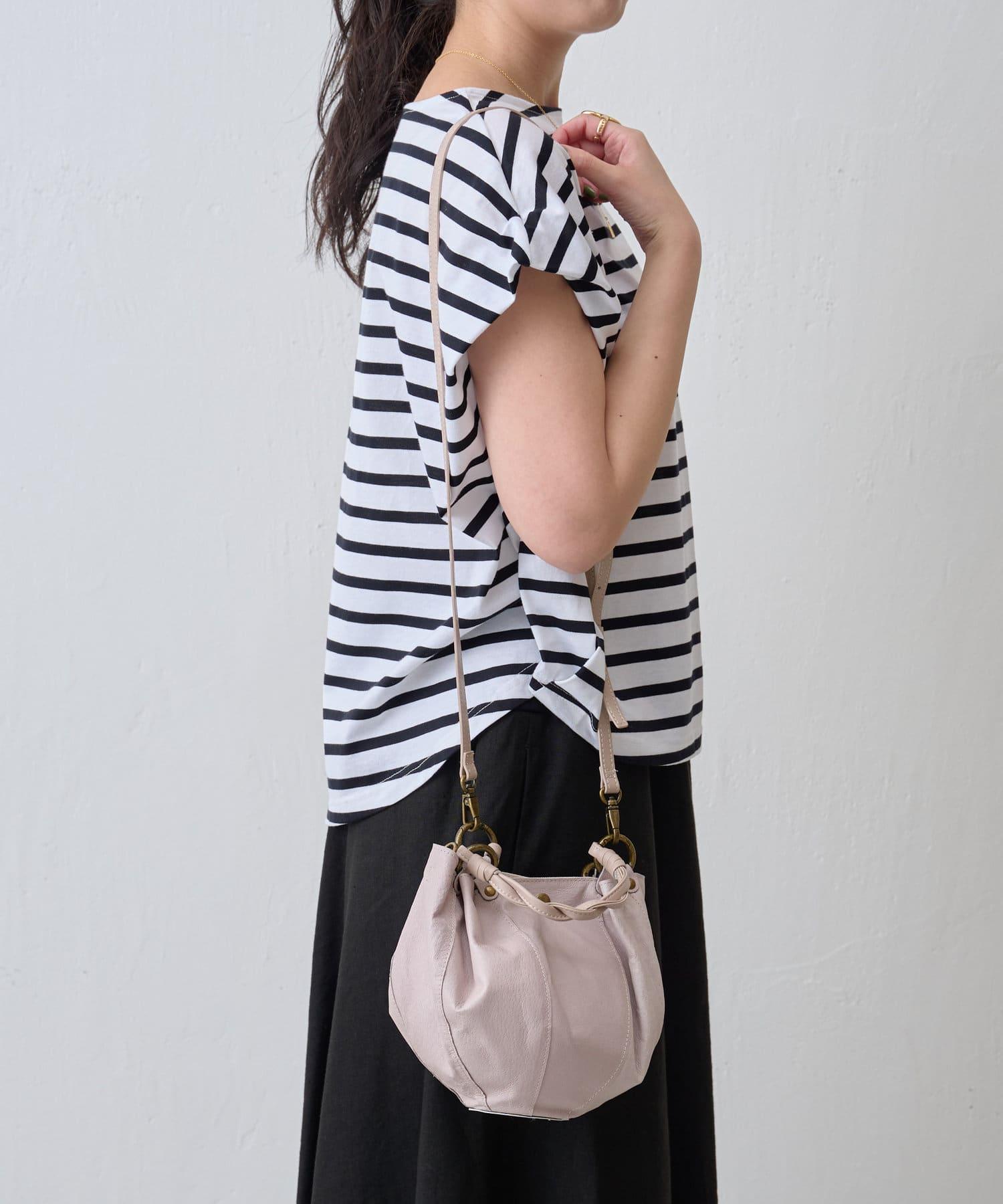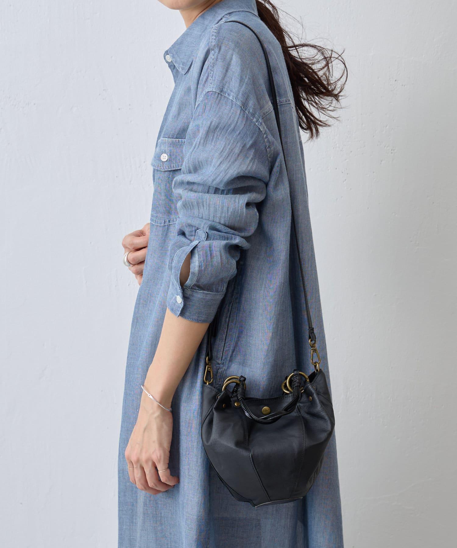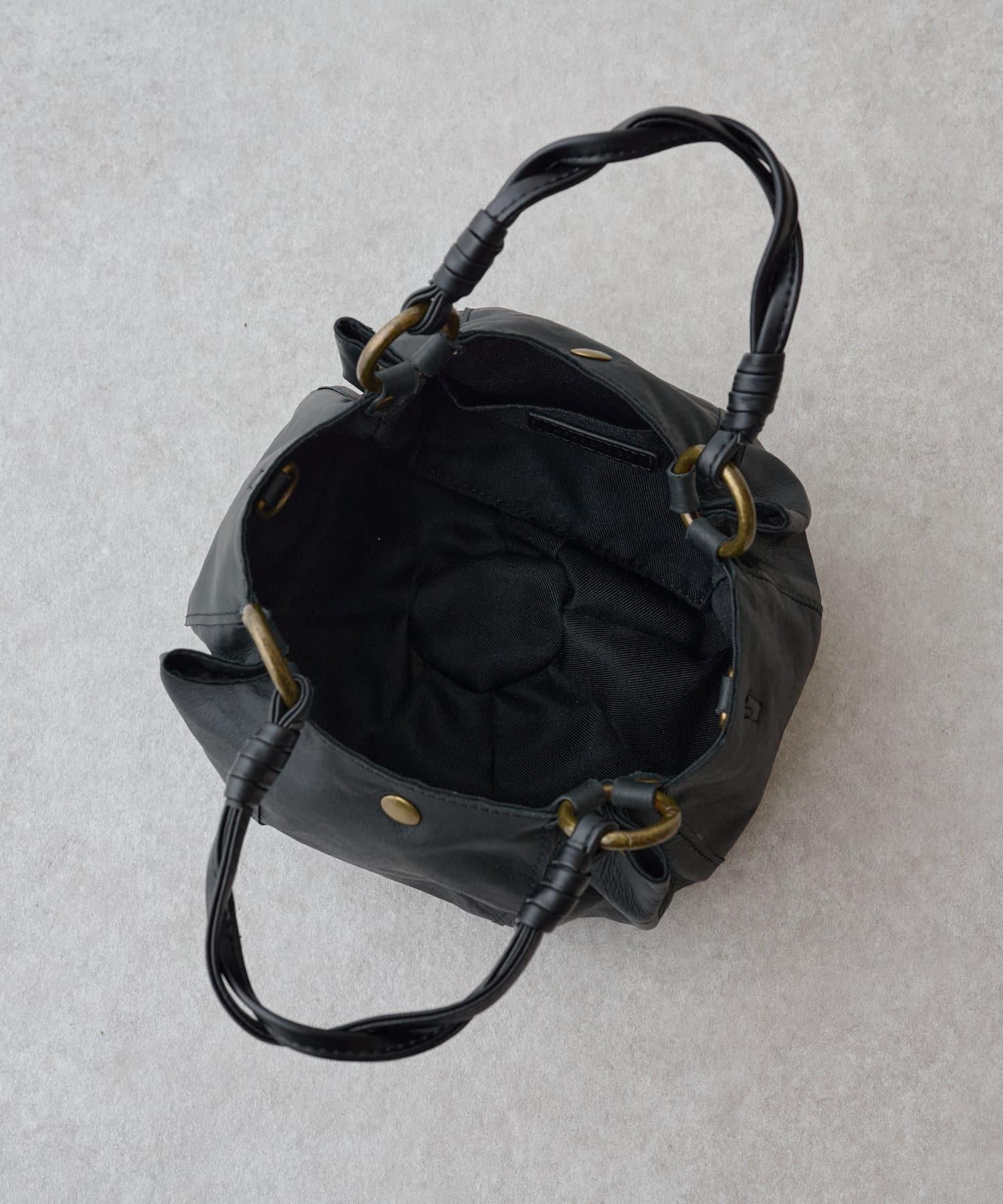這款手袋的細節設計包括兩個扭曲的皮革手柄和圓形輪廓。