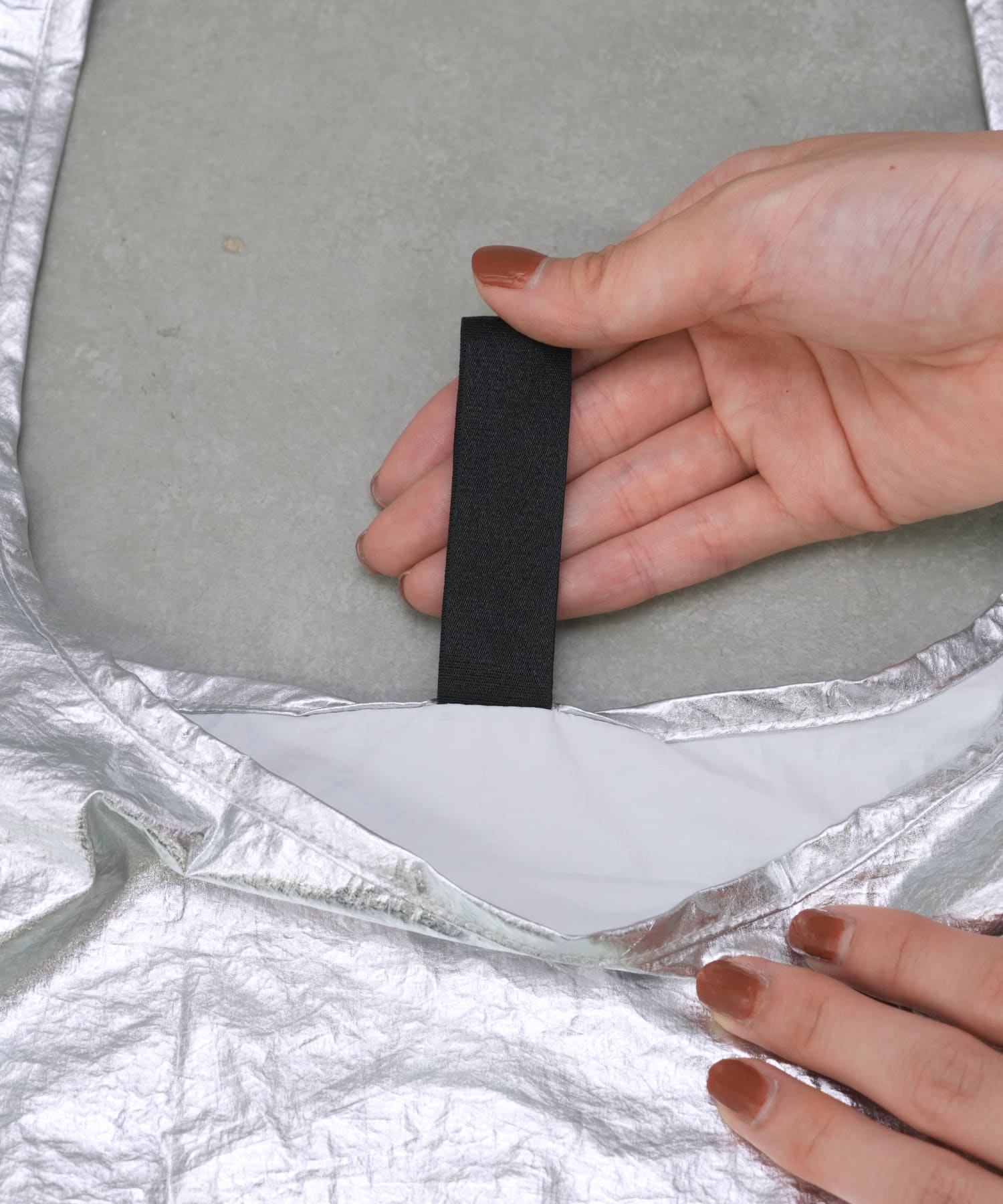 在手提包的口子上有一條鬆緊帶,使其保持緊湊。
