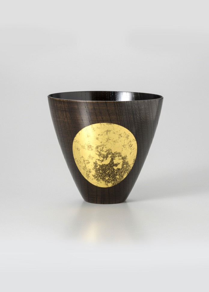 金澤鋁箔Oborozuki杯(小)這款餐具的設計不僅僅是為了美,也是為了在現代生活環境中使用,有一種溫暖而清爽的感覺。木材的紋理被利用起來,通過添加 "金箔 "oborozuki,使木材的紋理成為一道風景,從而創造出一種美麗的餐具。這個容器是工藝組合的結果。木頭由熟練的木工切割成薄片,並上漆以凸顯木頭的美感,而月亮則由貼金工藝師僅用金箔就表現為天空中的風景。