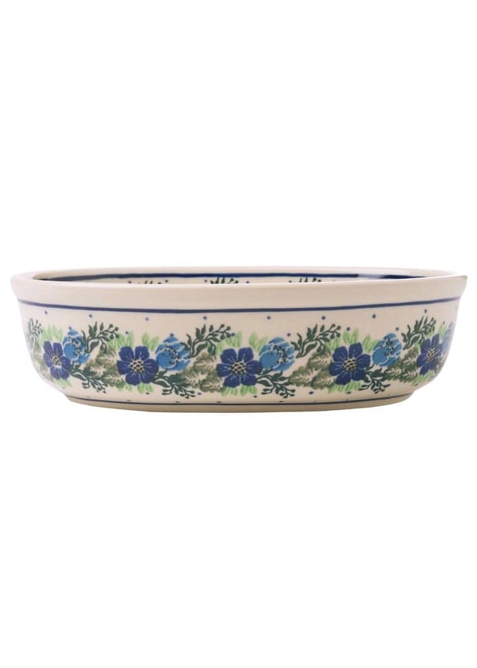 碗的形狀像一個小橢圓。如果你有的話,是一件很有用的東西,無論是用於烤箱烹飪還是作為咖喱或意大利麵的盤子。 該設計來自Pieni系列,其特點是罌粟花和銀蓮花等春天的花朵組成的花環。有一個藍色配色的版本和一個紅色和藍色配色的版本。設計簡單,但讓人聯想到波蘭的春天。