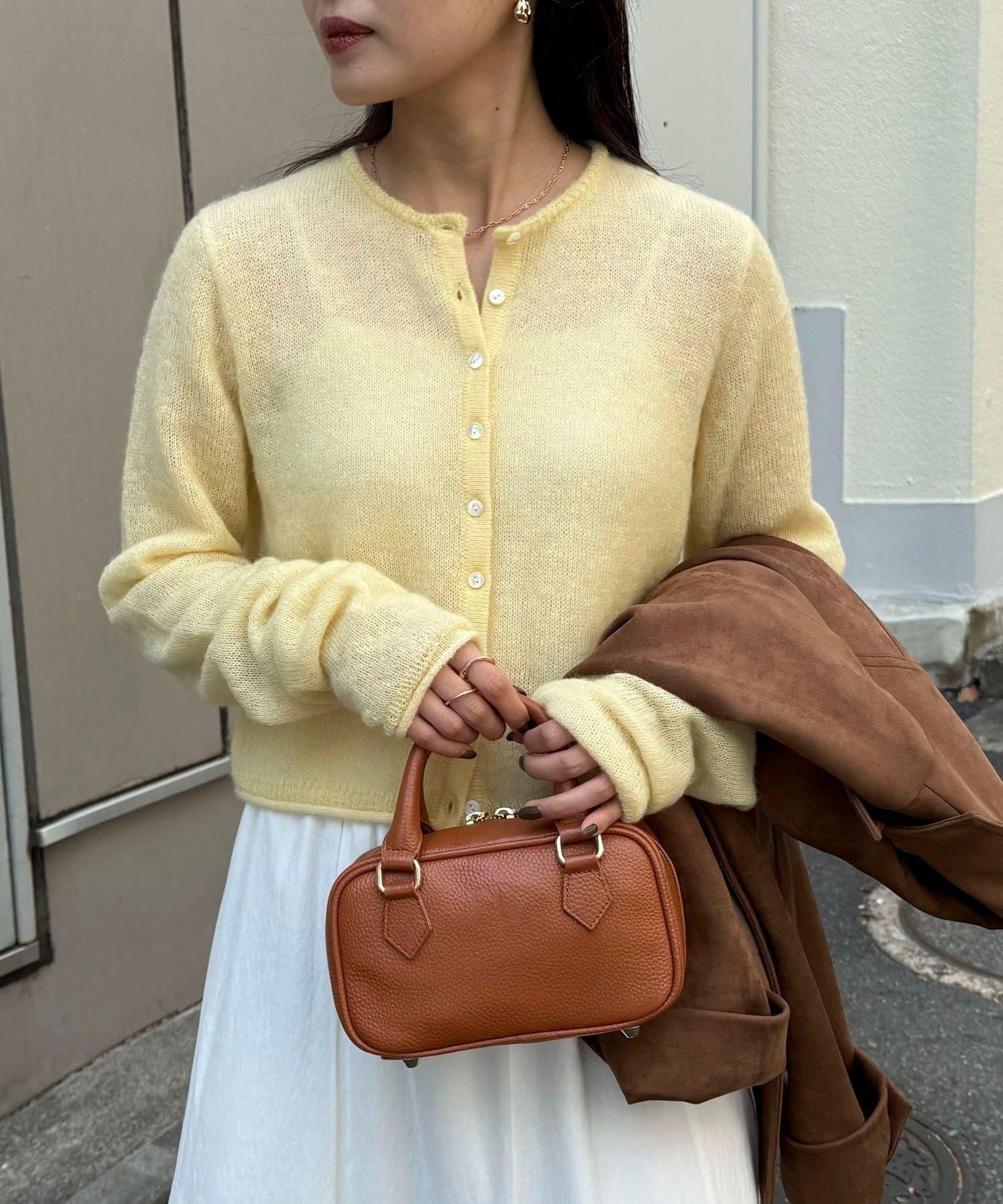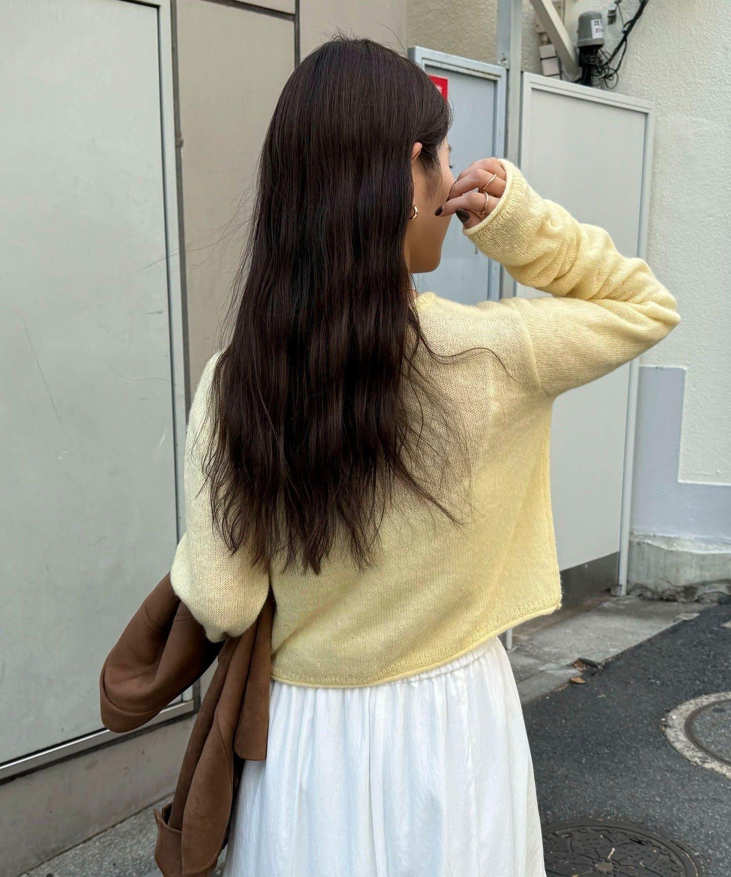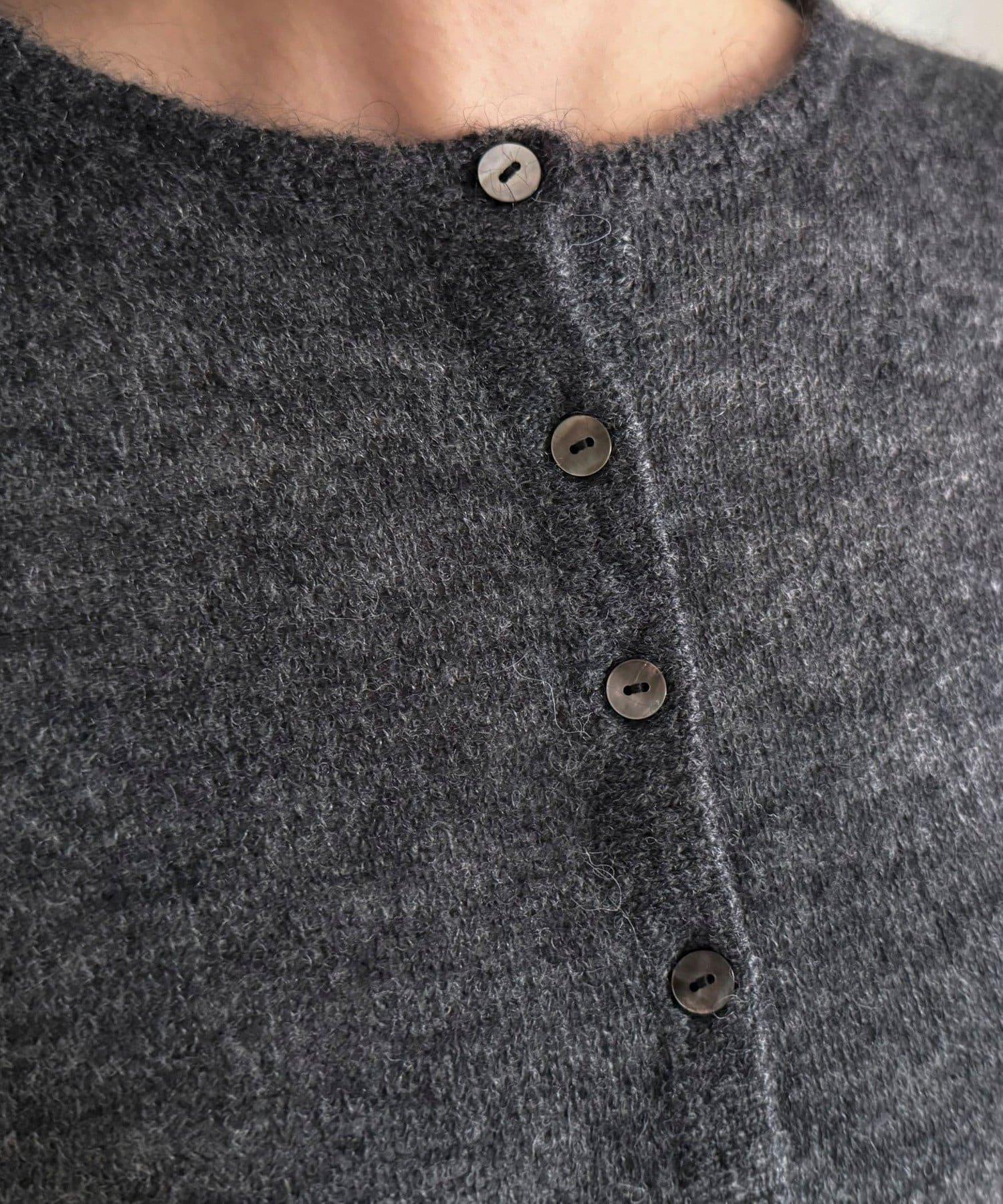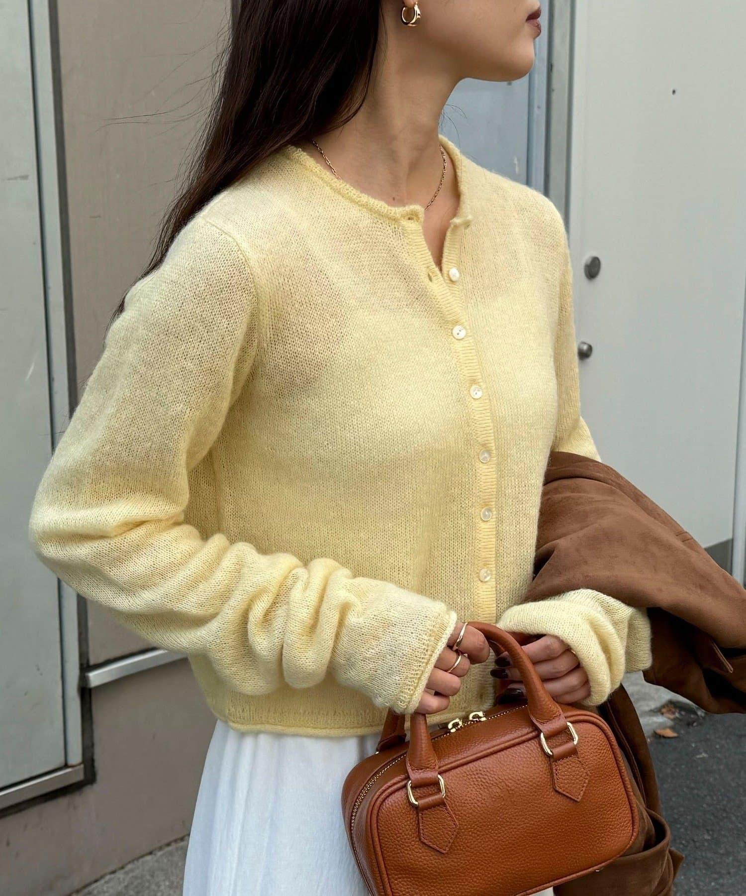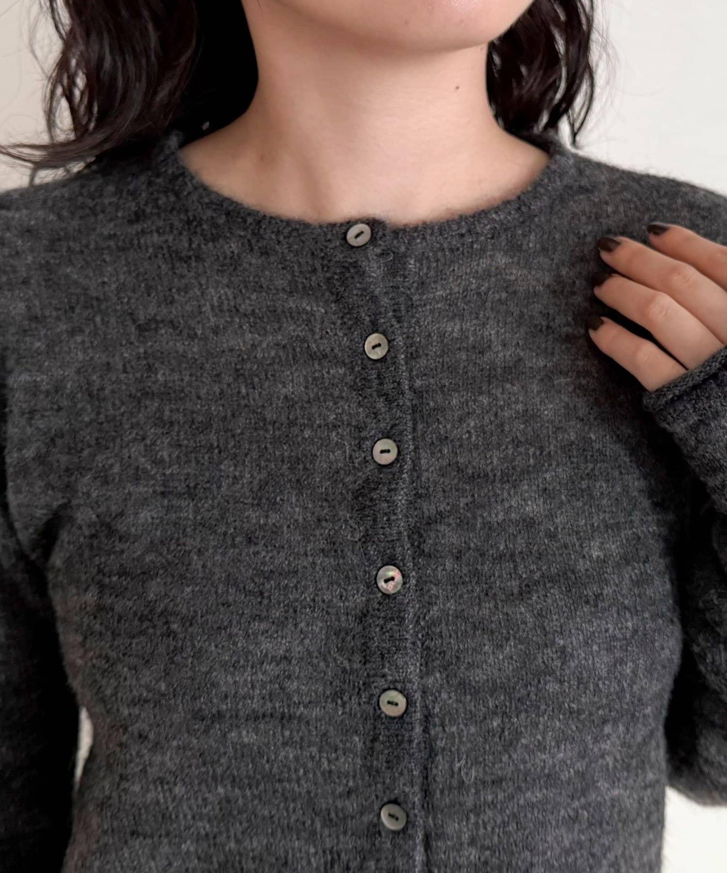 這款開衫採用馬海毛混紡面料特有的蓬鬆材質。
