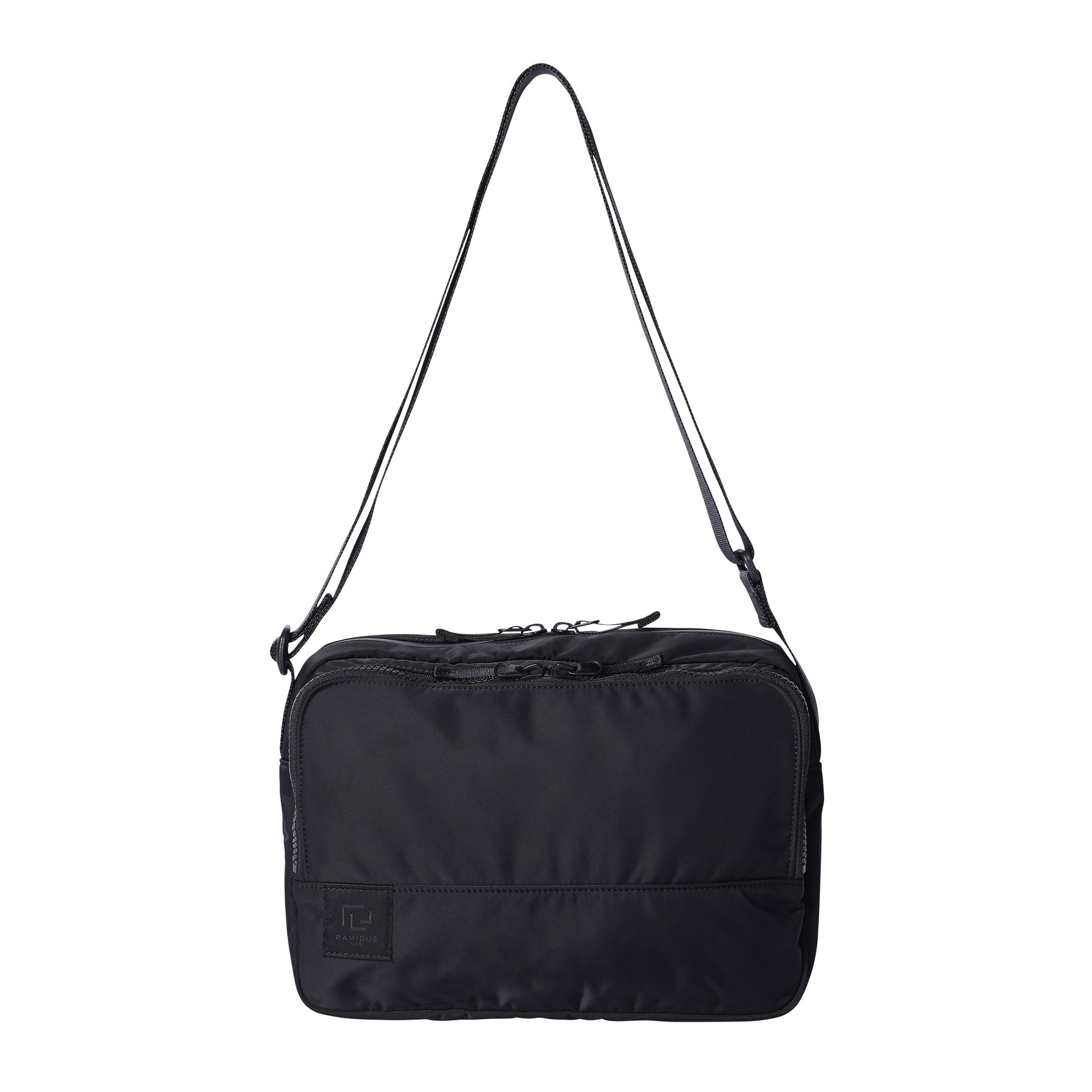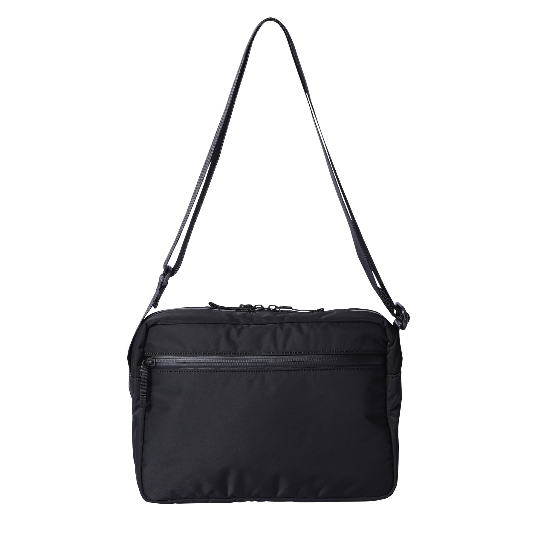 方形輪廓單肩包,可容納一個 500 毫升塑料瓶和一個長錢包,橫向設計,適合在城市中使用。正面有一個大的拉鍊口袋,主隔層內部有一個軟墊平板電腦隔層。
