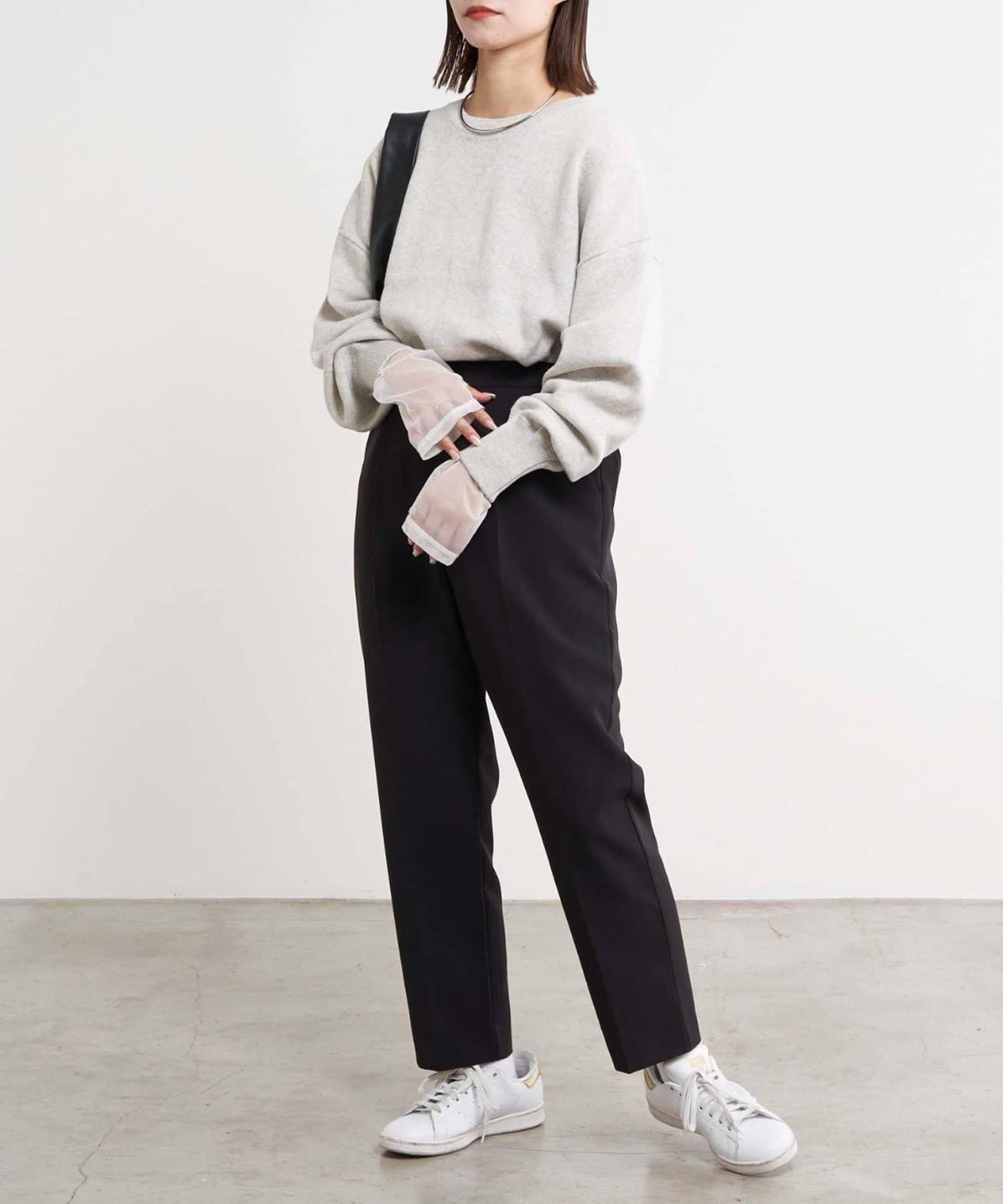 搭配迷你長褲和長筒靴,給人時尚的印象。