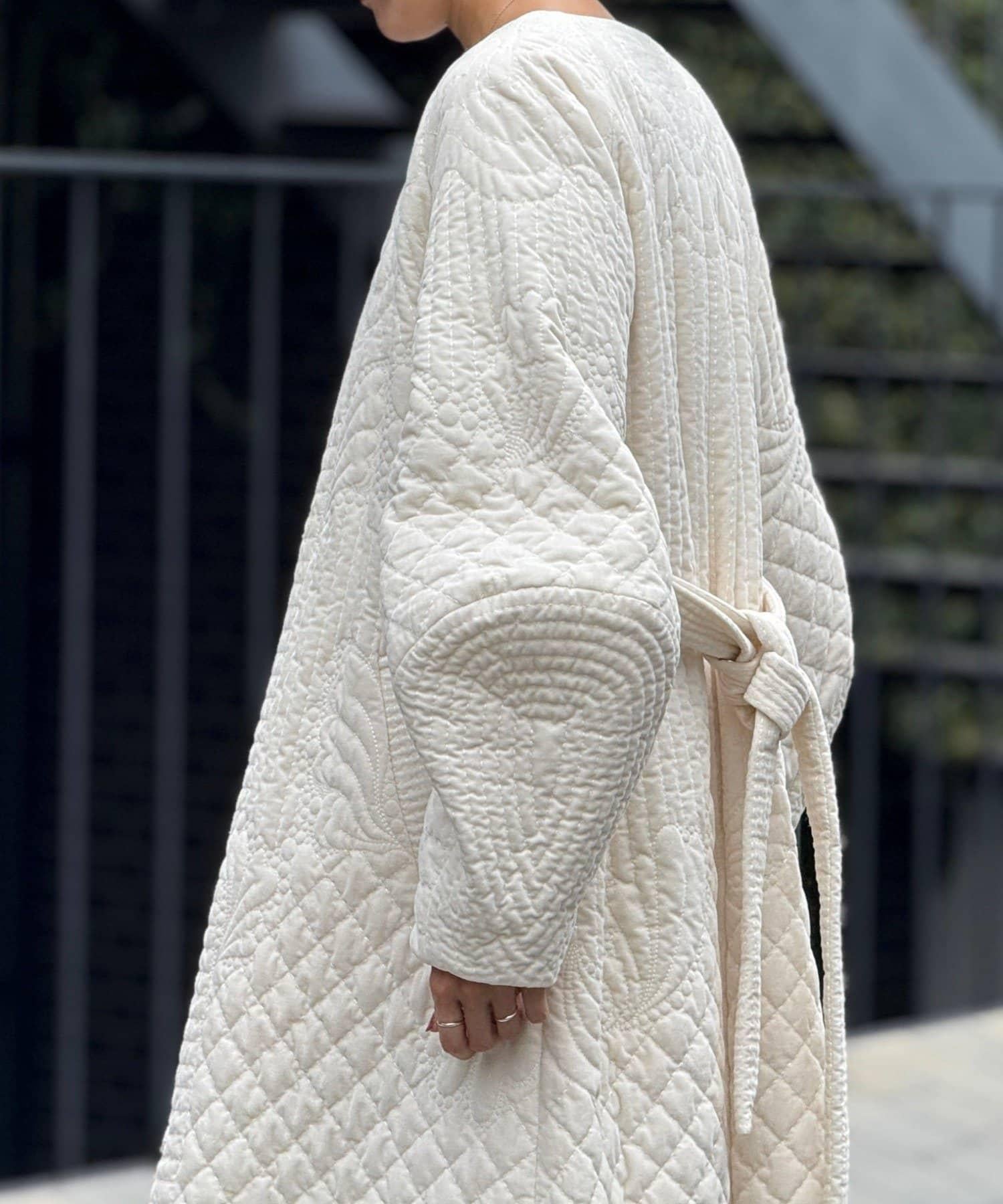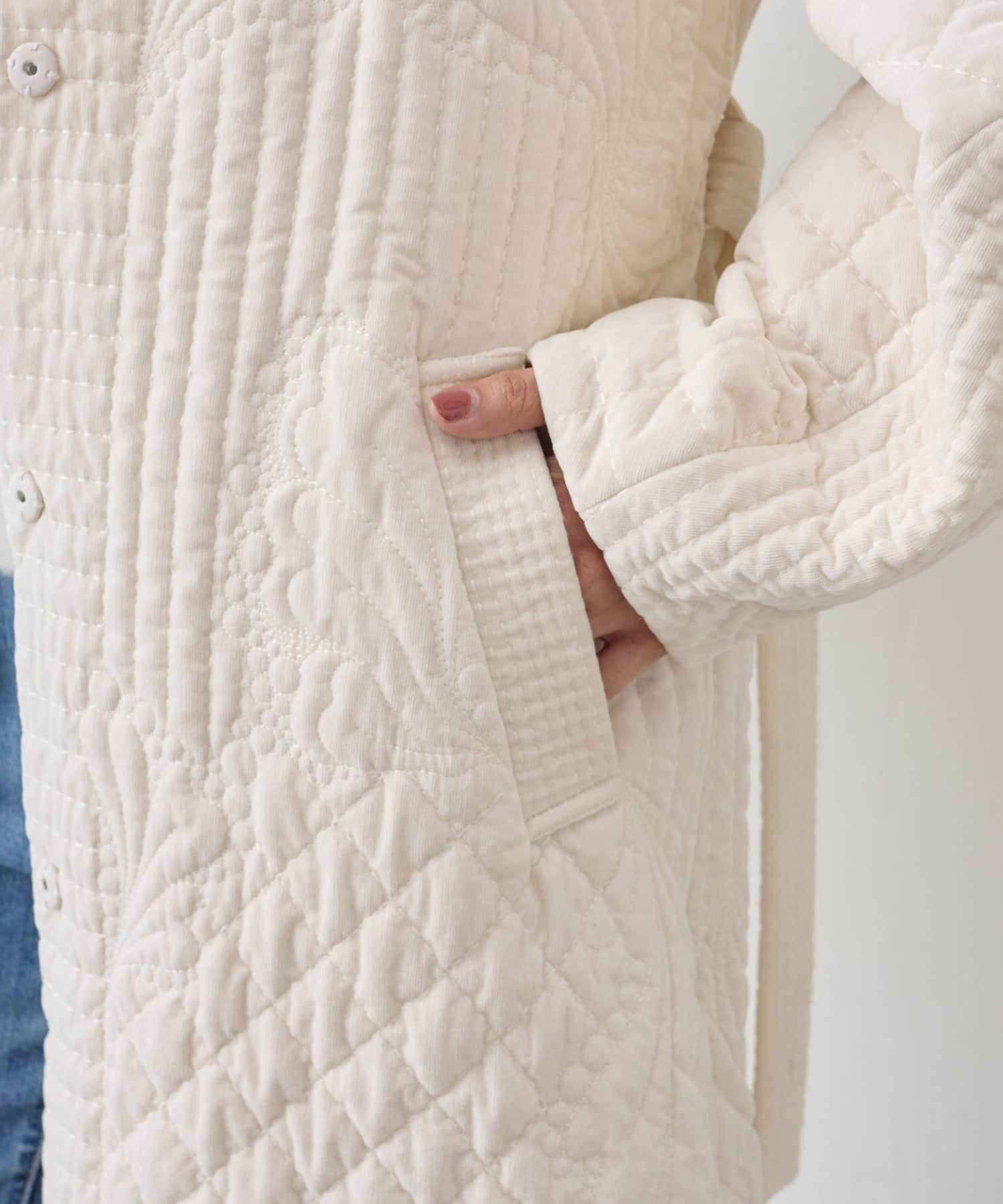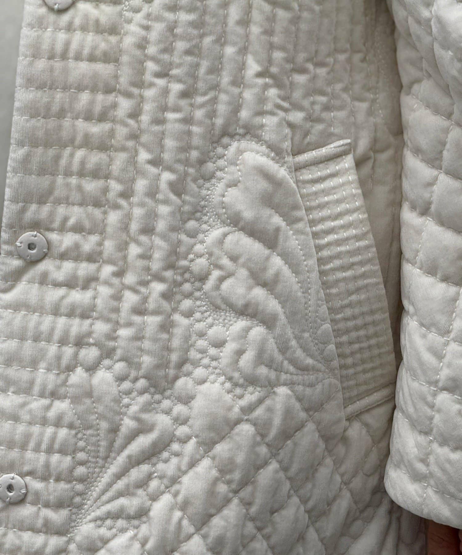 除了常見的格子圖案絎縫外,它還採用了條紋、波浪、圓形圖案等多種設計。