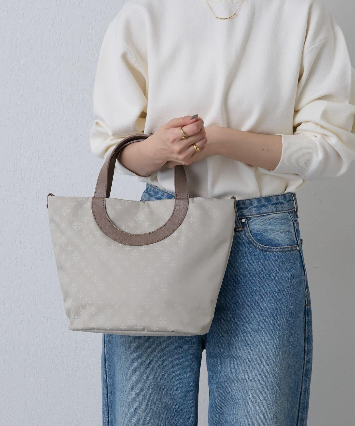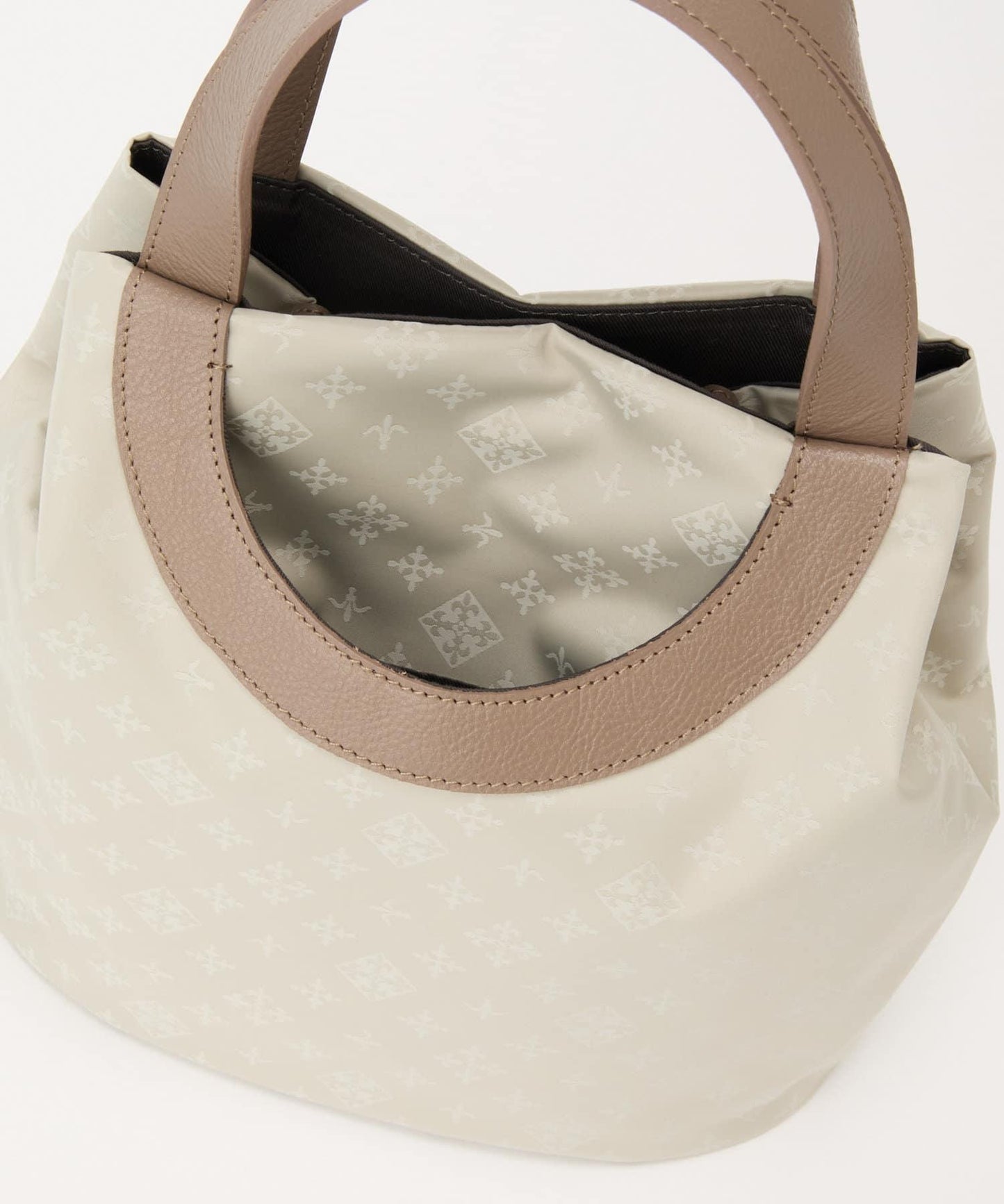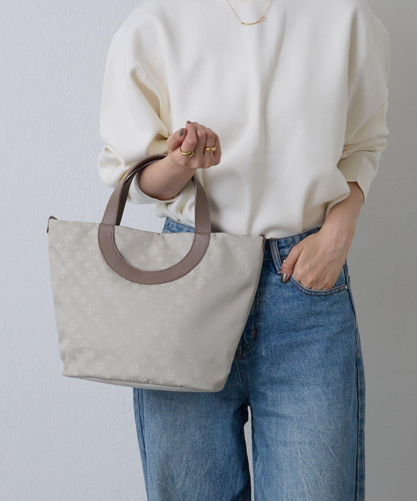 雙向手提包,圓形手柄設計。