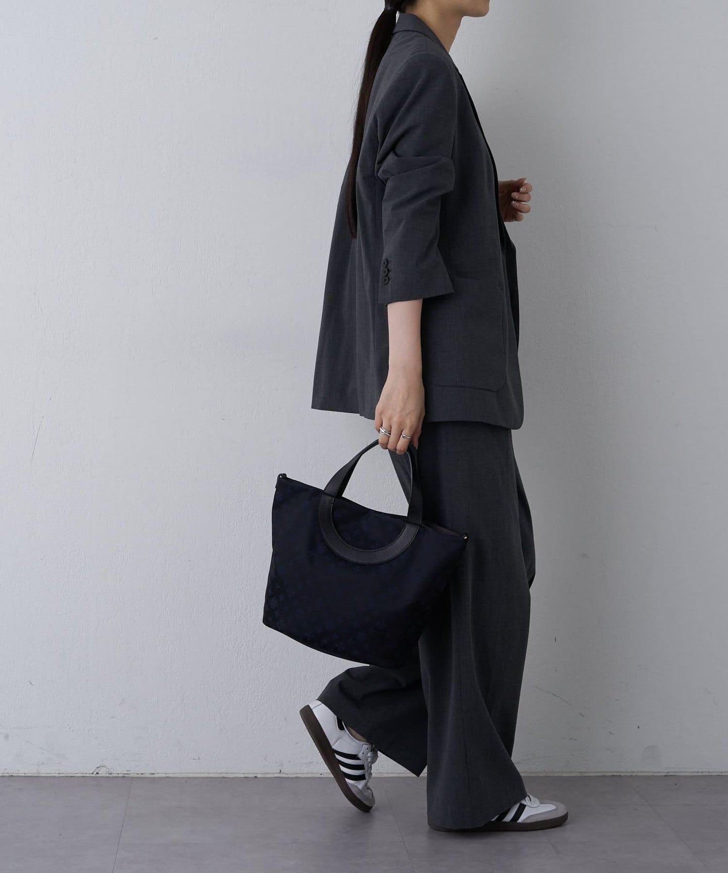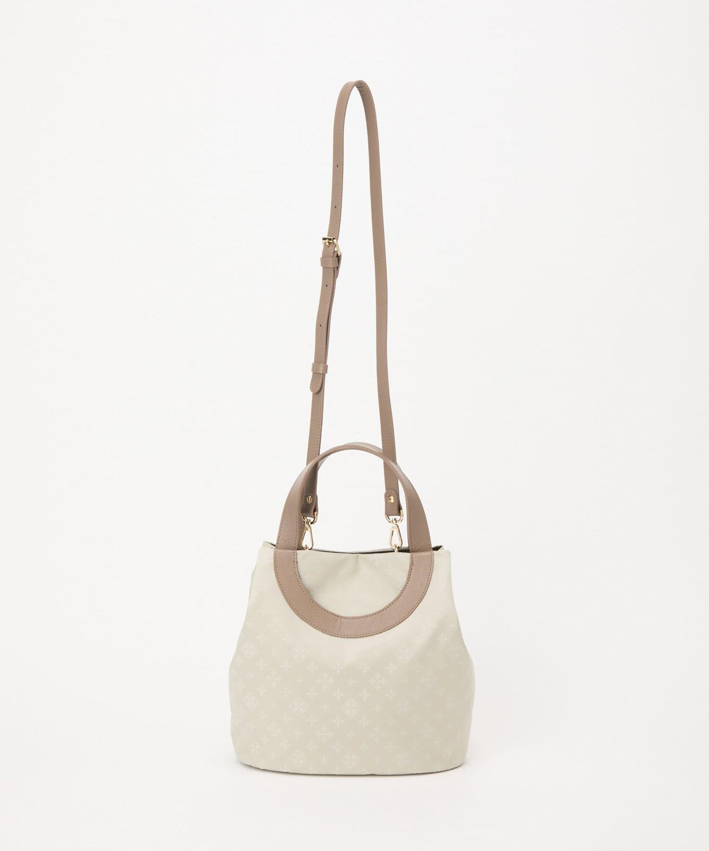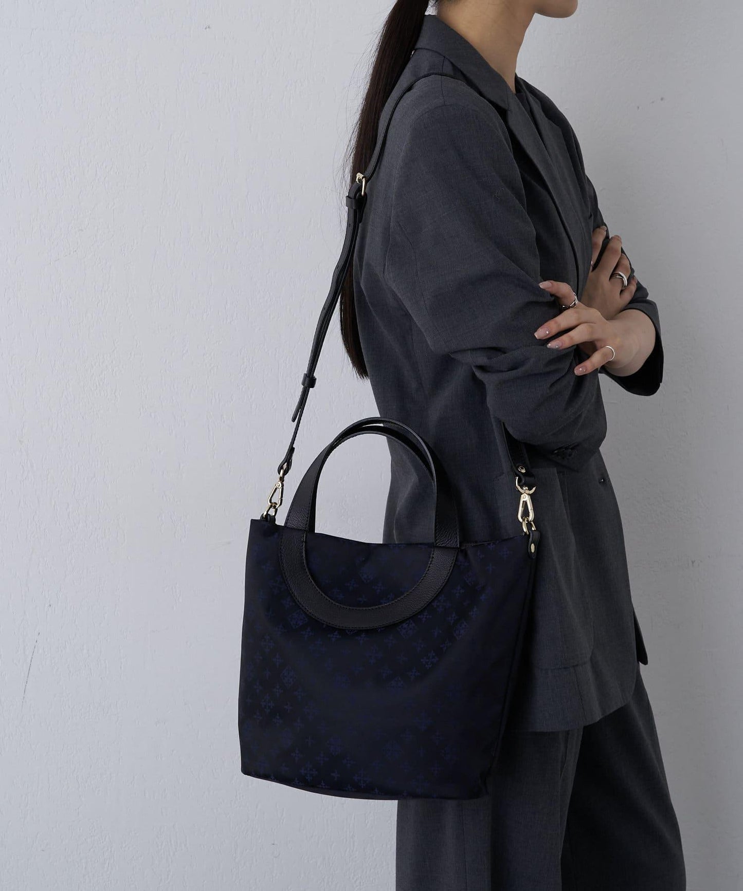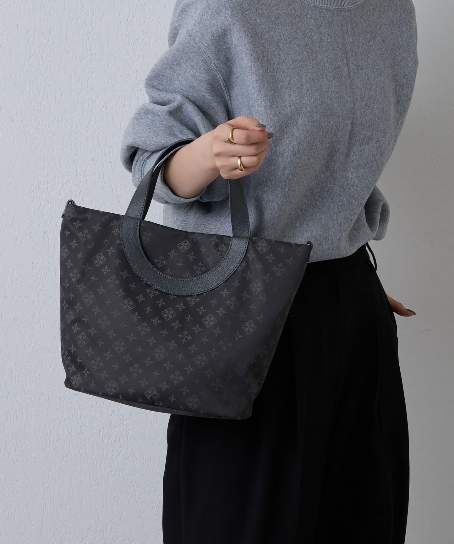 雙向手提包,圓形手柄設計。