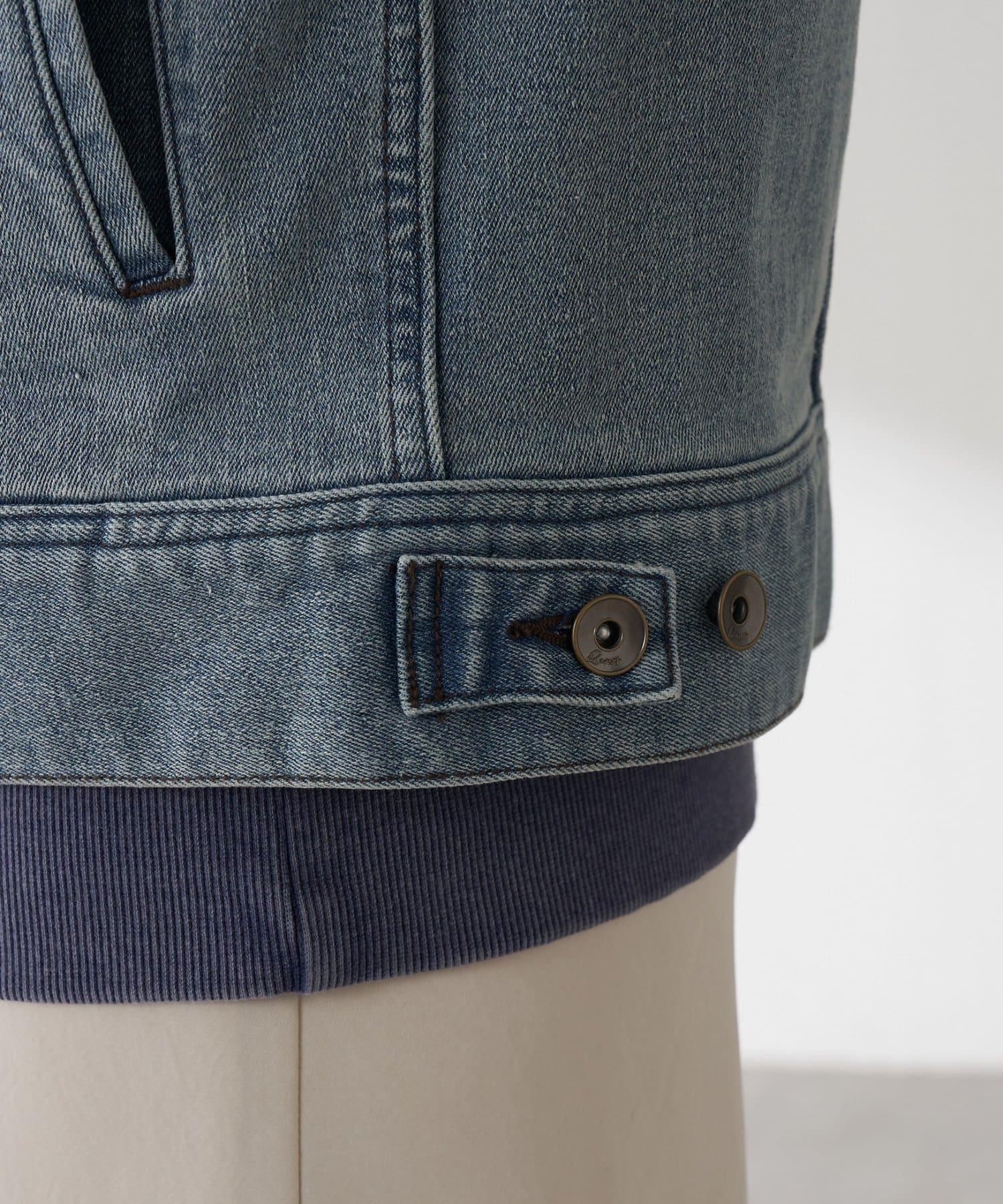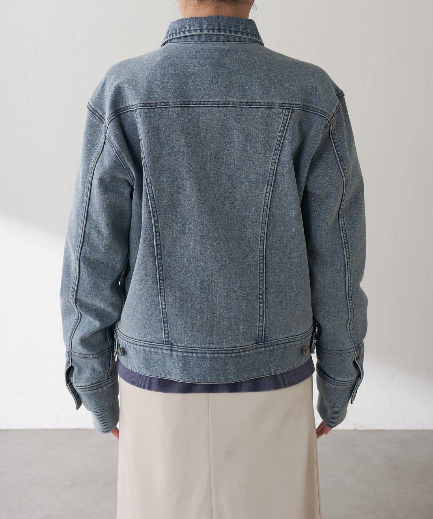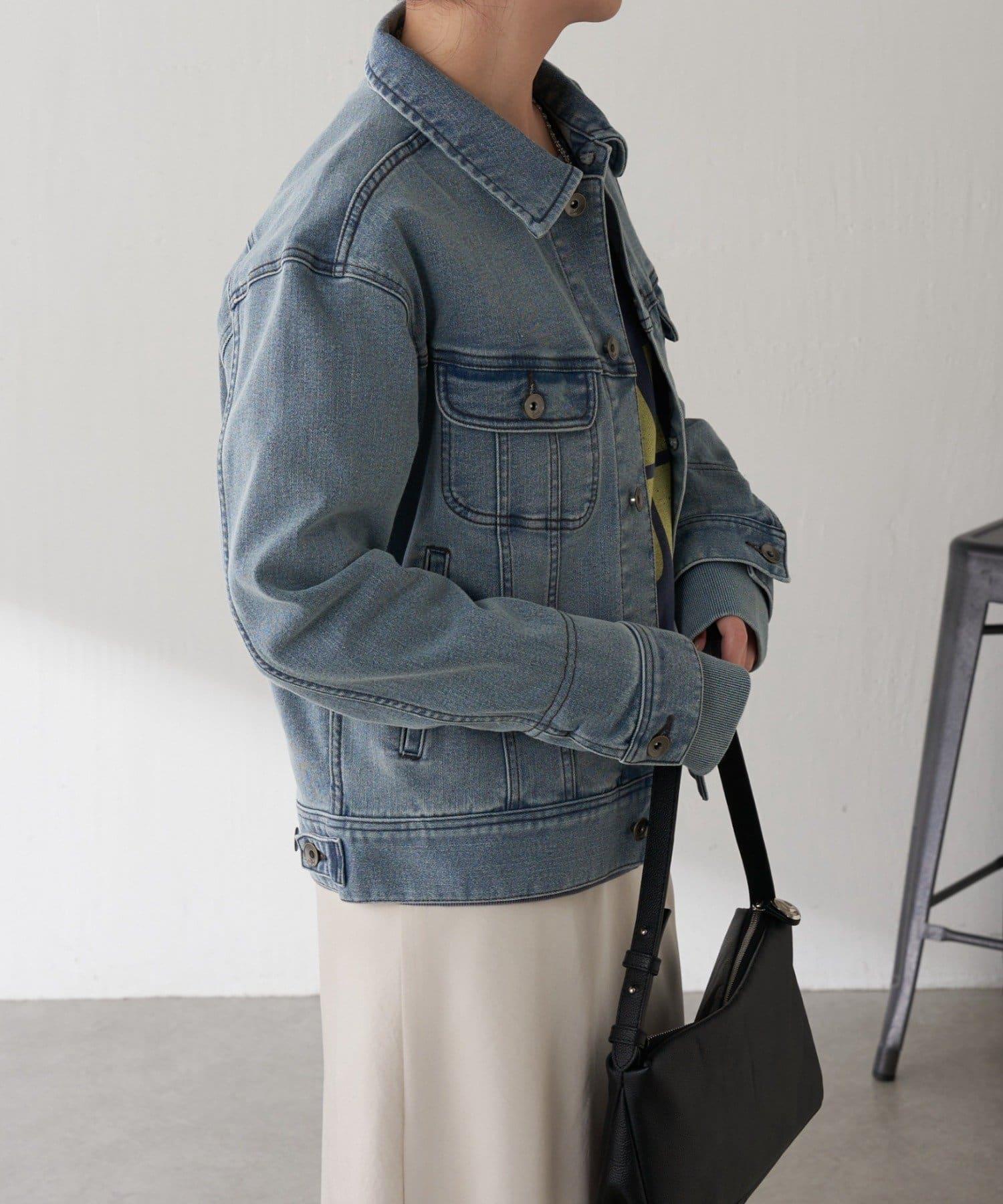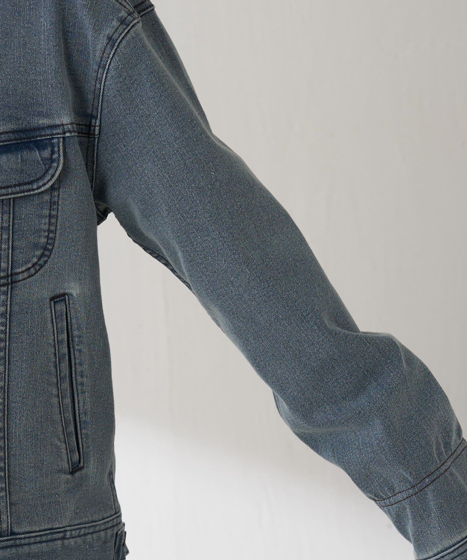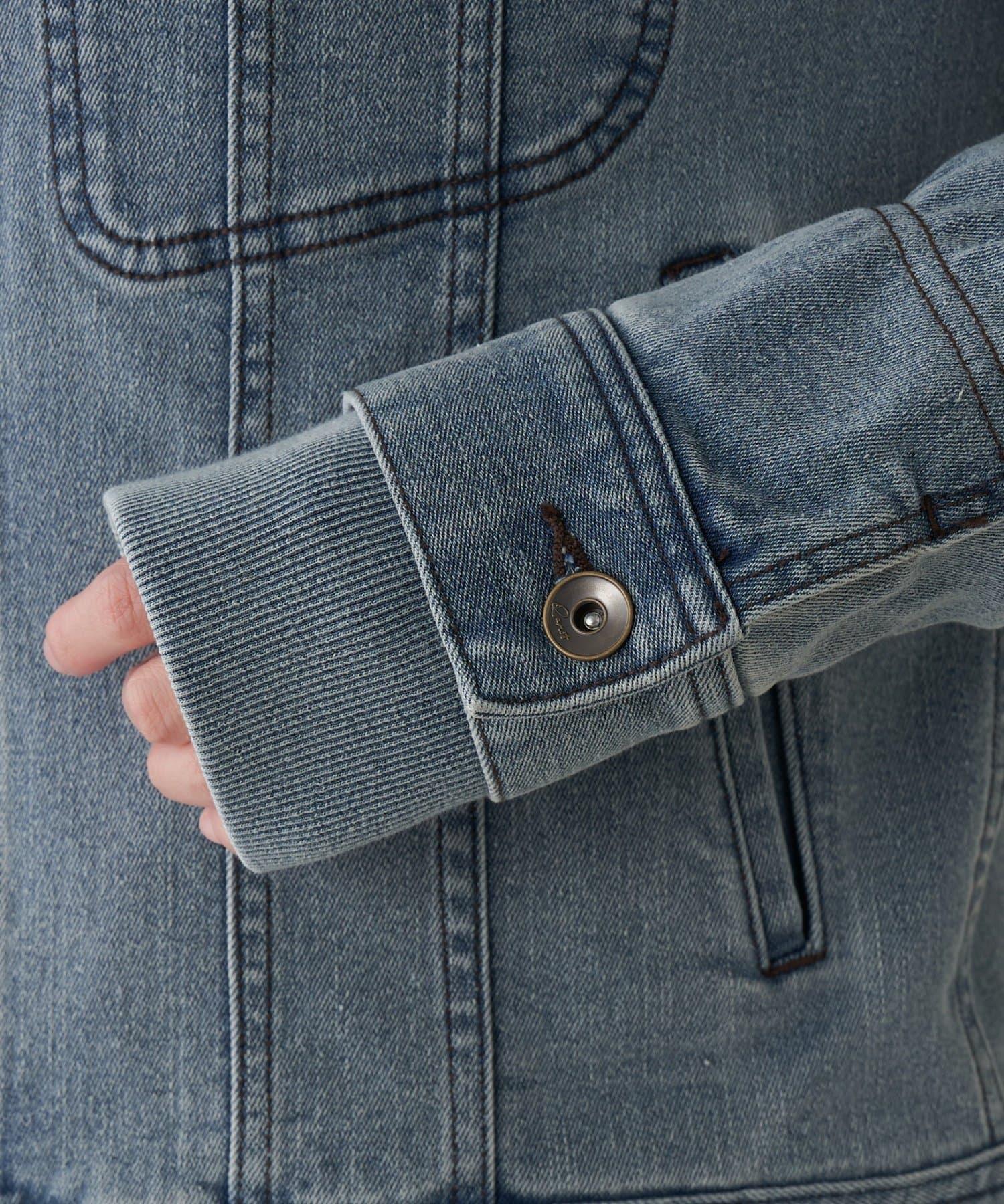 這款夾克採用彈力牛仔面料製成,袖子上有羅紋。